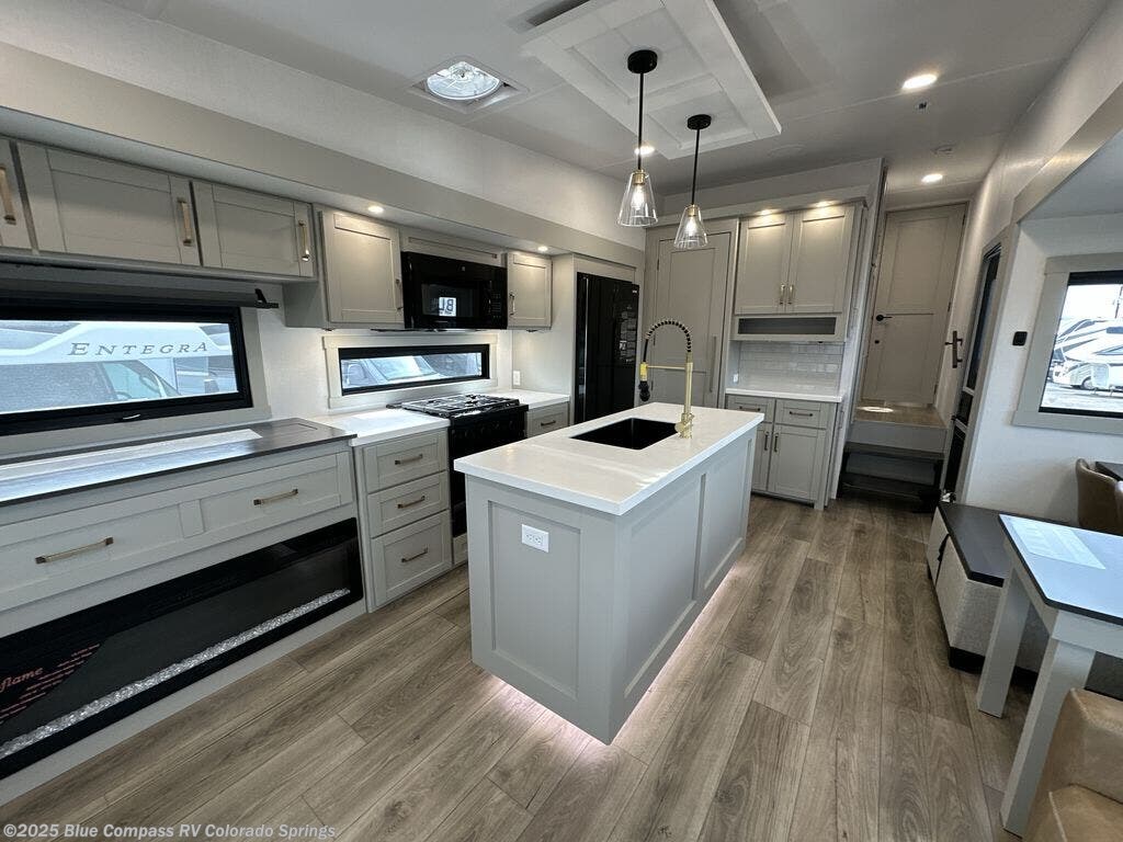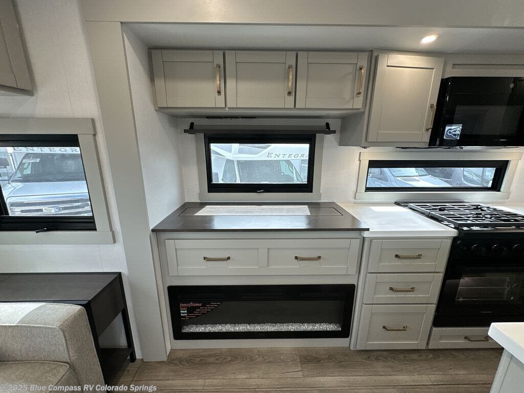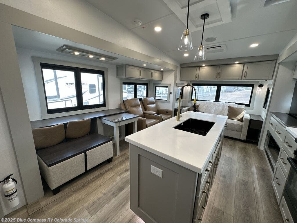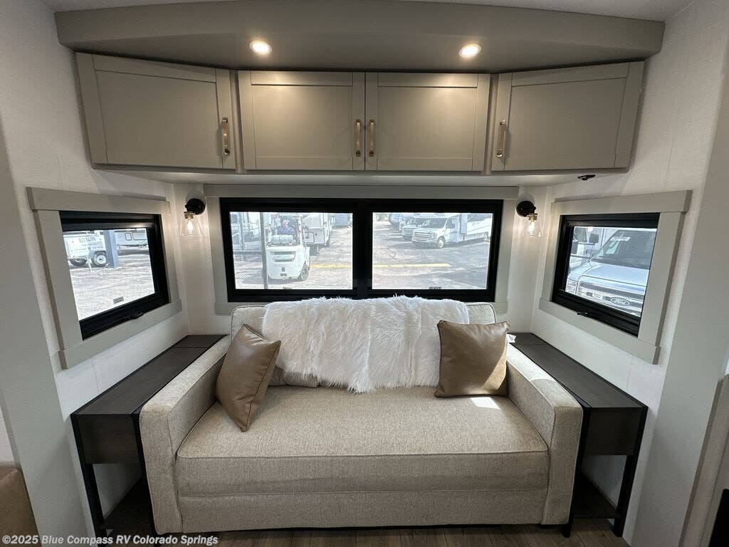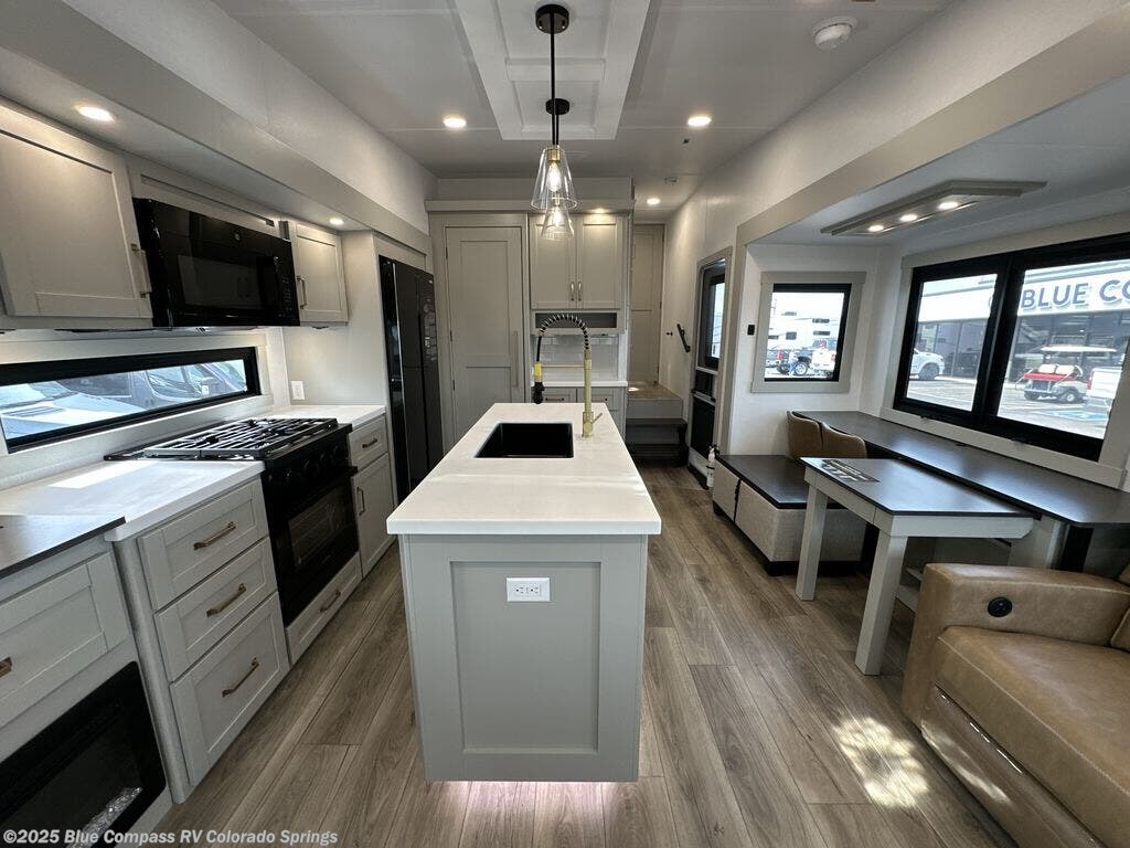 You're going to love every minute spent in this spacious fifth wheel that can sleep four. There is an inviting rear living area with a 72" tri-fold sofa and theater seating across from the televator and fireplace. The chef of your group can whip up dinner on the three burner cooktop or in the 30" residential microwave, and there is a 16 cu. ft. refrigerator that even opens when with the slide out is in. You will also enjoy the kitchen island with a farmhouse sink and roller cover, dual trash bins with a Stow N' Go paper towel holder, plus convenient dog bowls for your furry friends. You can store all your paper goods and snacks in the 84" pantry with adjustable shelving, and there is a hutch for nice dishes plus shoe storage in this model as well. Head to the front master bedroom where you'll find a queen bed with a TV, a large slide out with a wardrobe with drawers, plus a spacious bath.