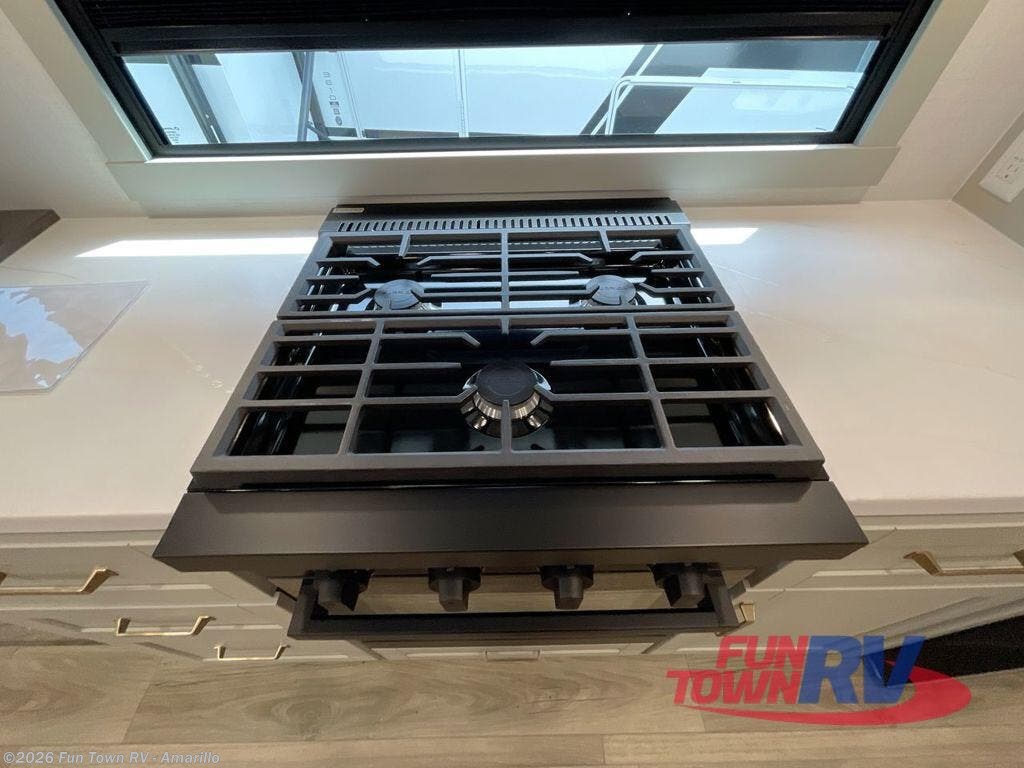 You're going to love every minute spent in this spacious fifth wheel that can sleep four. There is an inviting rear living area with a 72" tri-fold sofa and theater seating across from the televator and fireplace. The chef of your group can whip up dinner on the three burner cooktop or in the 30" residential microwave, and there is a 16 cu. ft. refrigerator that even opens when with the slide out is in. You will also enjoy the kitchen island with a farmhouse sink and roller cover, dual trash bins with a Stow N' Go paper towel holder, plus convenient dog bowls for your furry friends. You can store all your paper goods and snacks in the 84" pantry with adjustable shelving, and there is a hutch for nice dishes plus shoe storage in this model as well. Head to the front master bedroom where you'll find a queen bed with a TV, a large slide out with a wardrobe with drawers, plus a spacious bath.