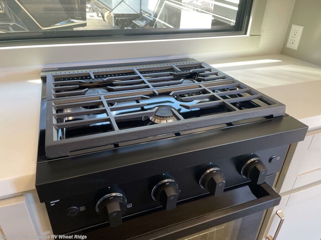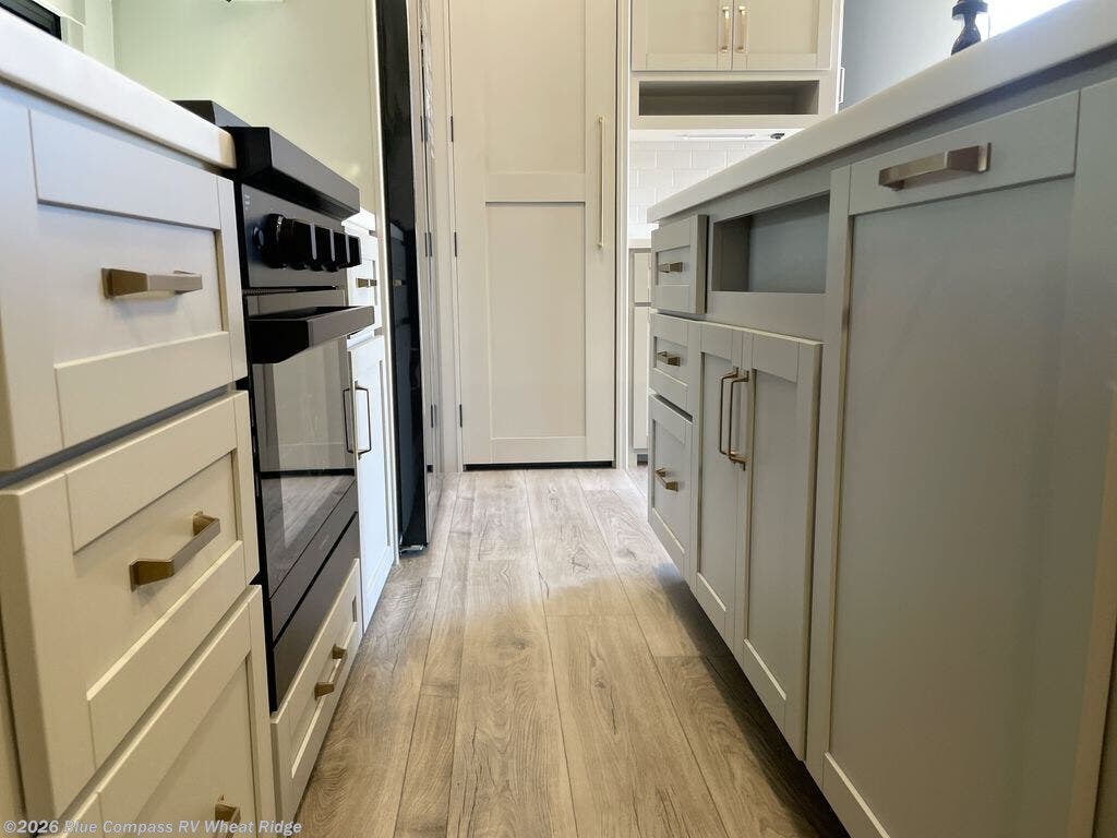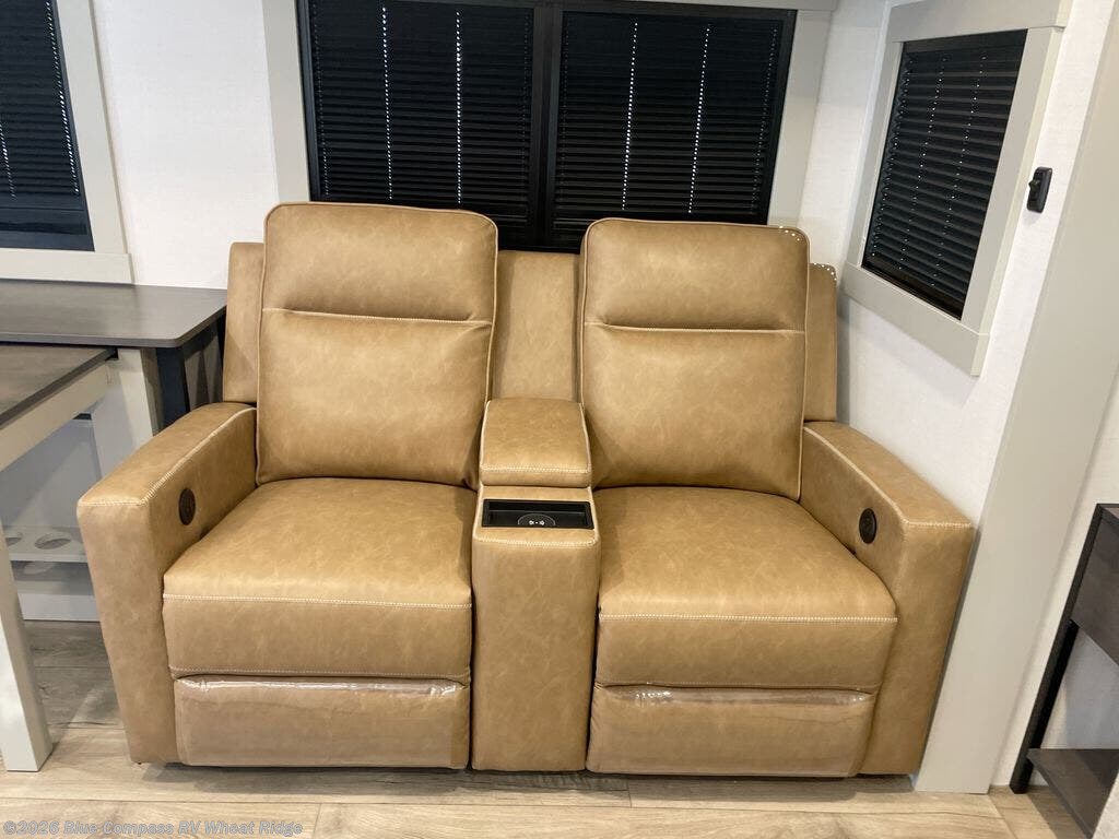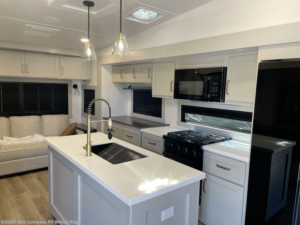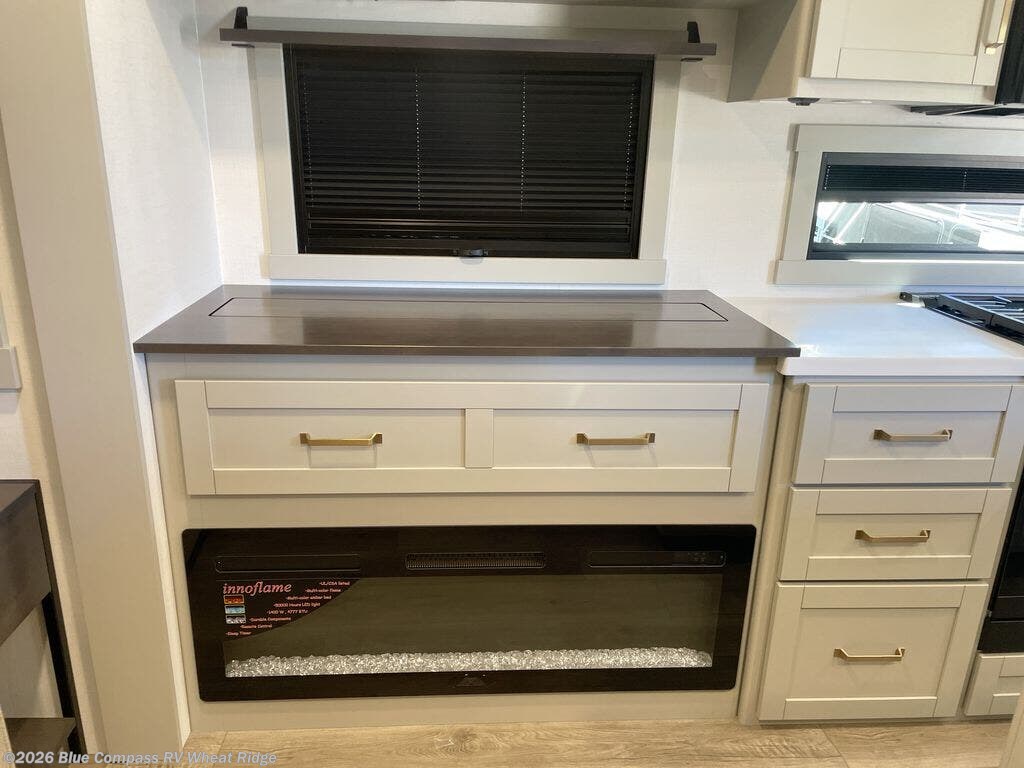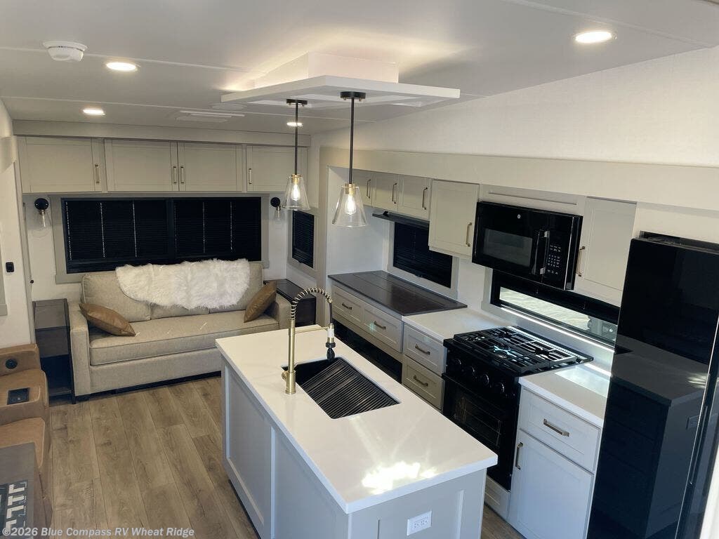 You're going to love every minute spent in this spacious fifth wheel that can sleep four. There is an inviting rear living area with a 72" tri-fold sofa and theater seating across from the televator and fireplace. The chef of your group can whip up dinner on the three burner cooktop or in the 30" residential microwave, and there is a 16 cu. ft. refrigerator that even opens when with the slide out is in. You will also enjoy the kitchen island with a farmhouse sink and roller cover, dual trash bins with a Stow N' Go paper towel holder, plus convenient dog bowls for your furry friends. You can store all your paper goods and snacks in the 84" pantry with adjustable shelving, and there is a hutch for nice dishes plus shoe storage in this model as well. Head to the front master bedroom where you'll find a queen bed with a TV, a large slide out with a wardrobe with drawers, plus a spacious bath.