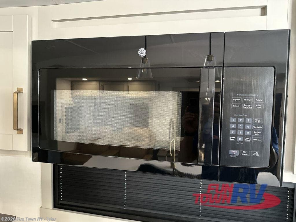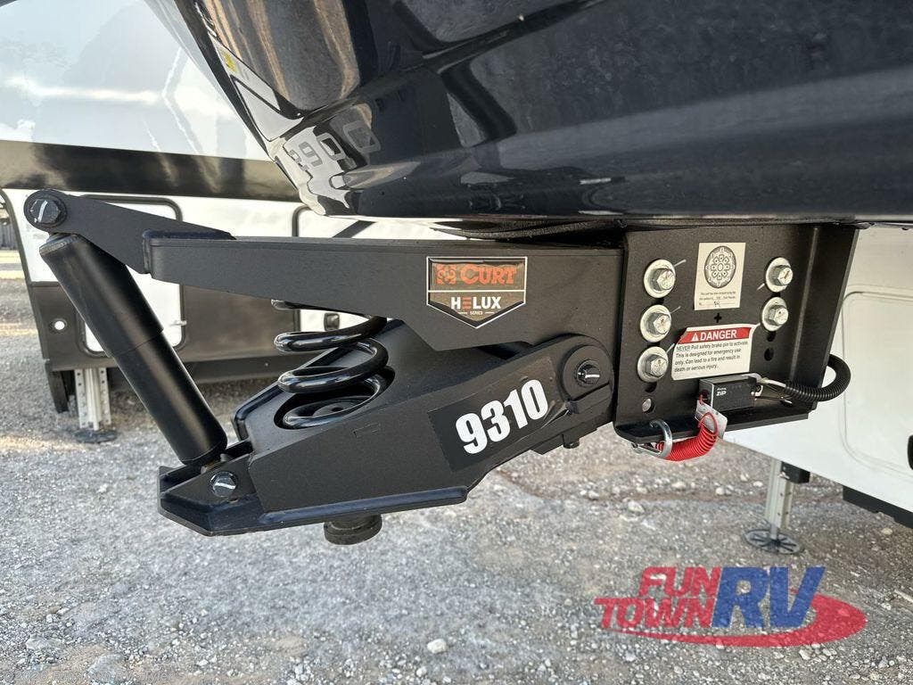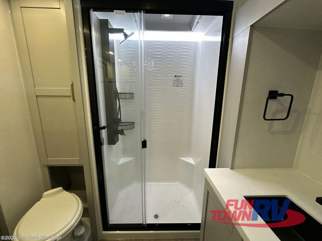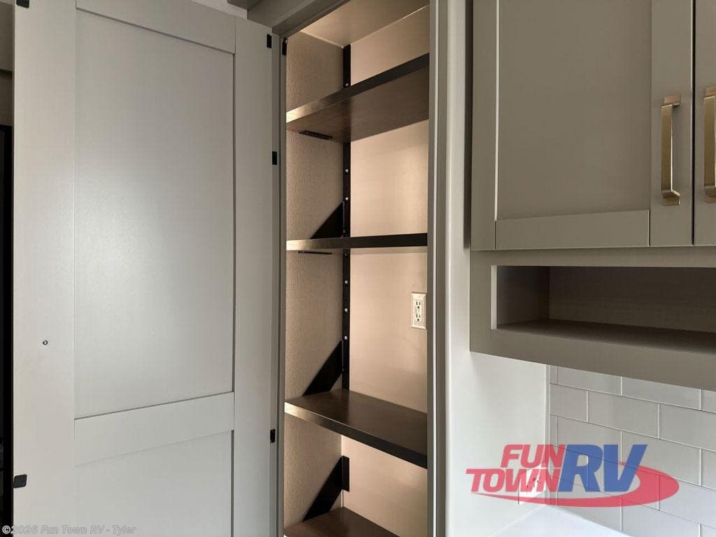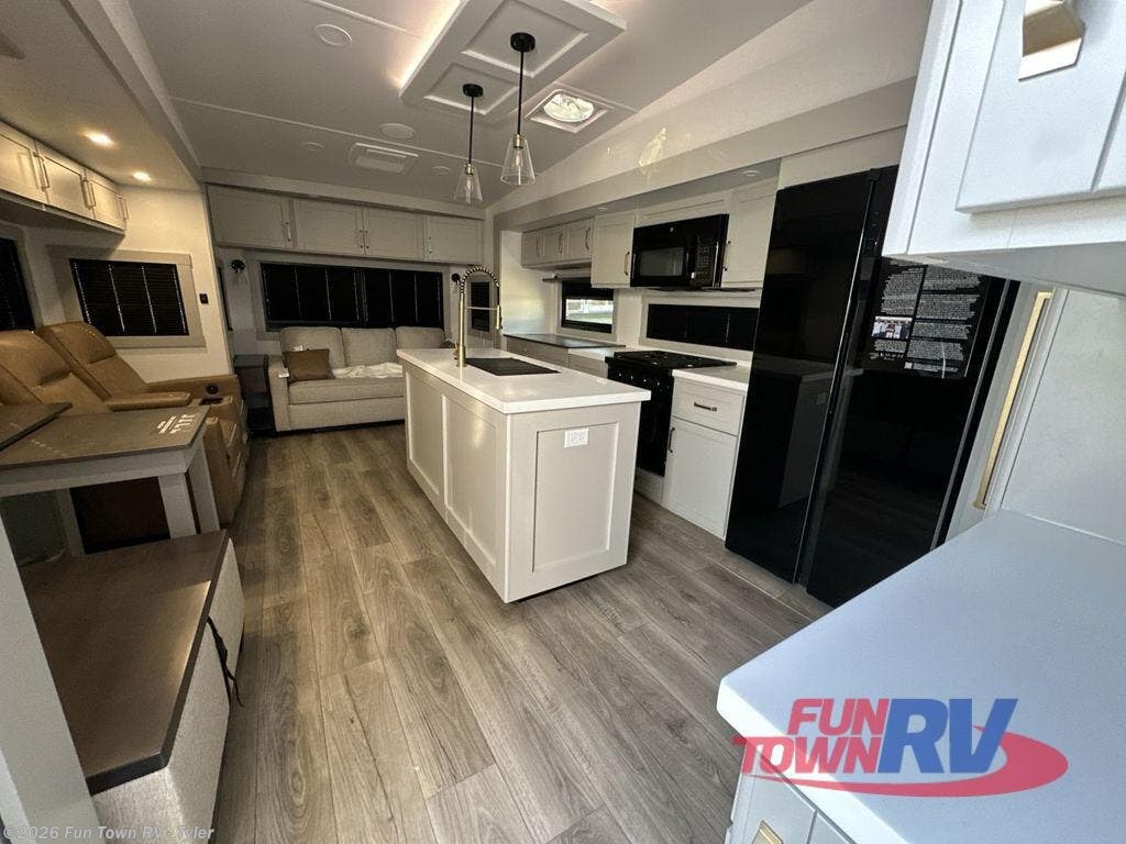 You're going to love every minute spent in this spacious fifth wheel that can sleep four. There is an inviting rear living area with a 72" tri-fold sofa and theater seating across from the televator and fireplace. The chef of your group can whip up dinner on the three burner cooktop or in the 30" residential microwave, and there is a 16 cu. ft. refrigerator that even opens when with the slide out is in. You will also enjoy the kitchen island with a farmhouse sink and roller cover, dual trash bins with a Stow N' Go paper towel holder, plus convenient dog bowls for your furry friends. You can store all your paper goods and snacks in the 84" pantry with adjustable shelving, and there is a hutch for nice dishes plus shoe storage in this model as well. Head to the front master bedroom where you'll find a queen bed with a TV, a large slide out with a wardrobe with drawers, plus a spacious bath.