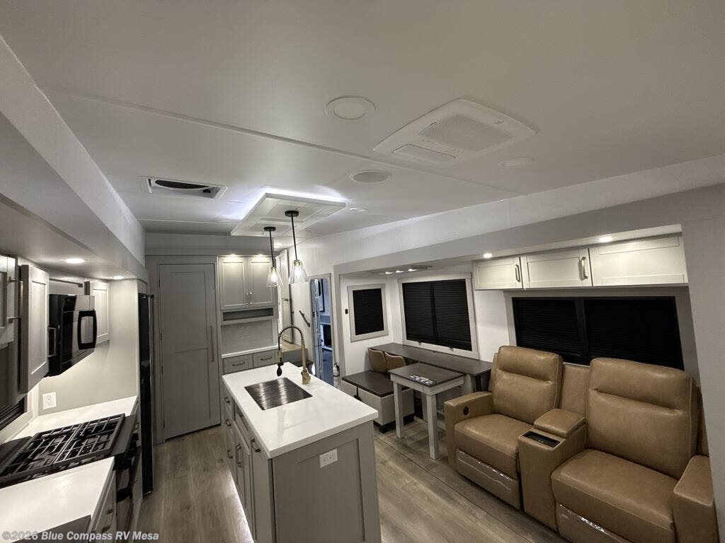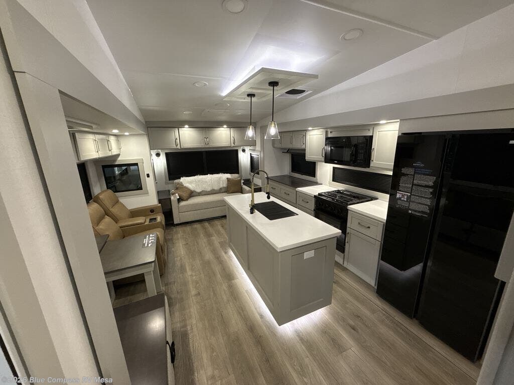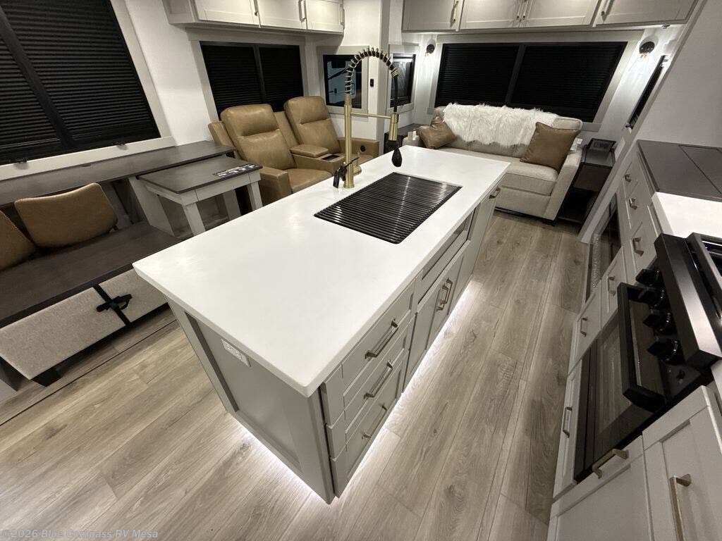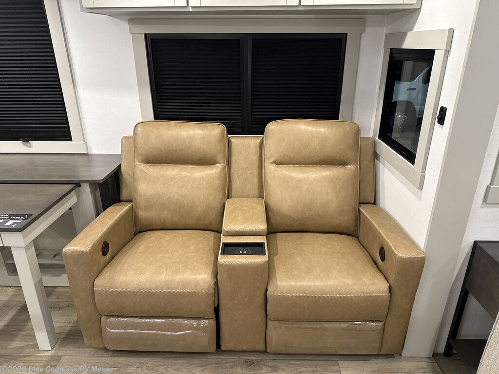 You're going to love every minute spent in this spacious fifth wheel that can sleep four. There is an inviting rear living area with a 72" tri-fold sofa and theater seating across from the televator and fireplace. The chef of your group can whip up dinner on the three burner cooktop or in the 30" residential microwave, and there is a 16 cu. ft. refrigerator that even opens when with the slide out is in. You will also enjoy the kitchen island with a farmhouse sink and roller cover, dual trash bins with a Stow N' Go paper towel holder, plus convenient dog bowls for your furry friends. You can store all your paper goods and snacks in the 84" pantry with adjustable shelving, and there is a hutch for nice dishes plus shoe storage in this model as well. Head to the front master bedroom where you'll find a queen bed with a TV, a large slide out with a wardrobe with drawers, plus a spacious bath.