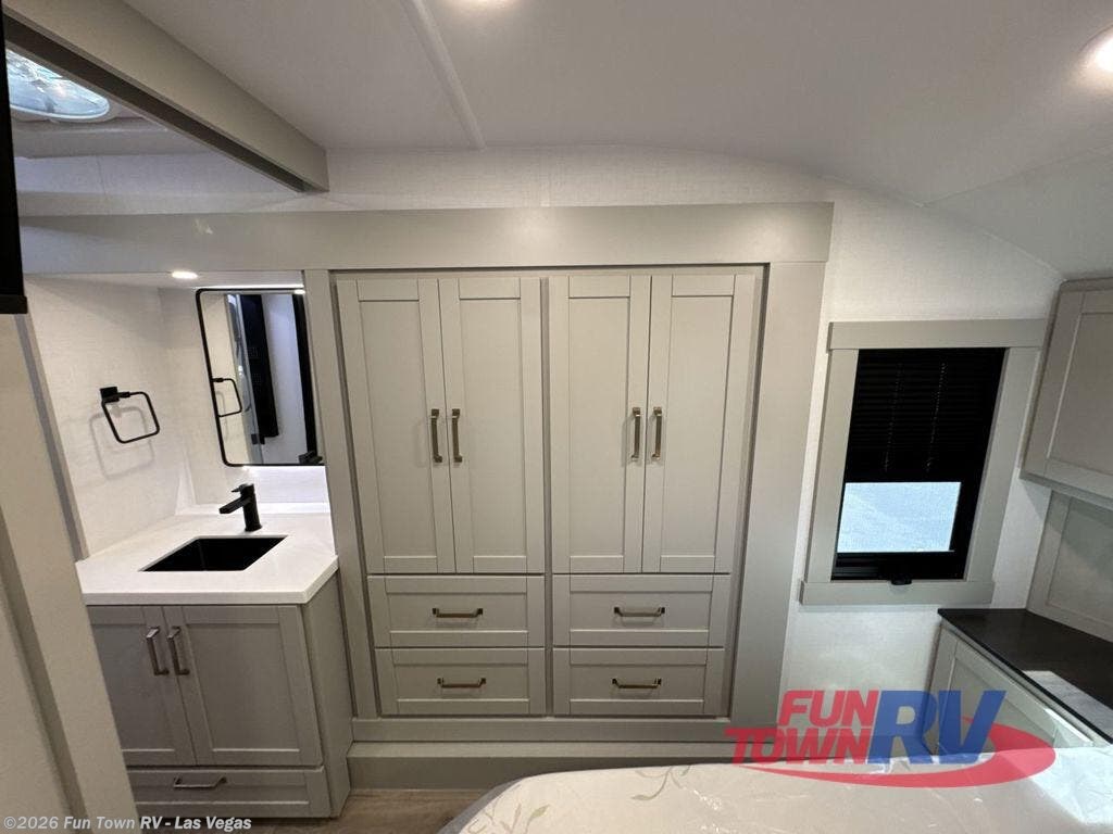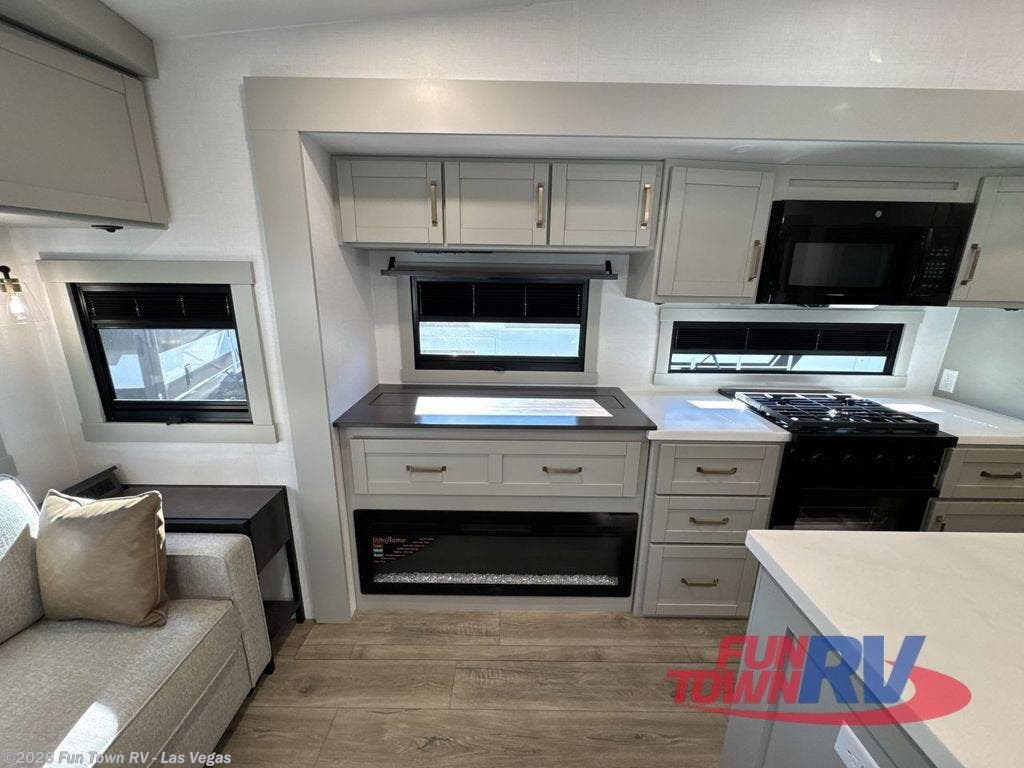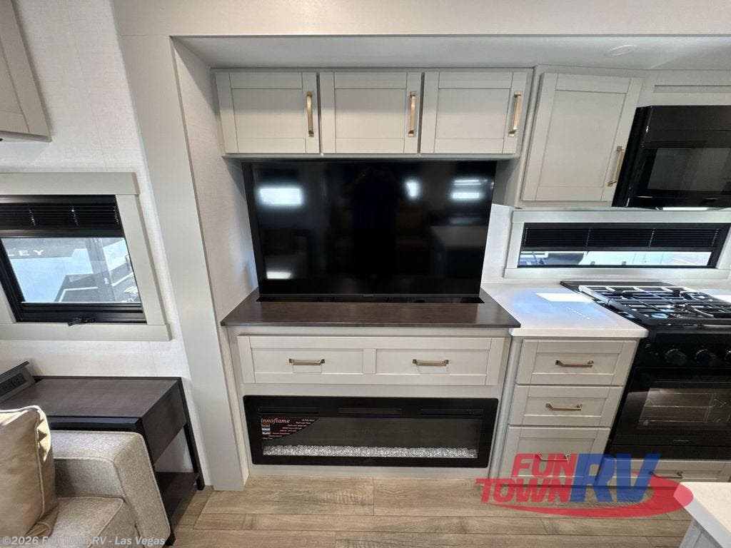 You're going to love every minute spent in this spacious fifth wheel that can sleep four. There is an inviting rear living area with a 72" tri-fold sofa and theater seating across from the televator and fireplace. The chef of your group can whip up dinner on the three burner cooktop or in the 30" residential microwave, and there is a 16 cu. ft. refrigerator that even opens when with the slide out is in. You will also enjoy the kitchen island with a farmhouse sink and roller cover, dual trash bins with a Stow N' Go paper towel holder, plus convenient dog bowls for your furry friends. You can store all your paper goods and snacks in the 84" pantry with adjustable shelving, and there is a hutch for nice dishes plus shoe storage in this model as well. Head to the front master bedroom where you'll find a queen bed with a TV, a large slide out with a wardrobe with drawers, plus a spacious bath.