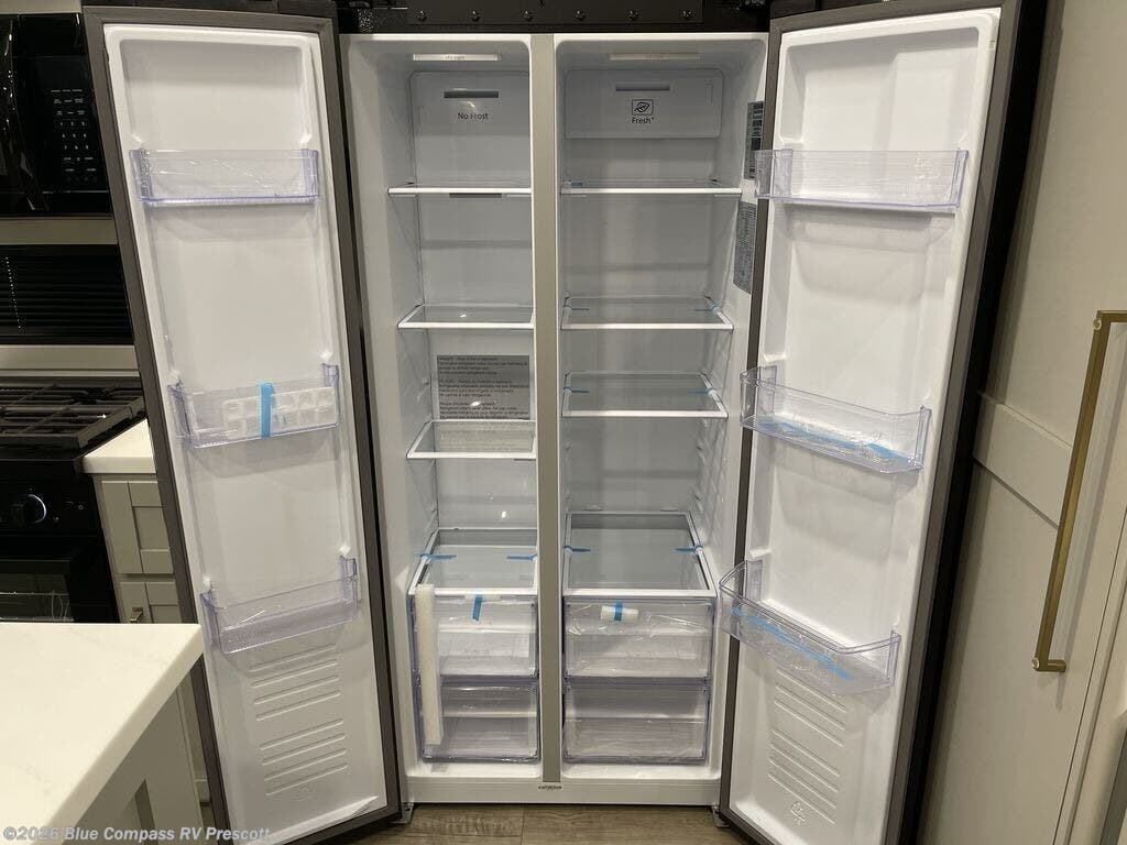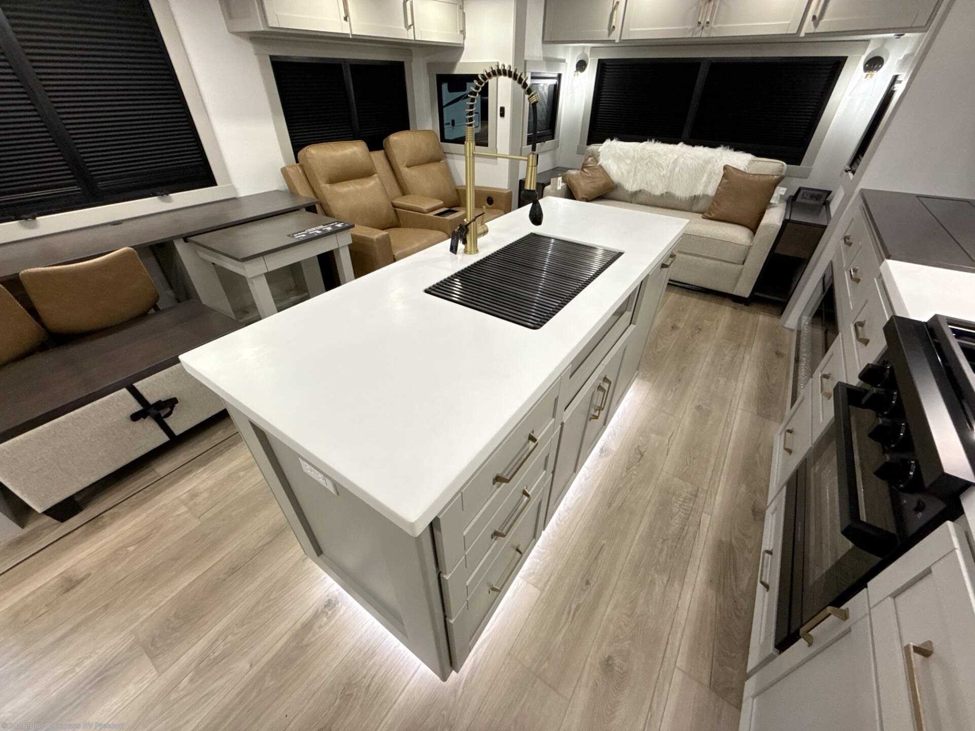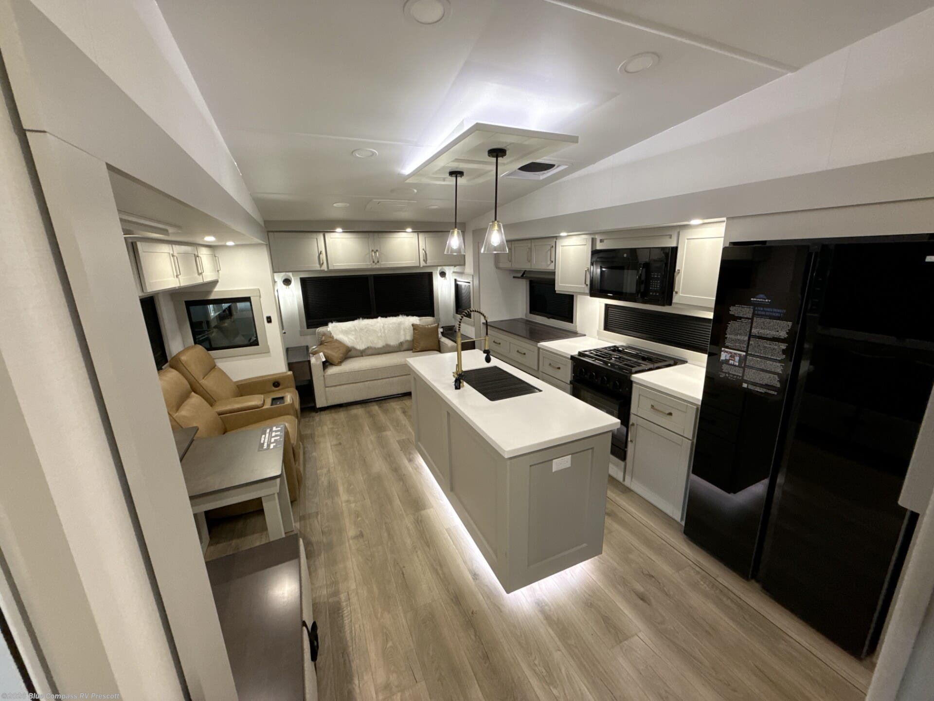 You're going to love every minute spent in this spacious fifth wheel that can sleep four. There is an inviting rear living area with a 72" tri-fold sofa and theater seating across from the televator and fireplace. The chef of your group can whip up dinner on the three burner cooktop or in the 30" residential microwave, and there is a 16 cu. ft. refrigerator that even opens when with the slide out is in. You will also enjoy the kitchen island with a farmhouse sink and roller cover, dual trash bins with a Stow N' Go paper towel holder, plus convenient dog bowls for your furry friends. You can store all your paper goods and snacks in the 84" pantry with adjustable shelving, and there is a hutch for nice dishes plus shoe storage in this model as well. Head to the front master bedroom where you'll find a queen bed with a TV, a large slide out with a wardrobe with drawers, plus a spacious bath.