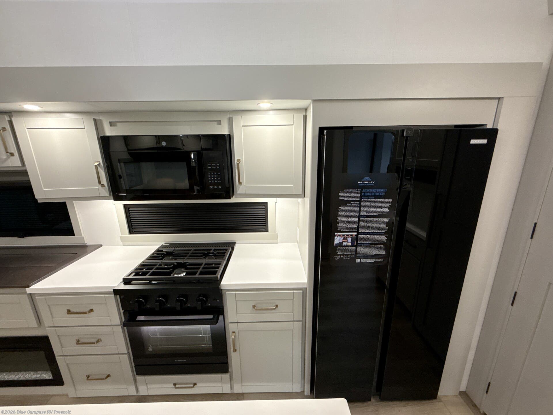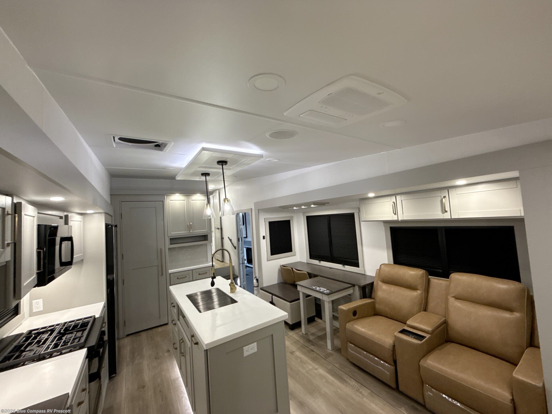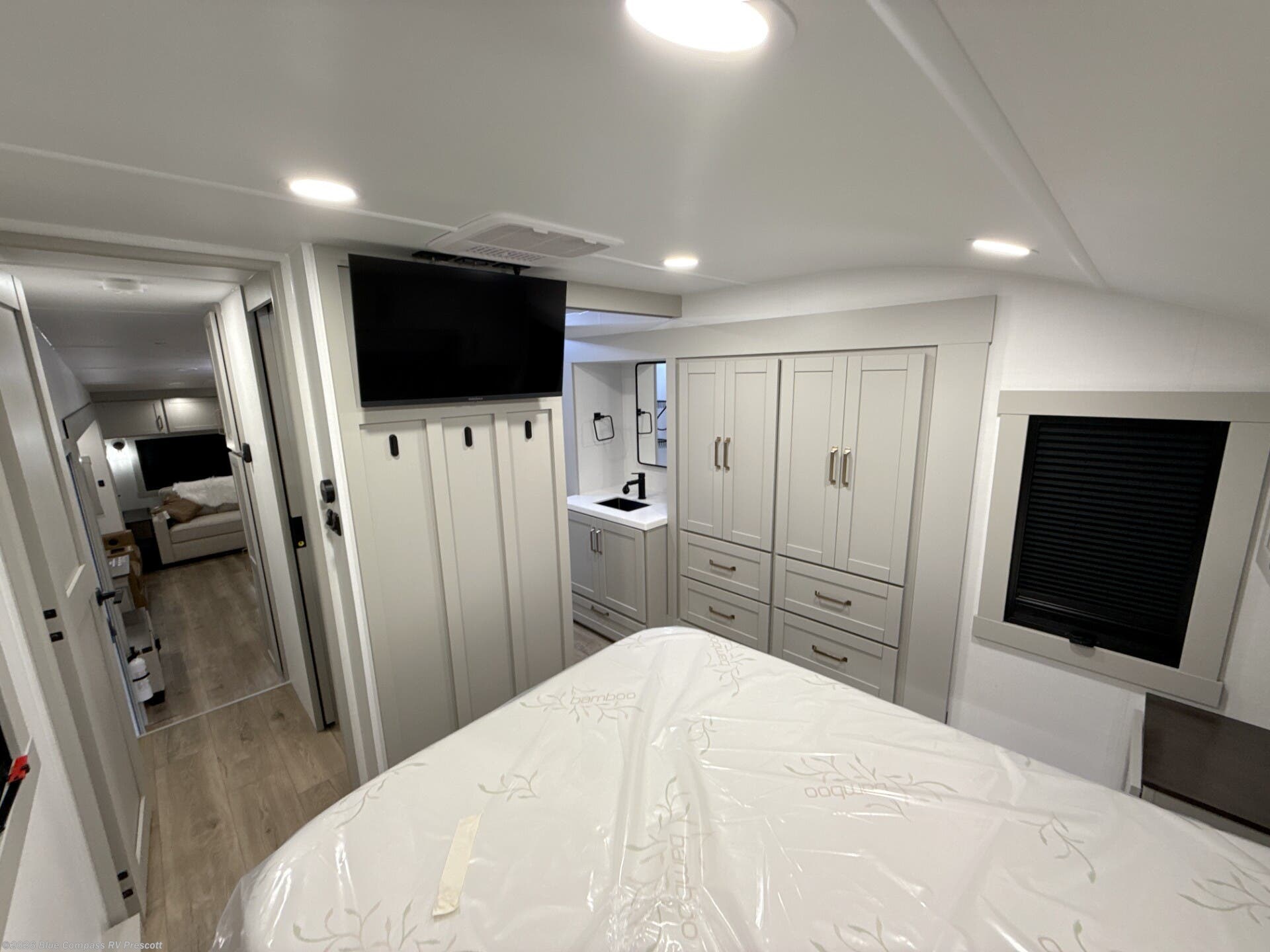 You're going to love every minute spent in this spacious fifth wheel that can sleep four. There is an inviting rear living area with a 72" tri-fold sofa and theater seating across from the televator and fireplace. The chef of your group can whip up dinner on the three burner cooktop or in the 30" residential microwave, and there is a 16 cu. ft. refrigerator that even opens when with the slide out is in. You will also enjoy the kitchen island with a farmhouse sink and roller cover, dual trash bins with a Stow N' Go paper towel holder, plus convenient dog bowls for your furry friends. You can store all your paper goods and snacks in the 84" pantry with adjustable shelving, and there is a hutch for nice dishes plus shoe storage in this model as well. Head to the front master bedroom where you'll find a queen bed with a TV, a large slide out with a wardrobe with drawers, plus a spacious bath.