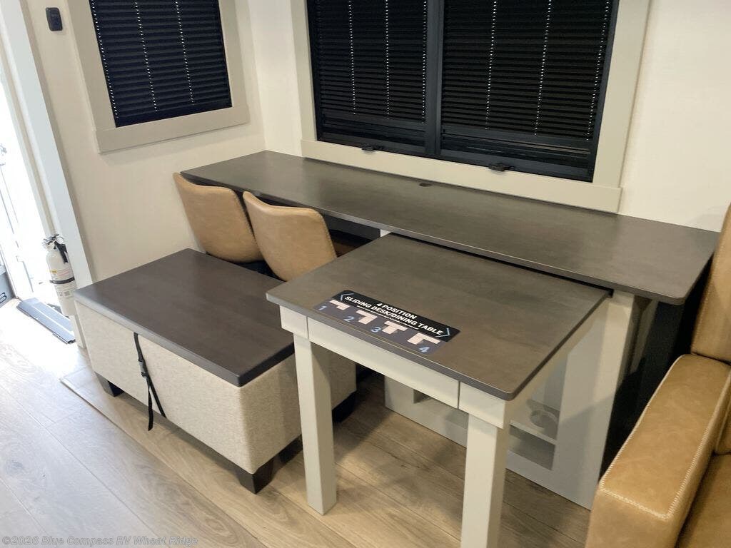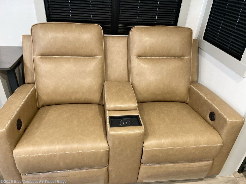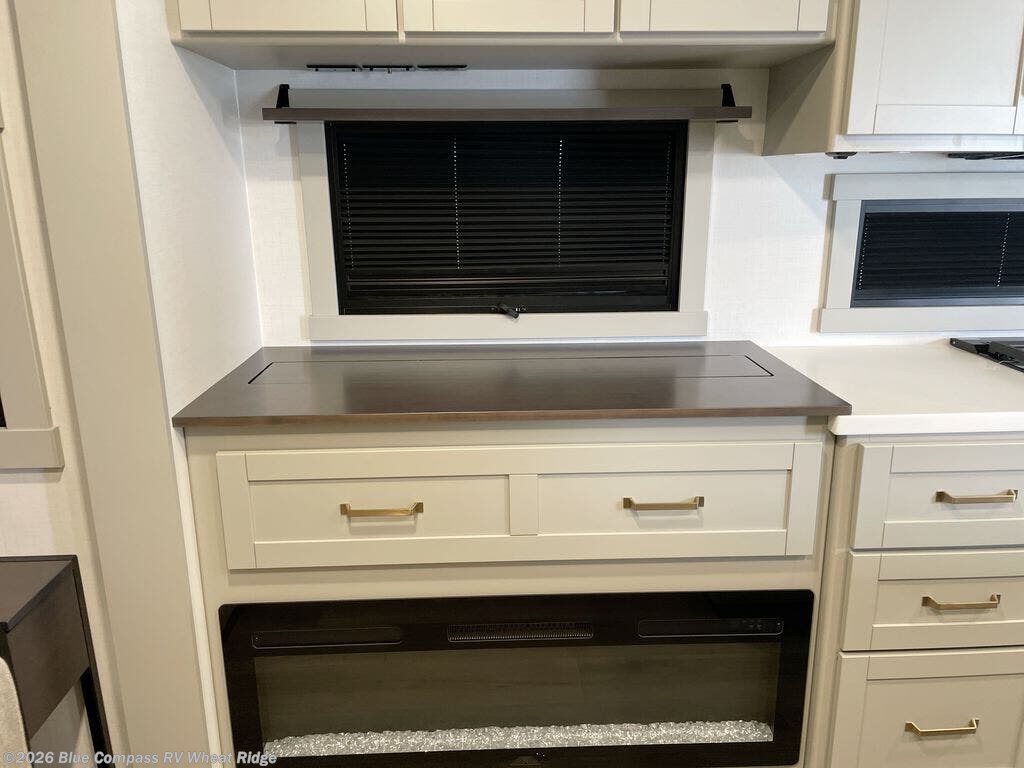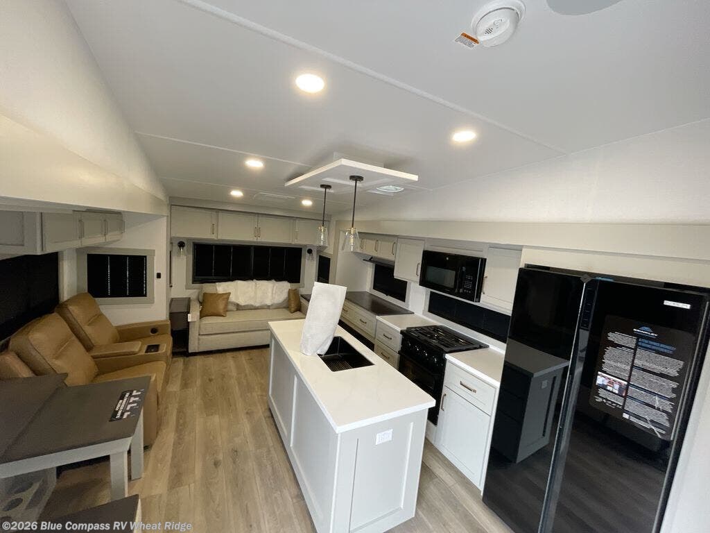 You're going to love every minute spent in this spacious fifth wheel that can sleep four. There is an inviting rear living area with a 72" tri-fold sofa and theater seating across from the televator and fireplace. The chef of your group can whip up dinner on the three burner cooktop or in the 30" residential microwave, and there is a 16 cu. ft. refrigerator that even opens when with the slide out is in. You will also enjoy the kitchen island with a farmhouse sink and roller cover, dual trash bins with a Stow N' Go paper towel holder, plus convenient dog bowls for your furry friends. You can store all your paper goods and snacks in the 84" pantry with adjustable shelving, and there is a hutch for nice dishes plus shoe storage in this model as well. Head to the front master bedroom where you'll find a queen bed with a TV, a large slide out with a wardrobe with drawers, plus a spacious bath.