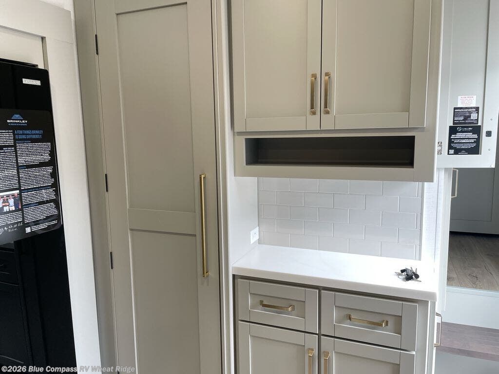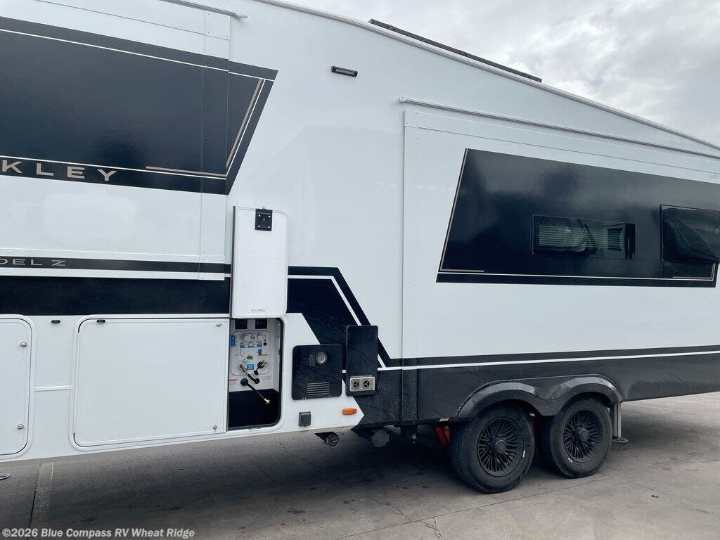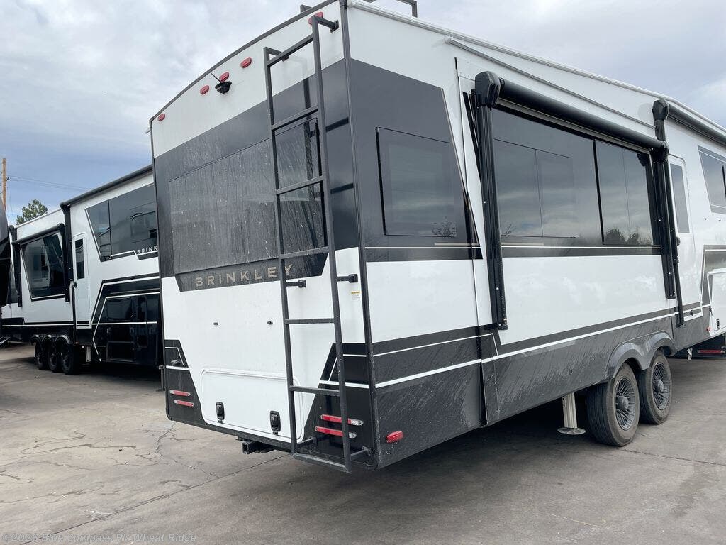 The Brinkley mid-profile Model Z fifth wheels bring you clean lines and an upscale look with plenty of style and exciting new features like the industry first brass plumbing connections. These units also feature an automotive grade front cap, plenty of exterior storage, dual exterior hot and cold showers, and wide stance leveling jacks for easy set up. Residential frameless windows provide a clean look and beautiful views, and ample electrical outlets and USB/USB-C outlets allow all of your electronics and appliances to easily be used and charged.