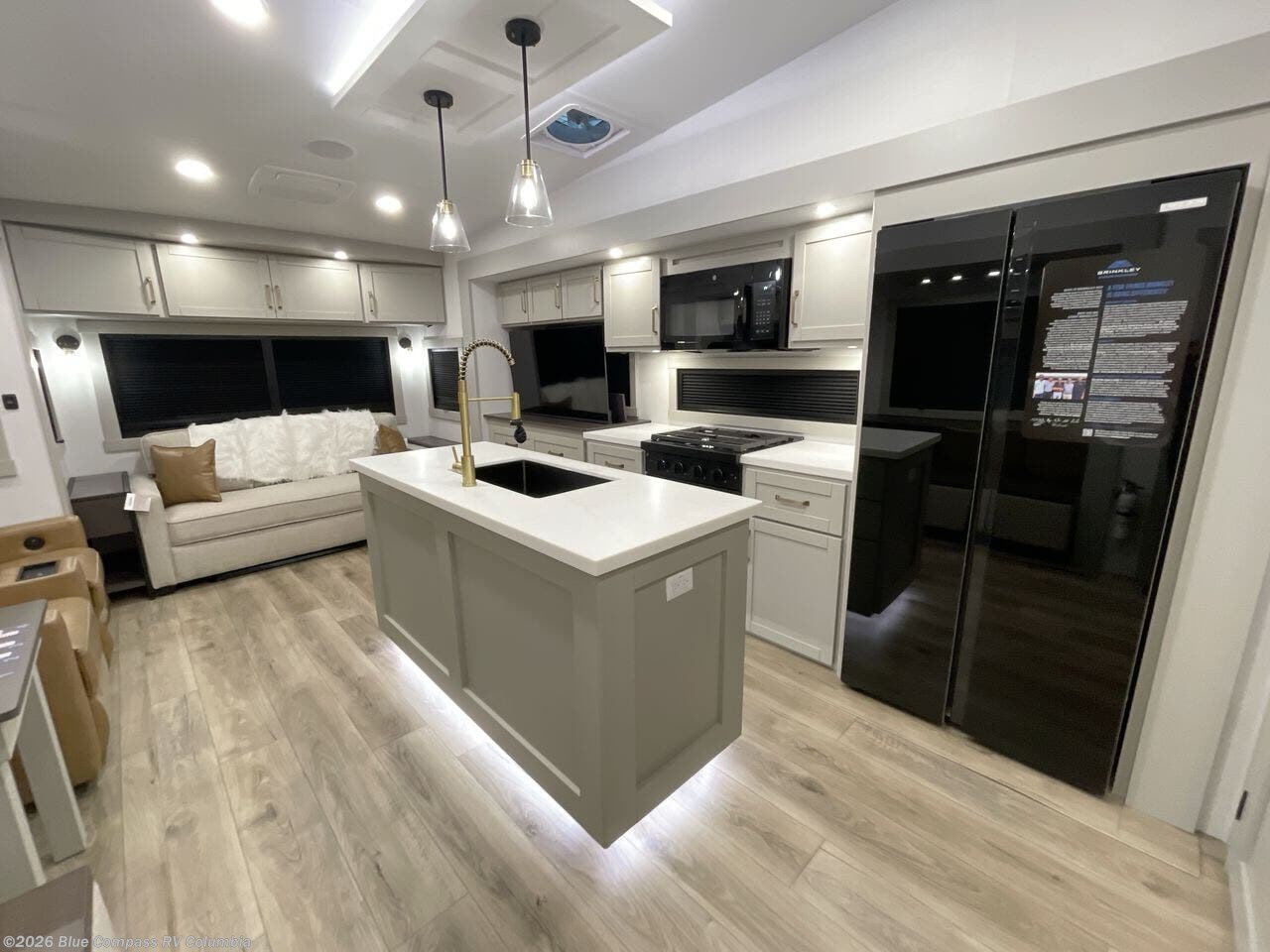 The Brinkley mid-profile Model Z fifth wheels bring you clean lines and an upscale look with plenty of style and exciting new features like the industry first brass plumbing connections. These units also feature an automotive grade front cap, plenty of exterior storage, dual exterior hot and cold showers, and wide stance leveling jacks for easy set up. Residential frameless windows provide a clean look and beautiful views, and ample electrical outlets and USB/USB-C outlets allow all of your electronics and appliances to easily be used and charged.