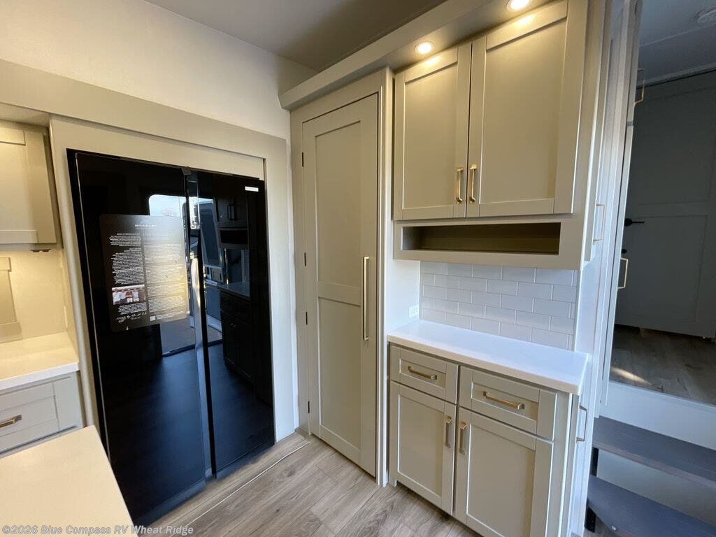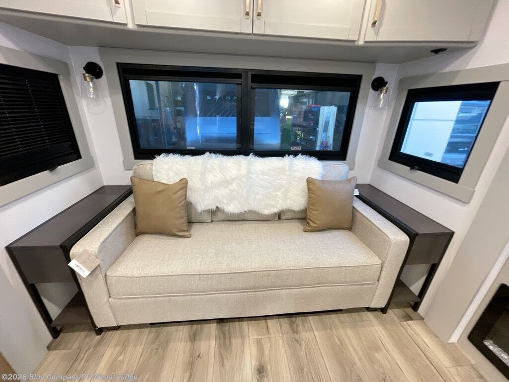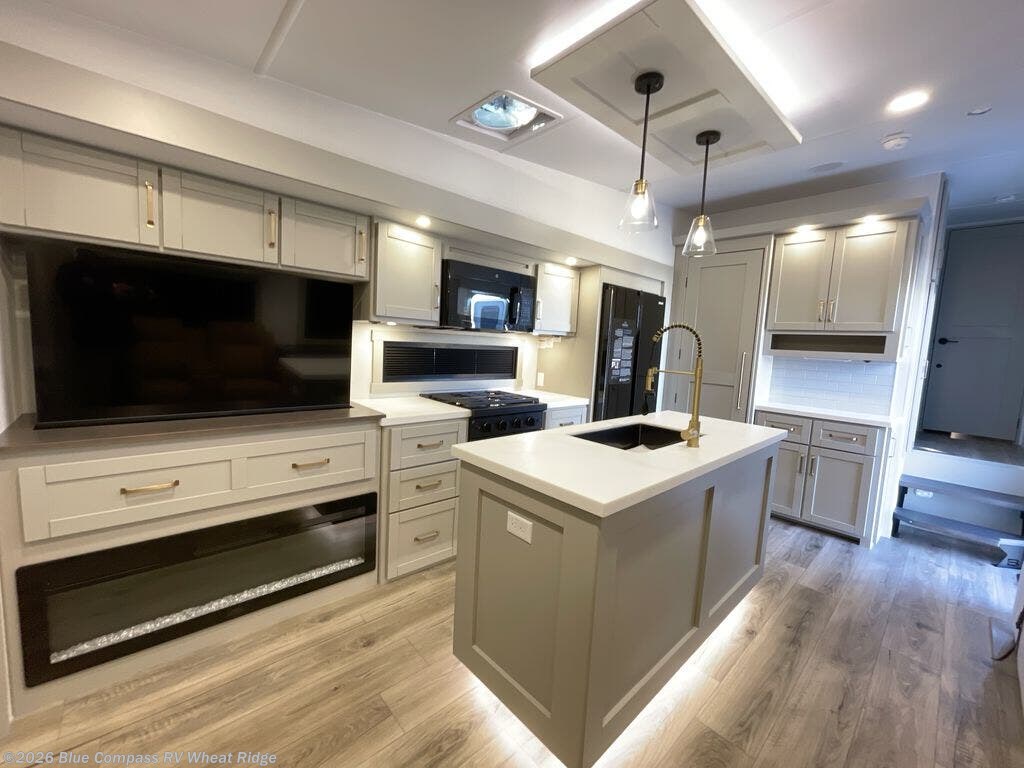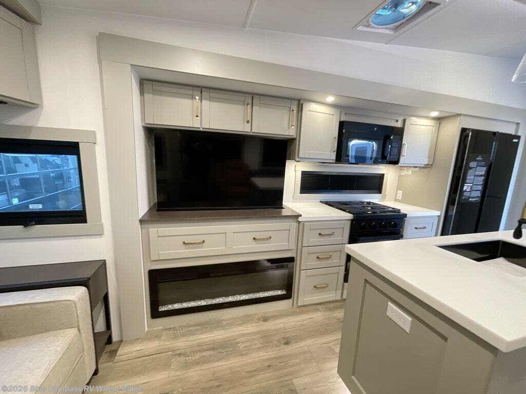 You're going to love every minute spent in this spacious fifth wheel that can sleep four. There is an inviting rear living area with a 72" tri-fold sofa and theater seating across from the televator and fireplace. The chef of your group can whip up dinner on the three burner cooktop or in the 30" residential microwave, and there is a 16 cu. ft. refrigerator that even opens when with the slide out is in. You will also enjoy the kitchen island with a farmhouse sink and roller cover, dual trash bins with a Stow N' Go paper towel holder, plus convenient dog bowls for your furry friends. You can store all your paper goods and snacks in the 84" pantry with adjustable shelving, and there is a hutch for nice dishes plus shoe storage in this model as well. Head to the front master bedroom where you'll find a queen bed with a TV, a large slide out with a wardrobe with drawers, plus a spacious bath.