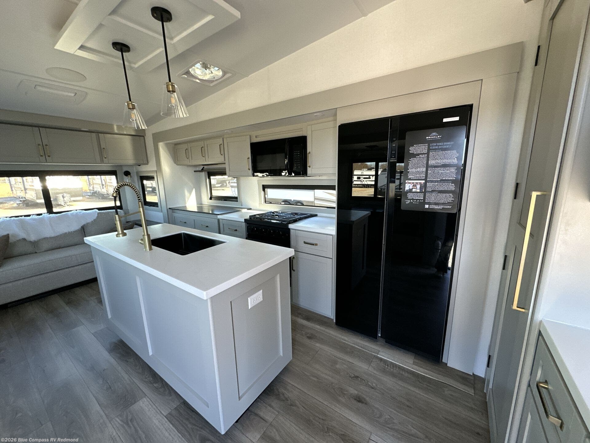 The Brinkley mid-profile Model Z fifth wheels bring you clean lines and an upscale look with plenty of style and exciting new features like the industry first brass plumbing connections. These units also feature an automotive grade front cap, plenty of exterior storage, dual exterior hot and cold showers, and wide stance leveling jacks for easy set up. Residential frameless windows provide a clean look and beautiful views, and ample electrical outlets and USB/USB-C outlets allow all of your electronics and appliances to easily be used and charged.