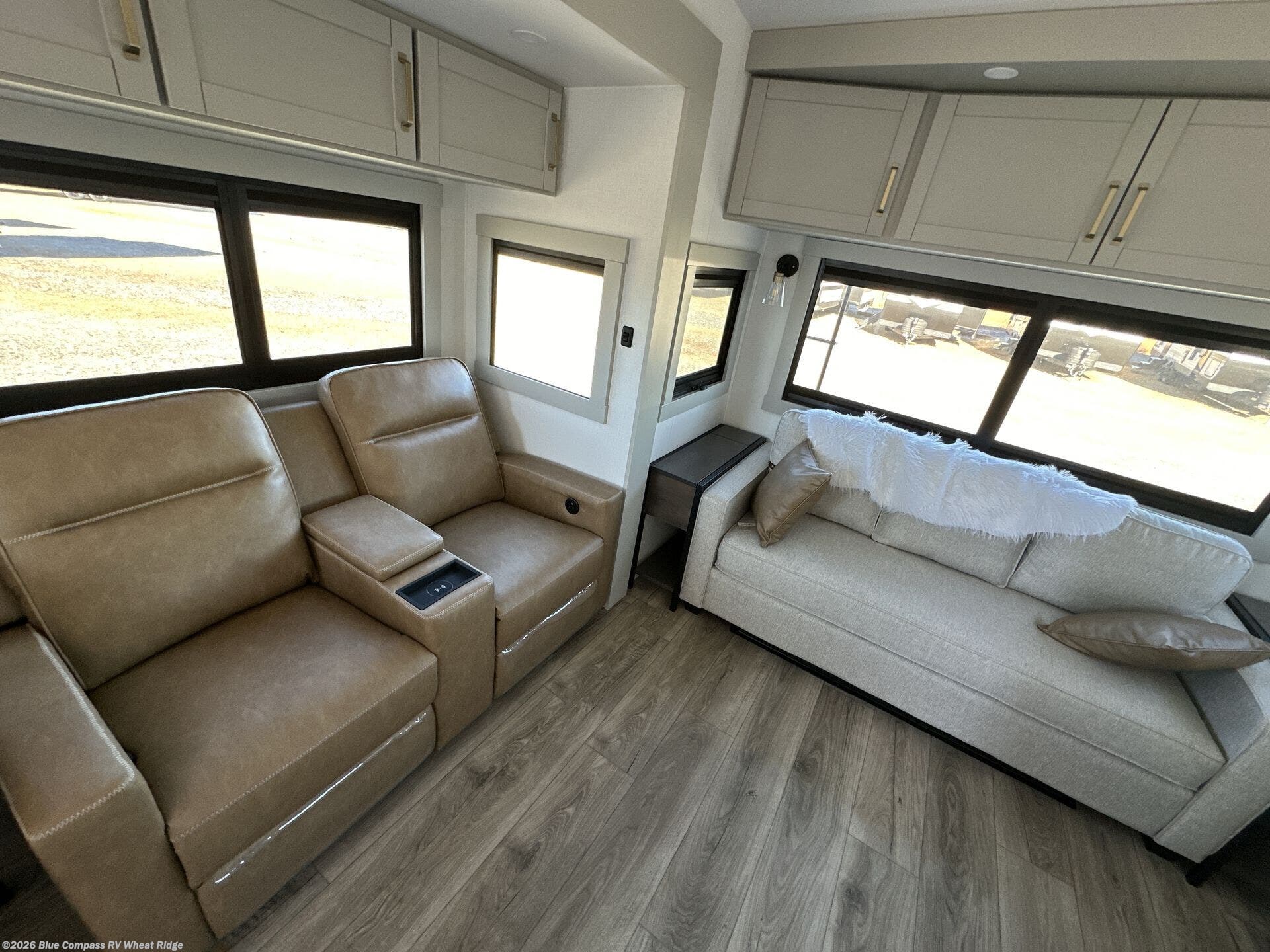 You're going to love every minute spent in this spacious fifth wheel that can sleep four. There is an inviting rear living area with a 72" tri-fold sofa and theater seating across from the televator and fireplace. The chef of your group can whip up dinner on the three burner cooktop or in the 30" residential microwave, and there is a 16 cu. ft. refrigerator that even opens when with the slide out is in. You will also enjoy the kitchen island with a farmhouse sink and roller cover, dual trash bins with a Stow N' Go paper towel holder, plus convenient dog bowls for your furry friends. You can store all your paper goods and snacks in the 84" pantry with adjustable shelving, and there is a hutch for nice dishes plus shoe storage in this model as well. Head to the front master bedroom where you'll find a queen bed with a TV, a large slide out with a wardrobe with drawers, plus a spacious bath.