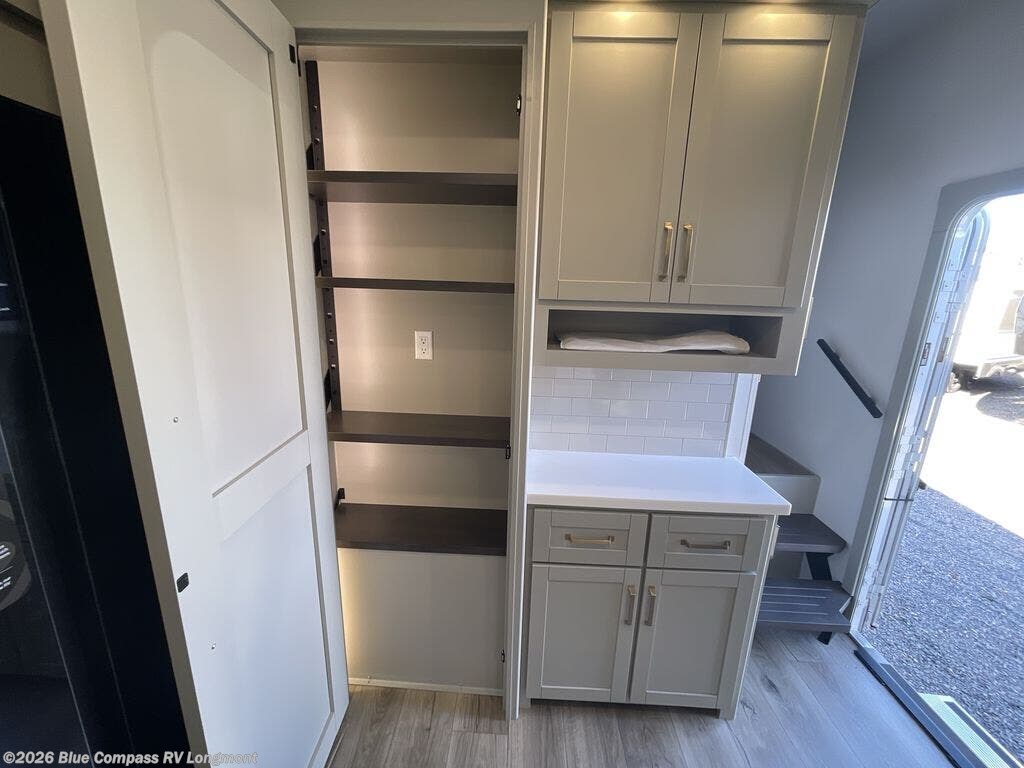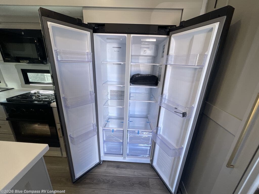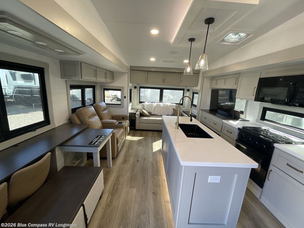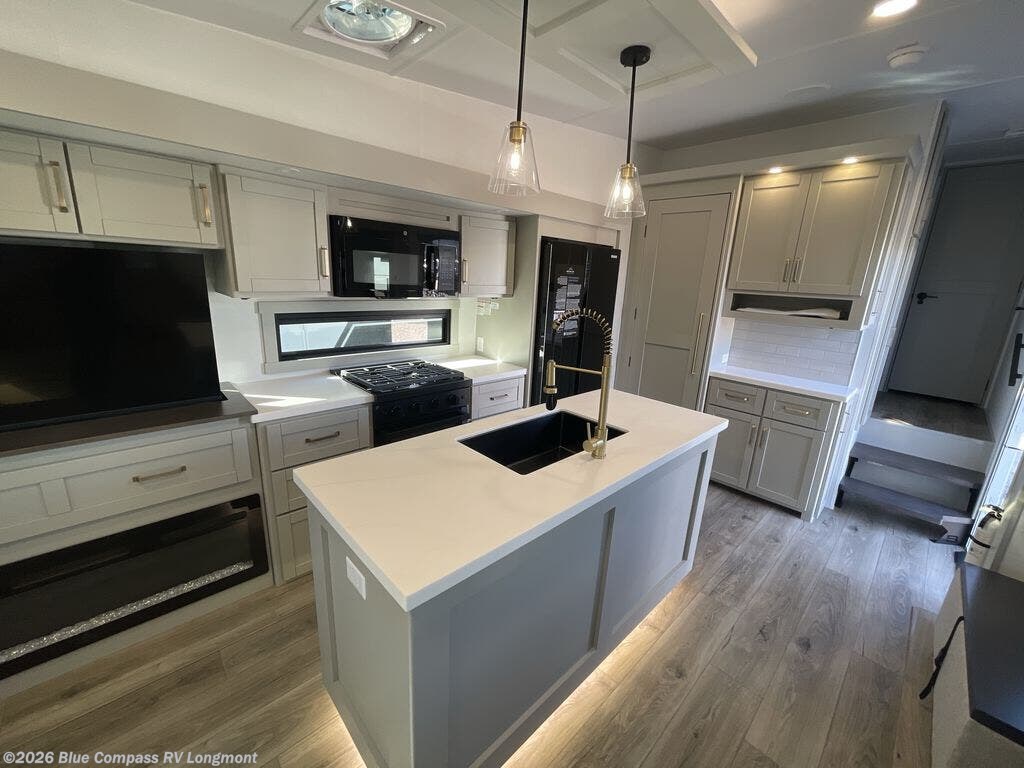You're going to love every minute spent in this spacious fifth wheel that can sleep four. There is an inviting rear living area with a 72" tri-fold sofa and theater seating across from the televator and fireplace. The chef of your group can whip up dinner on the three burner cooktop or in the 30" residential microwave, and there is a 16 cu. ft. refrigerator that even opens when with the slide out is in. You will also enjoy the kitchen island with a farmhouse sink and roller cover, dual trash bins with a Stow N' Go paper towel holder, plus convenient dog bowls for your furry friends. You can store all your paper goods and snacks in the 84" pantry with adjustable shelving, and there is a hutch for nice dishes plus shoe storage in this model as well. Head to the front master bedroom where you'll find a queen bed with a TV, a large slide out with a wardrobe with drawers, plus a spacious bath.