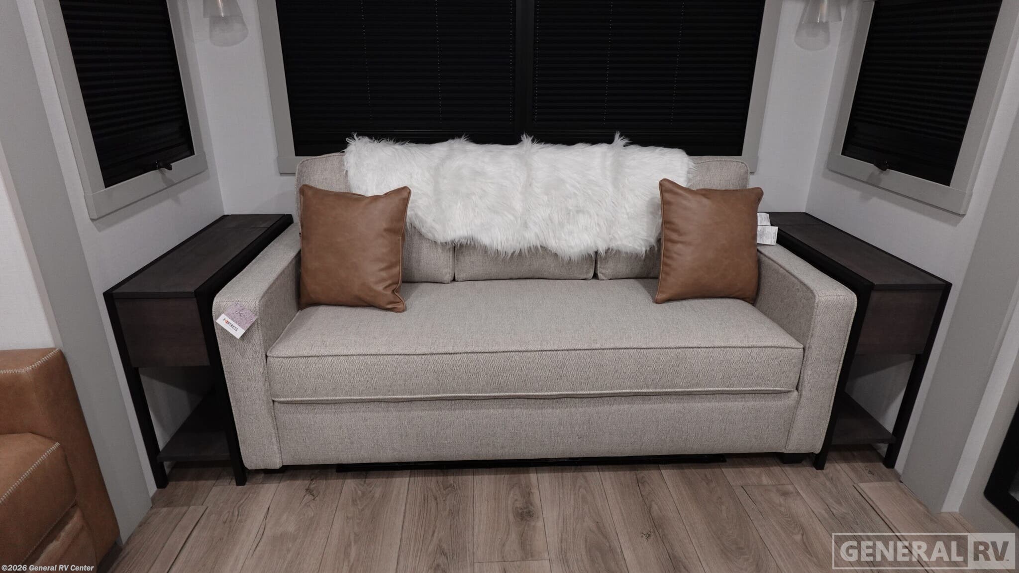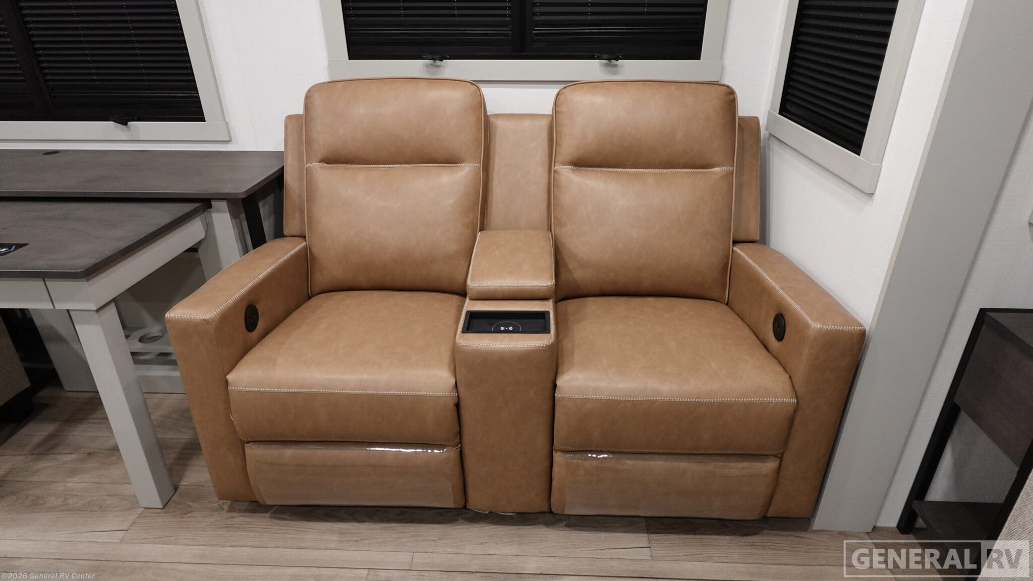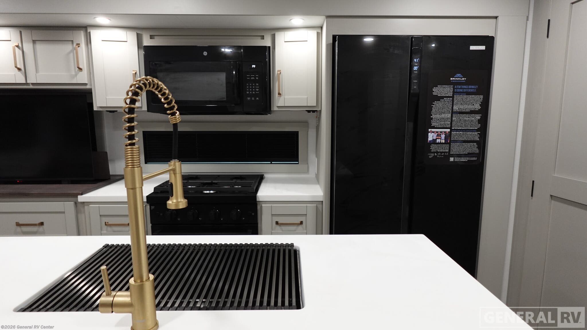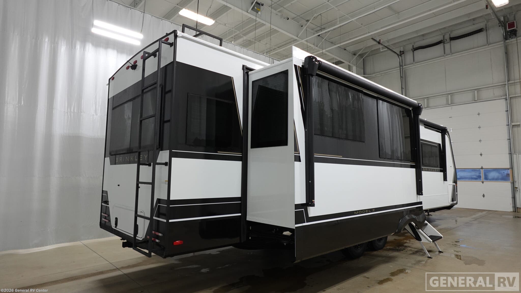 Step into the future with the 2026 Brinkley RV Model Z Air 310, where luxury meets functionality in a stunning design. This RV is crafted for those who seek both adventure and comfort. At nearly 38 feet in length, its spacious layout features a center kitchen equipped with a full-size electric refrigerator and a sleek cooktop with three burners, perfect for preparing meals on the go. The rear living area, complete with theater seating and a cozy fireplace, offers a perfect retreat after a day of exploration. The Model Z Air 310 is designed to accommodate up to four guests comfortably, with options for a queen or king bed in the front bedroom and a convertible bed for additional sleeping space. The center bath, featuring a one-piece fiberglass shower, ensures a refreshing experience. With ample storage, including a drop-frame pass-thru, and modern conveniences like a washer and dryer, this RV is a home away from home. Enjoy the outdoors under the expansive 25.5 ft. powered retractable awning, making every journey memorable. For more details, visit your nearest General RV dealership.