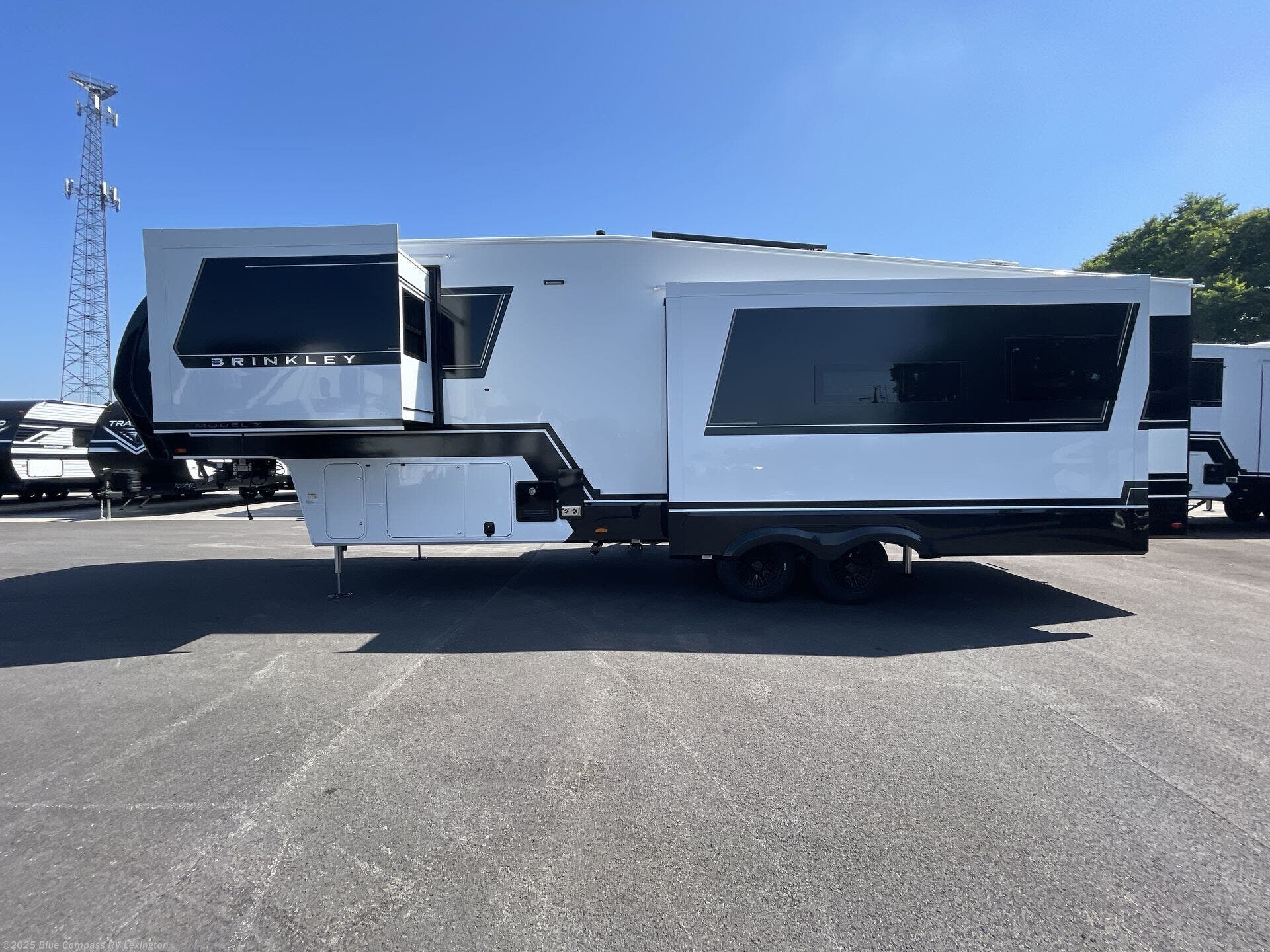 The Brinkley mid-profile Model Z fifth wheels bring you clean lines and an upscale look with plenty of style and exciting new features like the industry first brass plumbing connections. These units also feature an automotive grade front cap, plenty of exterior storage, dual exterior hot and cold showers, and wide stance leveling jacks for easy set up. Residential frameless windows provide a clean look and beautiful views, and ample electrical outlets and 6 USB/USB-C outlets allow all of your electronics and appliances to easily be used and charged.
