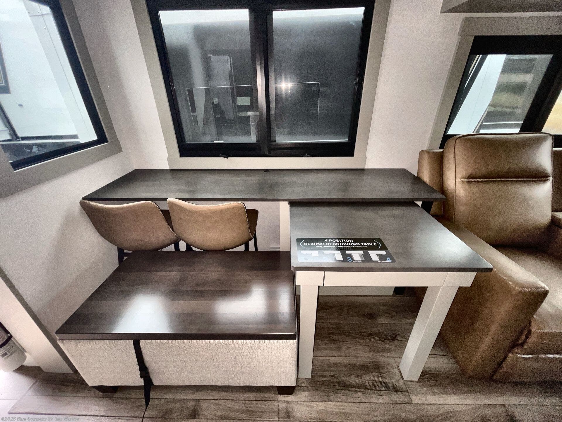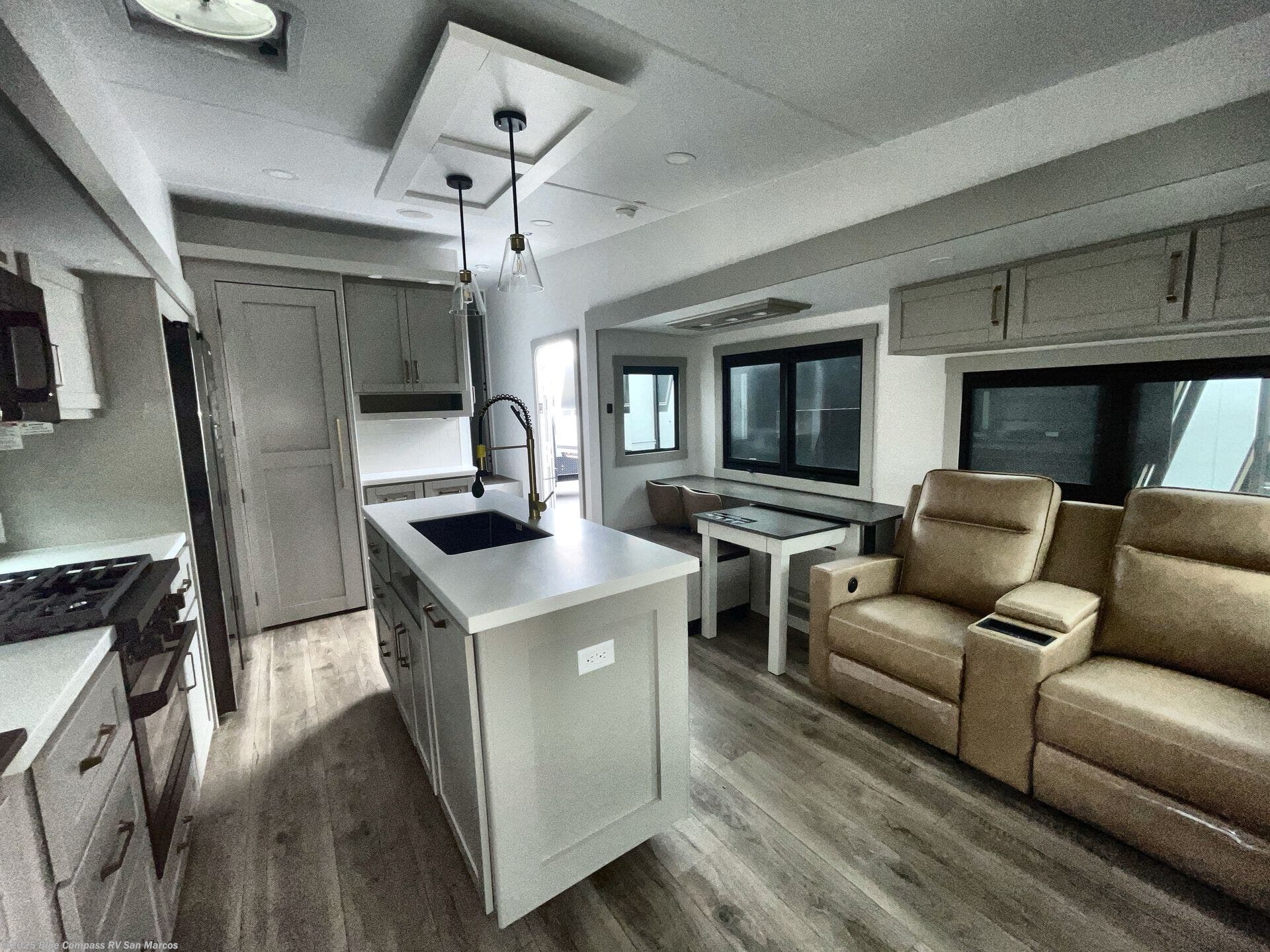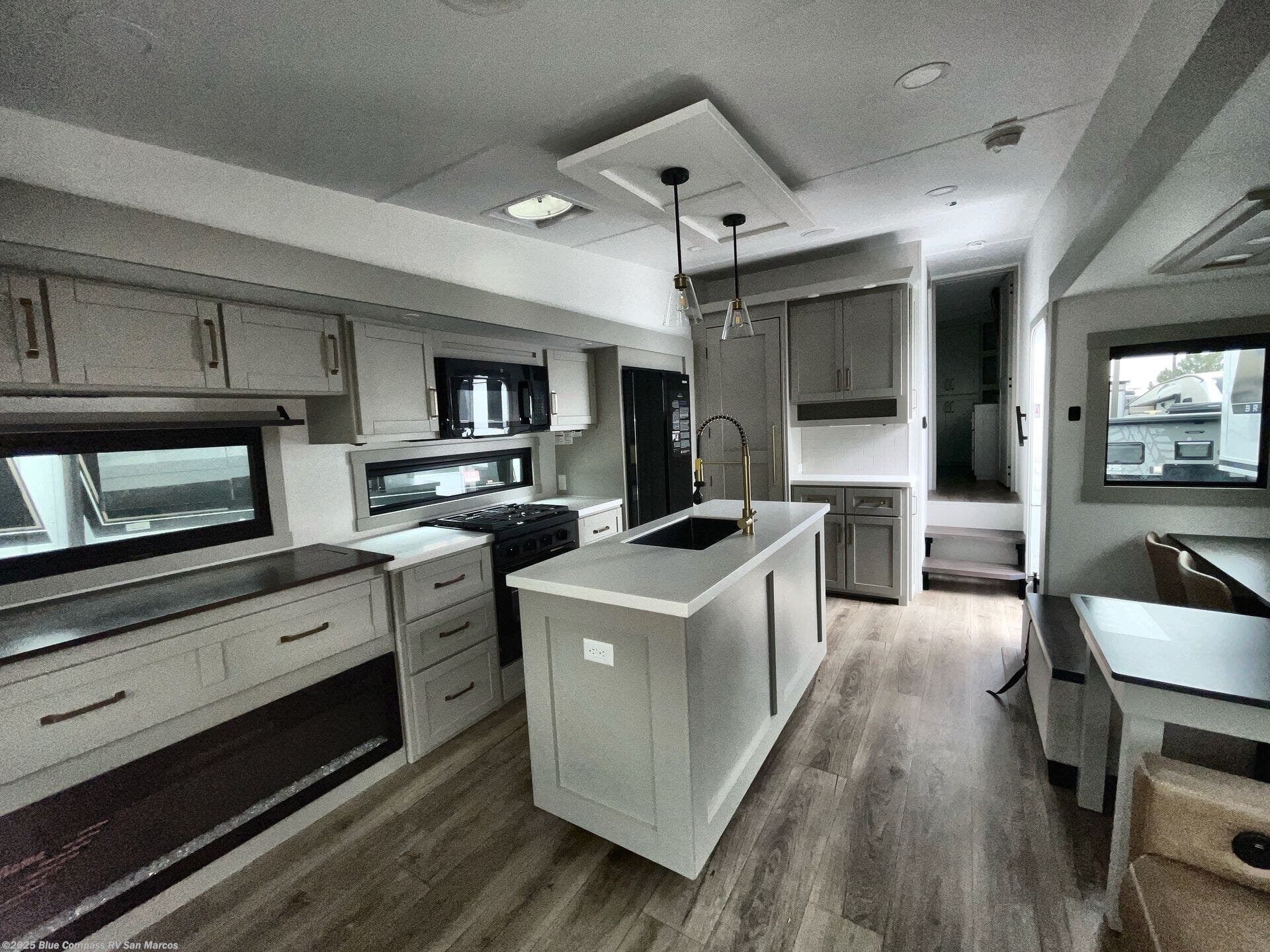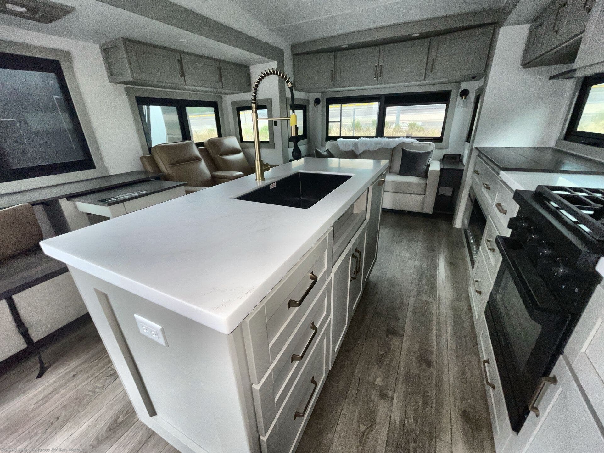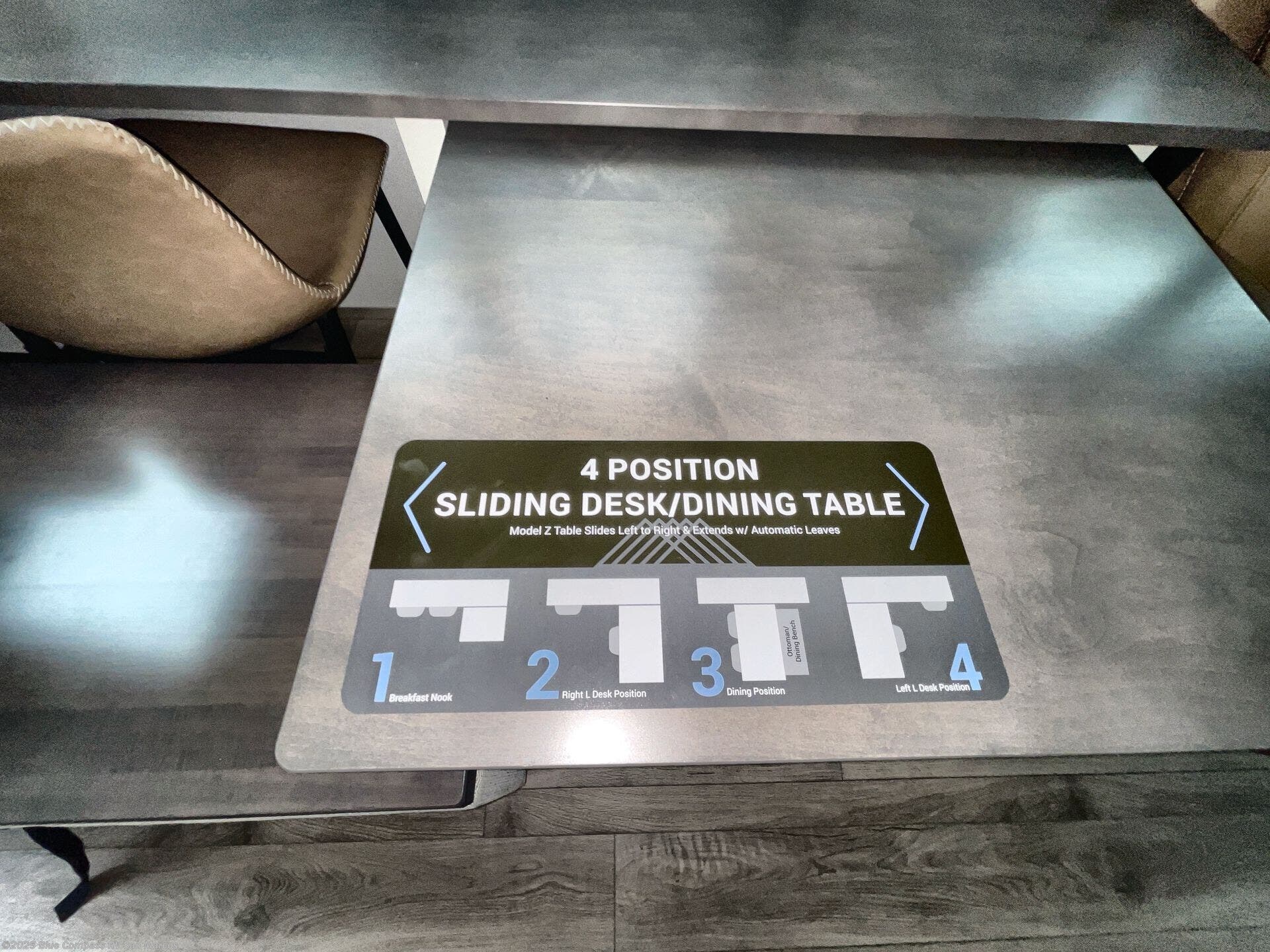 This Model Z luxury fifth wheel is bright and modern on the inside, with loads of amenities that will have you dreaming of your next trip! Enter and find a spacious combined living/kitchen space thanks to dual opposing slides. There is ample seating with a sliding desk/dining table, 62" theater seating, and a 72" tri-fold sofa along the rear wall. You can easily relax and enjoy the 50" Smart telescoping TV with a cozy fireplace below. The kitchen offers all that you need to prepare and cook meals just like home with a 16 cu. ft. refrigerator for your perishables, a 30" microwave oven, and three burner range top and oven. You will love the integrated spice rack, and the kitchen island all outfitted with dog bowls and double pull out trash bins with an integrated Stow 'N Go paper towel holder. There is also an 84" pantry with adjustable shelves for all of your canned and dry goods. Head up the steps to a private master suite with king bed slide. You can opt for the queen bed if you like. A sliding dresser top features hidden storage which is perfect for jewelry and other personal belongings. The front wardrobe features mirrored doors and the corner closet has been prepped for a stackable washer and dryer if you choose to add that option. Relax and enjoy a large bath featuring a linen cabinet, a 30" x 42" shower, and vanity with sink, plus medicine cabinet.