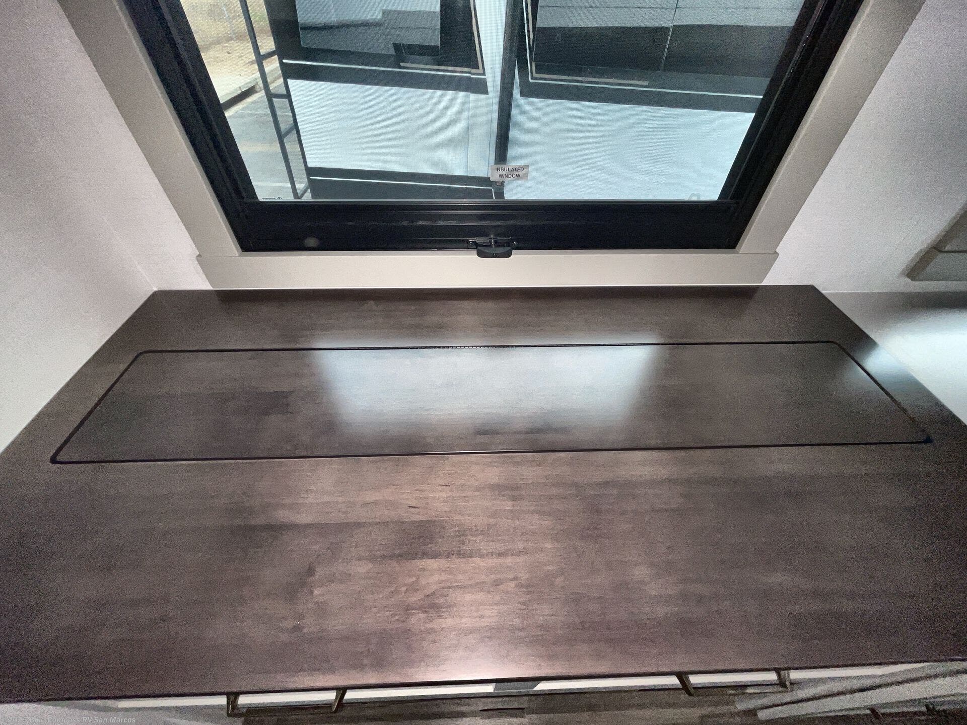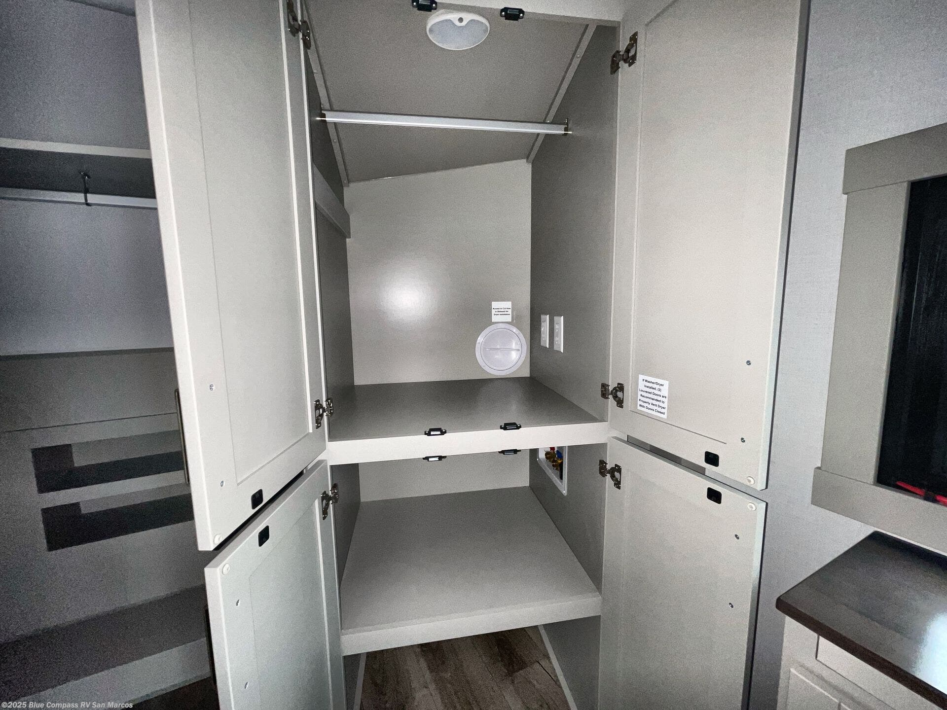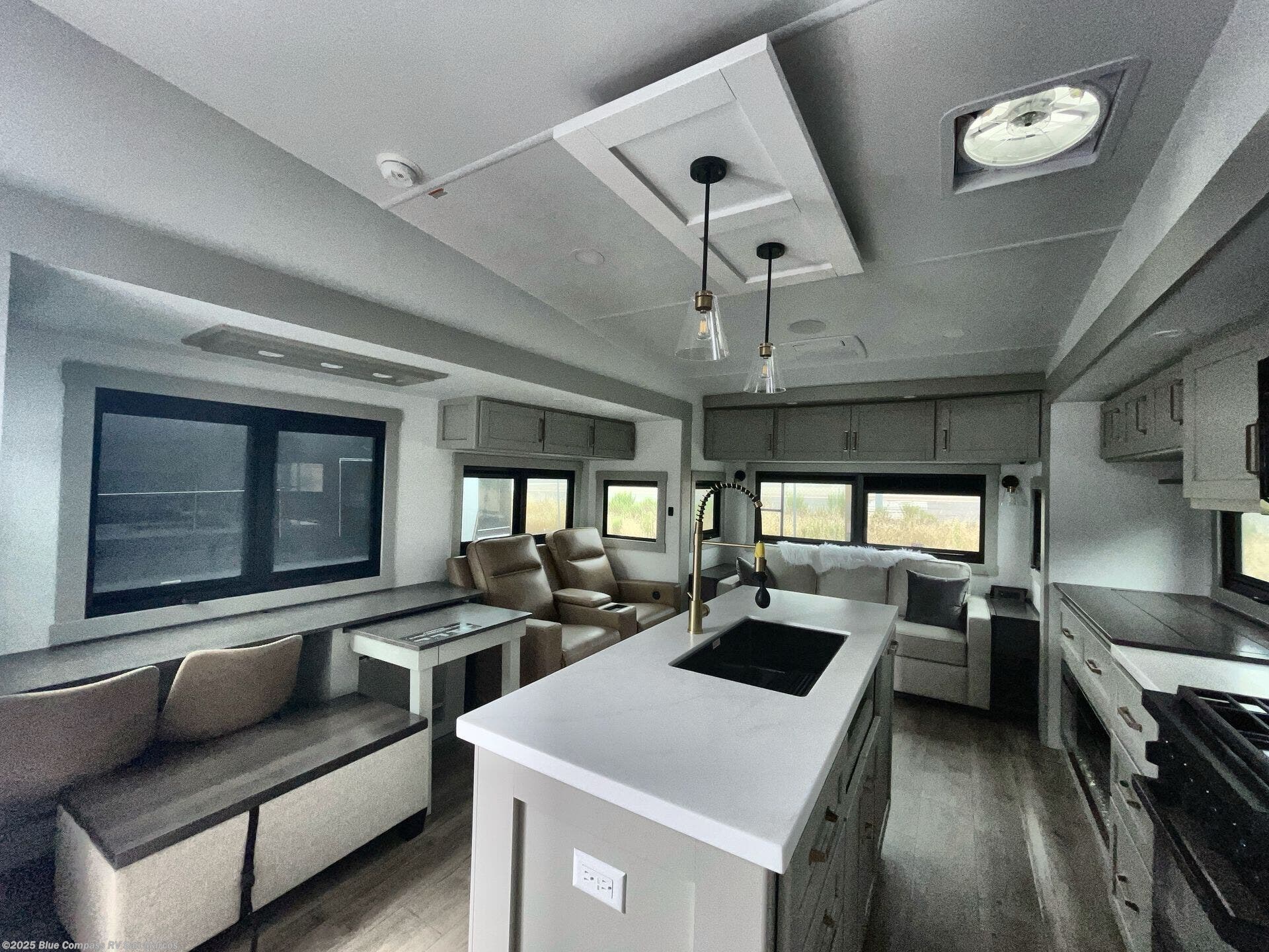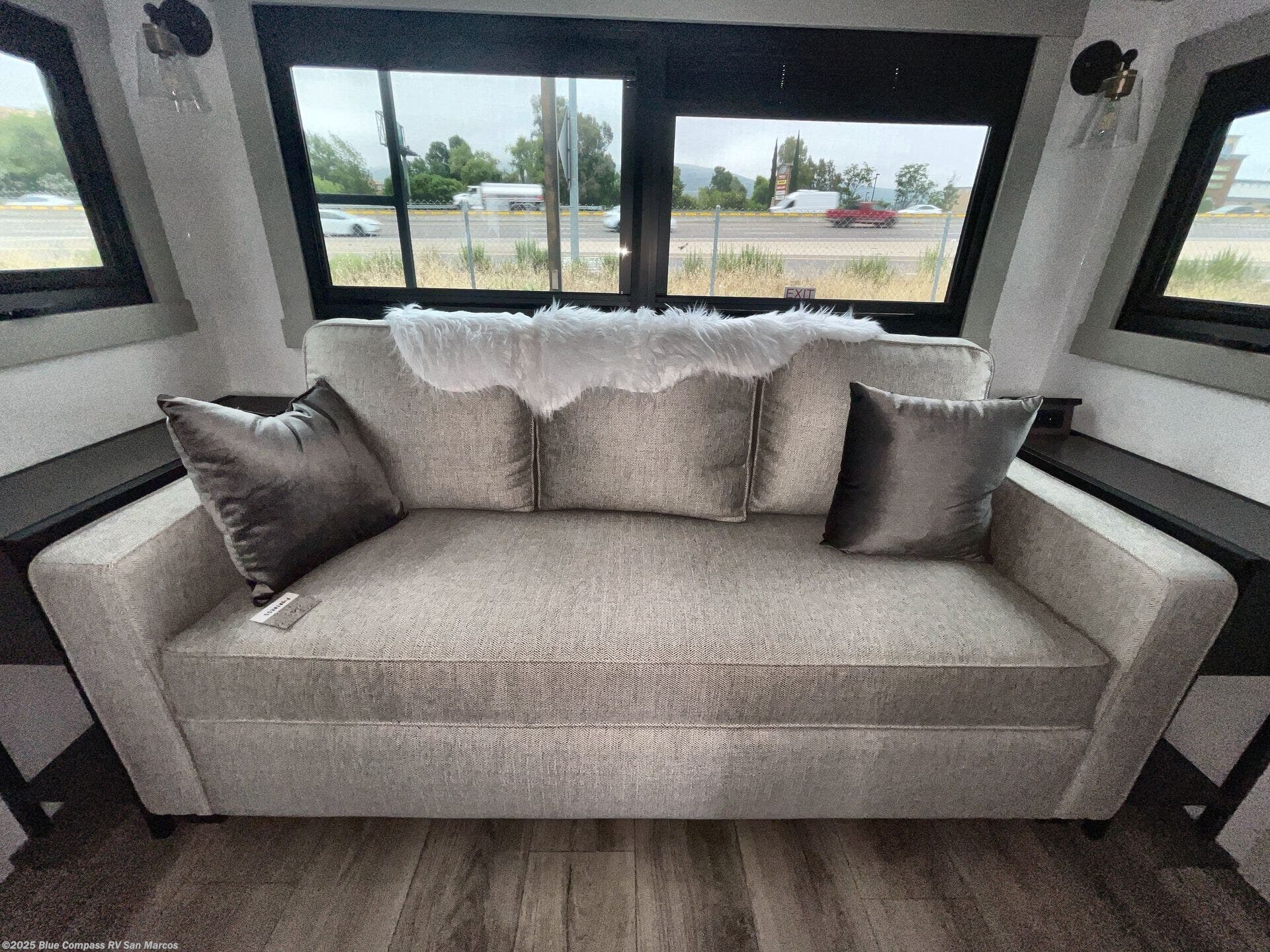 This Model Z luxury fifth wheel is bright and modern on the inside, with loads of amenities that will have you dreaming of your next trip! Enter and find a spacious combined living/kitchen space thanks to dual opposing slides. There is ample seating with a sliding desk/dining table, 62" theater seating, and a 72" tri-fold sofa along the rear wall. You can easily relax and enjoy the 50" Smart telescoping TV with a cozy fireplace below. The kitchen offers all that you need to prepare and cook meals just like home with a 16 cu. ft. refrigerator for your perishables, a 30" microwave oven, and three burner range top and oven. You will love the integrated spice rack, and the kitchen island all outfitted with dog bowls and double pull out trash bins with an integrated Stow 'N Go paper towel holder. There is also an 84" pantry with adjustable shelves for all of your canned and dry goods. Head up the steps to a private master suite with king bed slide. You can opt for the queen bed if you like. A sliding dresser top features hidden storage which is perfect for jewelry and other personal belongings. The front wardrobe features mirrored doors and the corner closet has been prepped for a stackable washer and dryer if you choose to add that option. Relax and enjoy a large bath featuring a linen cabinet, a 30" x 42" shower, and vanity with sink, plus medicine cabinet.