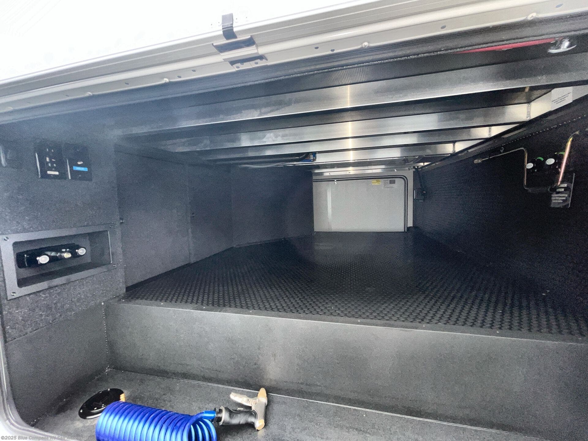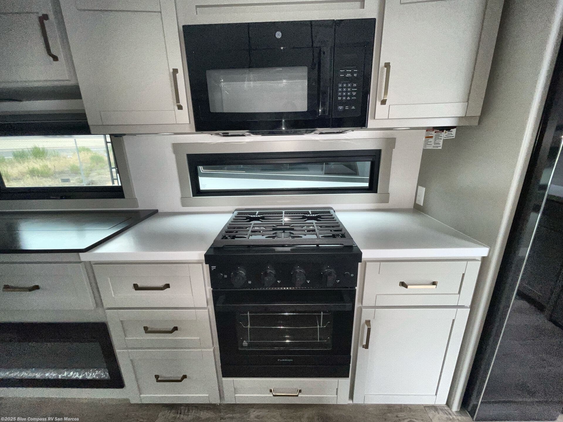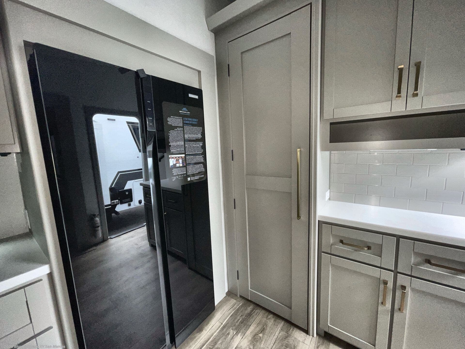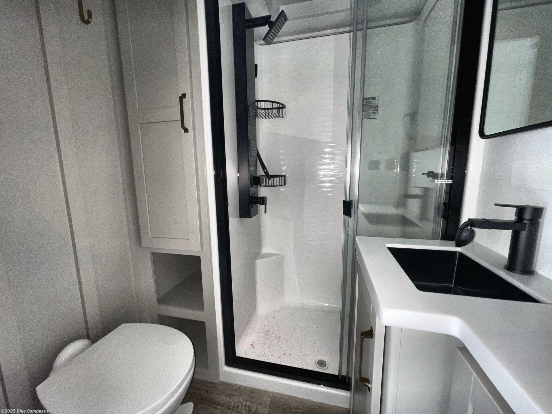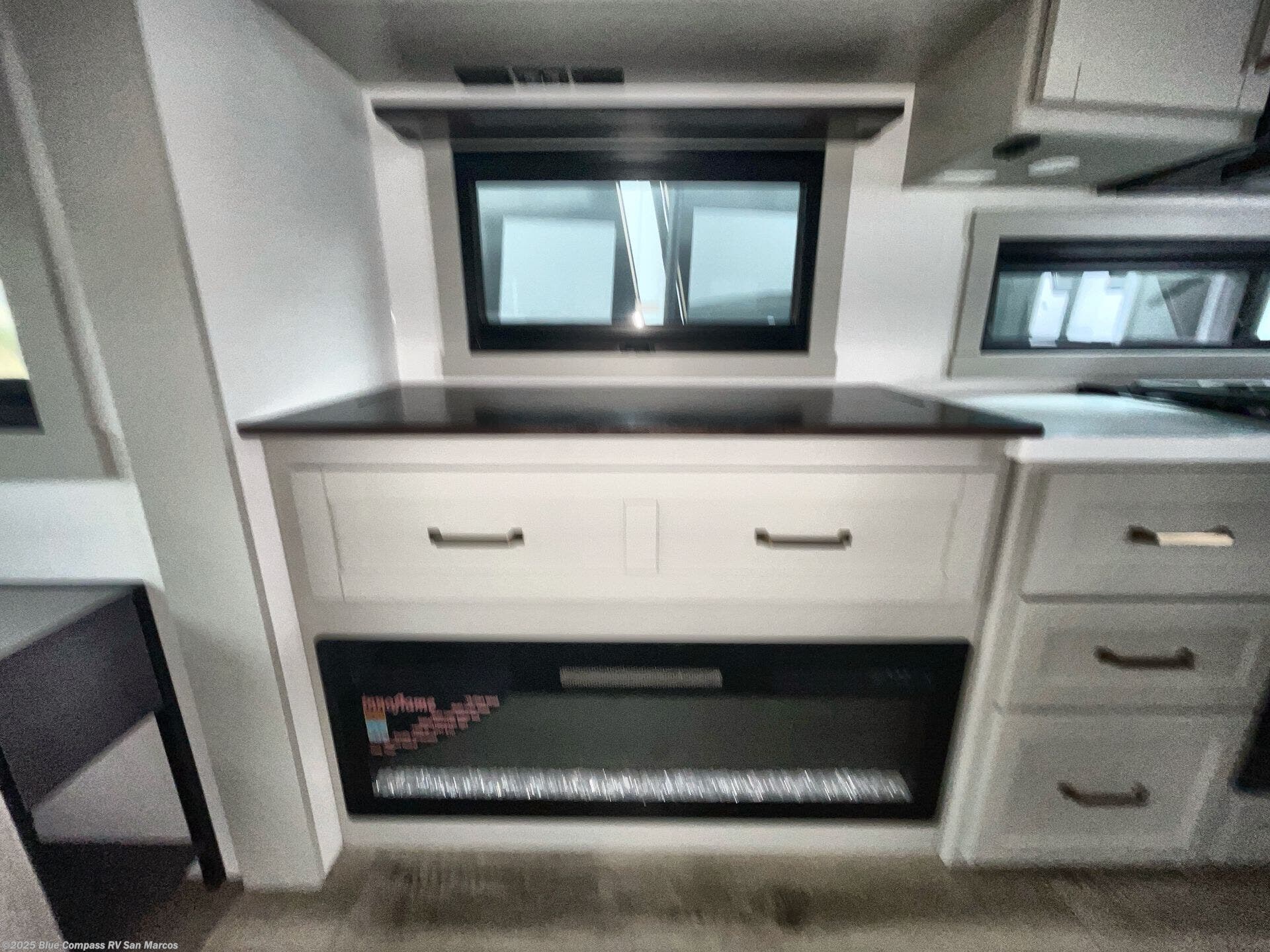 This Model Z luxury fifth wheel is bright and modern on the inside, with loads of amenities that will have you dreaming of your next trip! Enter and find a spacious combined living/kitchen space thanks to dual opposing slides. There is ample seating with a sliding desk/dining table, 62" theater seating, and a 72" tri-fold sofa along the rear wall. You can easily relax and enjoy the 50" Smart telescoping TV with a cozy fireplace below. The kitchen offers all that you need to prepare and cook meals just like home with a 16 cu. ft. refrigerator for your perishables, a 30" microwave oven, and three burner range top and oven. You will love the integrated spice rack, and the kitchen island all outfitted with dog bowls and double pull out trash bins with an integrated Stow 'N Go paper towel holder. There is also an 84" pantry with adjustable shelves for all of your canned and dry goods. Head up the steps to a private master suite with king bed slide. You can opt for the queen bed if you like. A sliding dresser top features hidden storage which is perfect for jewelry and other personal belongings. The front wardrobe features mirrored doors and the corner closet has been prepped for a stackable washer and dryer if you choose to add that option. Relax and enjoy a large bath featuring a linen cabinet, a 30" x 42" shower, and vanity with sink, plus medicine cabinet.