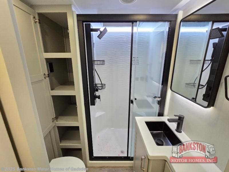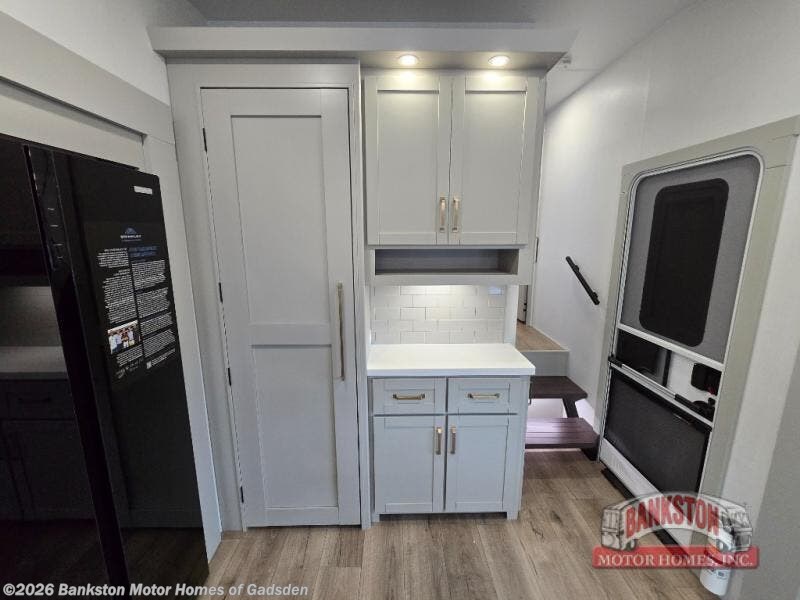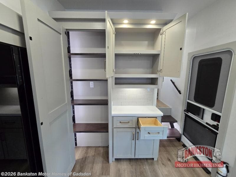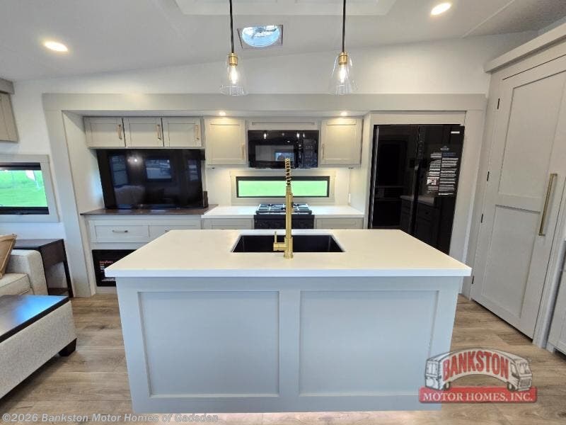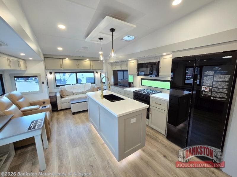 This Model Z luxury fifth wheel is bright and modern on the inside, with loads of amenities that will have you dreaming of your next trip! Enter and find a spacious combined living/kitchen space thanks to dual opposing slides. There is ample seating with a sliding desk/dining table, 62" theater seating, and a 72" tri-fold sofa along the rear wall. You can easily relax and enjoy the 50" Smart telescoping TV with a cozy fireplace below. The kitchen offers all that you need to prepare and cook meals just like home with a 16 cu. ft. refrigerator for your perishables, a 30" microwave oven, and three burner range top and oven. You will love the integrated spice rack, and the kitchen island all outfitted with dog bowls and double pull out trash bins with an integrated Stow 'N Go paper towel holder. There is also an 84" pantry with adjustable shelves for all of your canned and dry goods. Head up the steps to a private master suite with king bed slide. You can opt for the queen bed if you like. A sliding dresser top features hidden storage which is perfect for jewelry and other personal belongings. The front wardrobe features mirrored doors and the corner closet has been prepped for a stackable washer and dryer if you choose to add that option. Relax and enjoy a large bath featuring a linen cabinet, a 30" x 42" shower, and vanity with sink, plus medicine cabinet.