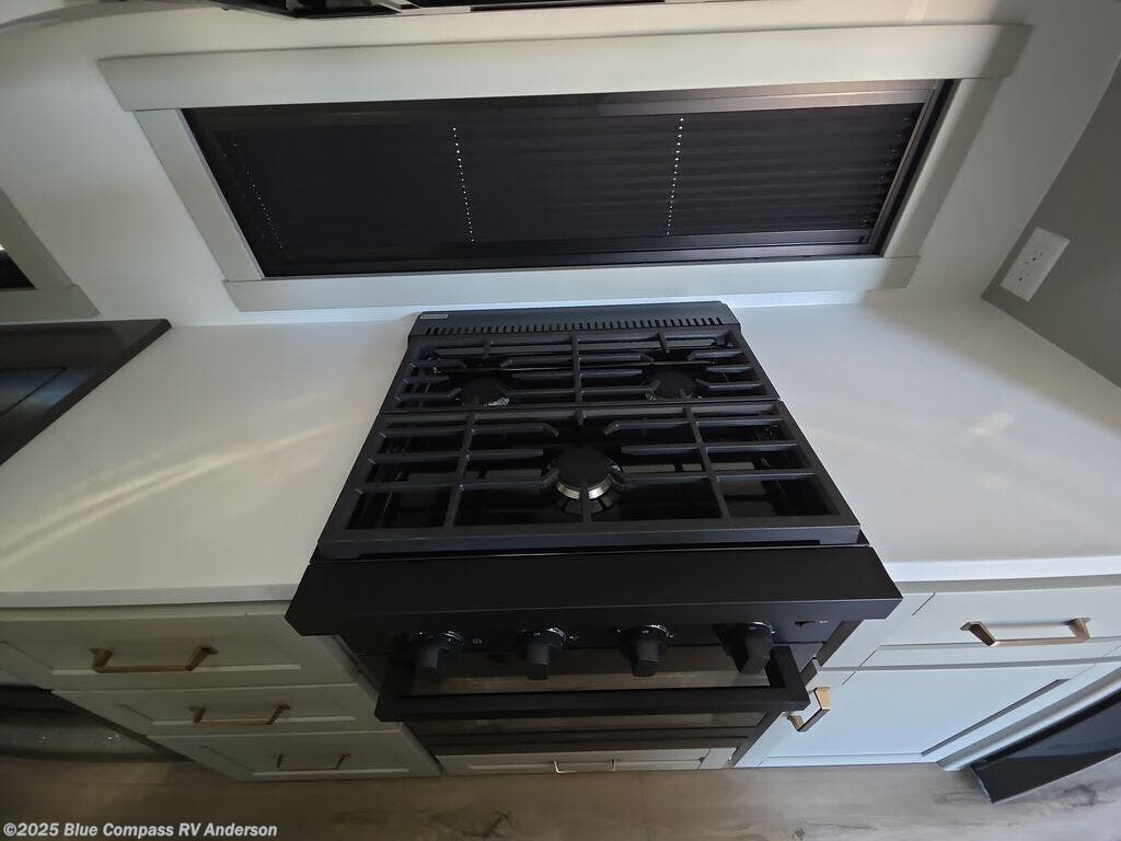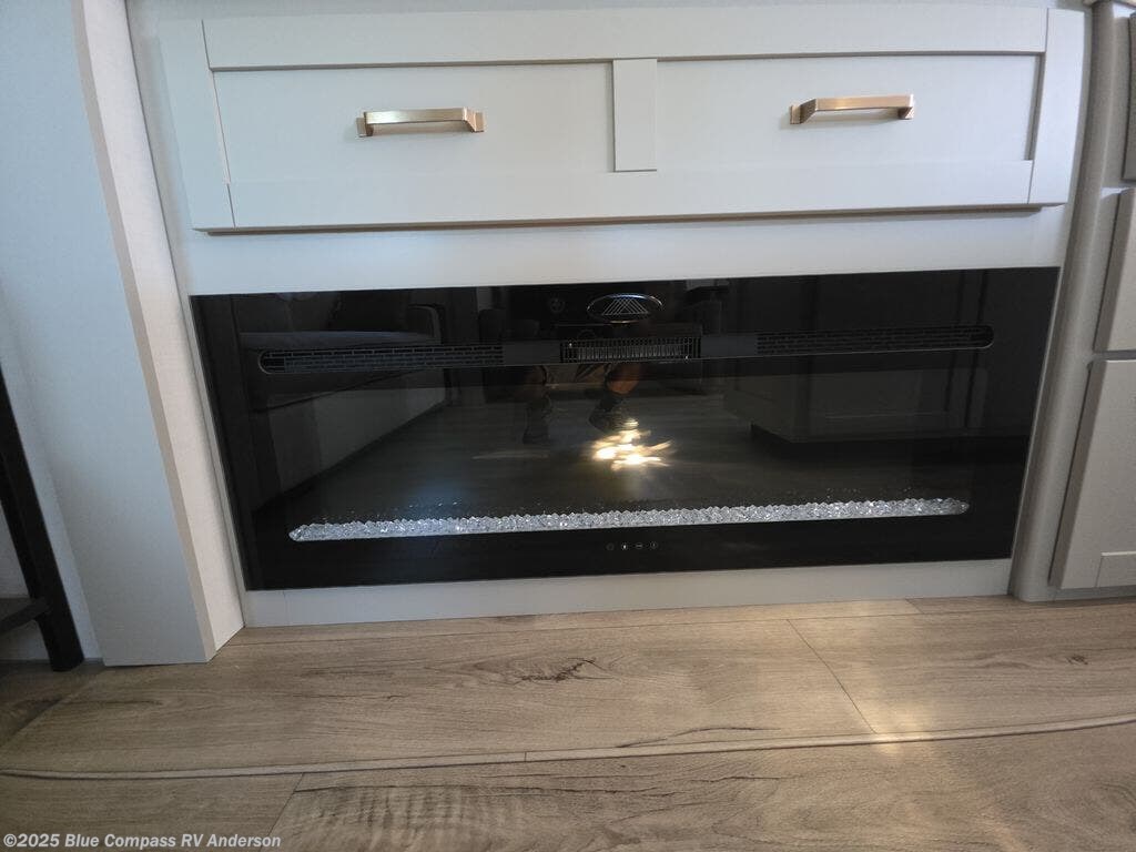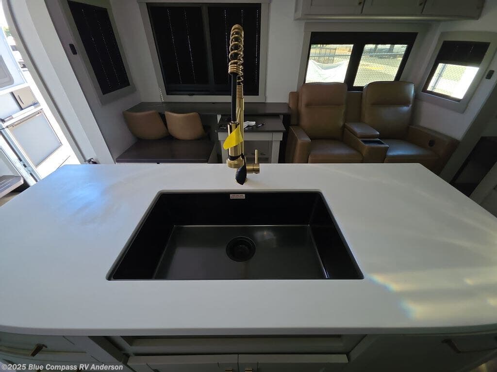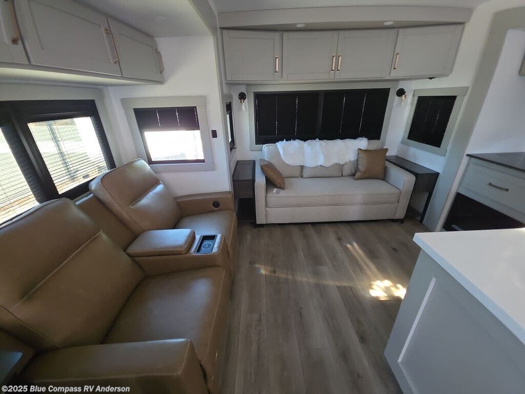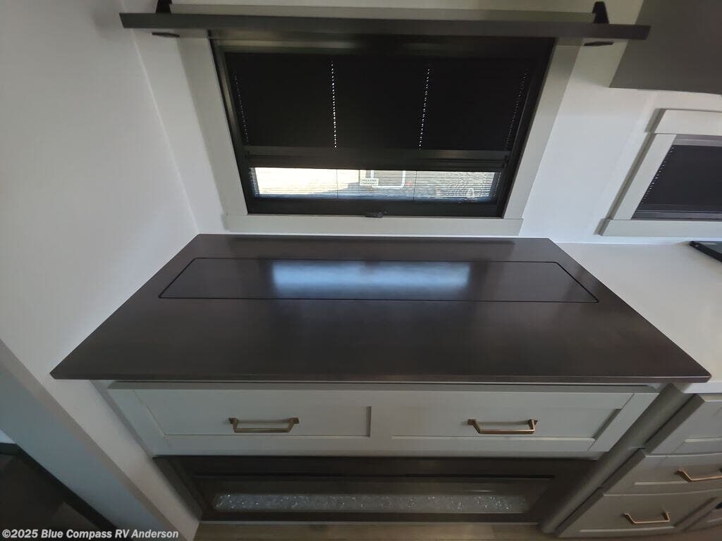 This Model Z luxury fifth wheel is bright and modern on the inside, with loads of amenities that will have you dreaming of your next trip! Enter and find a spacious combined living/kitchen space thanks to dual opposing slides. There is ample seating with a sliding desk/dining table, 62" theater seating, and a 72" tri-fold sofa along the rear wall. You can easily relax and enjoy the 50" Smart telescoping TV with a cozy fireplace below. The kitchen offers all that you need to prepare and cook meals just like home with a 16 cu. ft. refrigerator for your perishables, a 30" microwave oven, and three burner range top and oven. You will love the integrated spice rack, and the kitchen island all outfitted with dog bowls and double pull out trash bins with an integrated Stow 'N Go paper towel holder. There is also an 84" pantry with adjustable shelves for all of your canned and dry goods. Head up the steps to a private master suite with king bed slide. You can opt for the queen bed if you like. A sliding dresser top features hidden storage which is perfect for jewelry and other personal belongings. The front wardrobe features mirrored doors and the corner closet has been prepped for a stackable washer and dryer if you choose to add that option. Relax and enjoy a large bath featuring a linen cabinet, a 30" x 42" shower, and vanity with sink, plus medicine cabinet.
