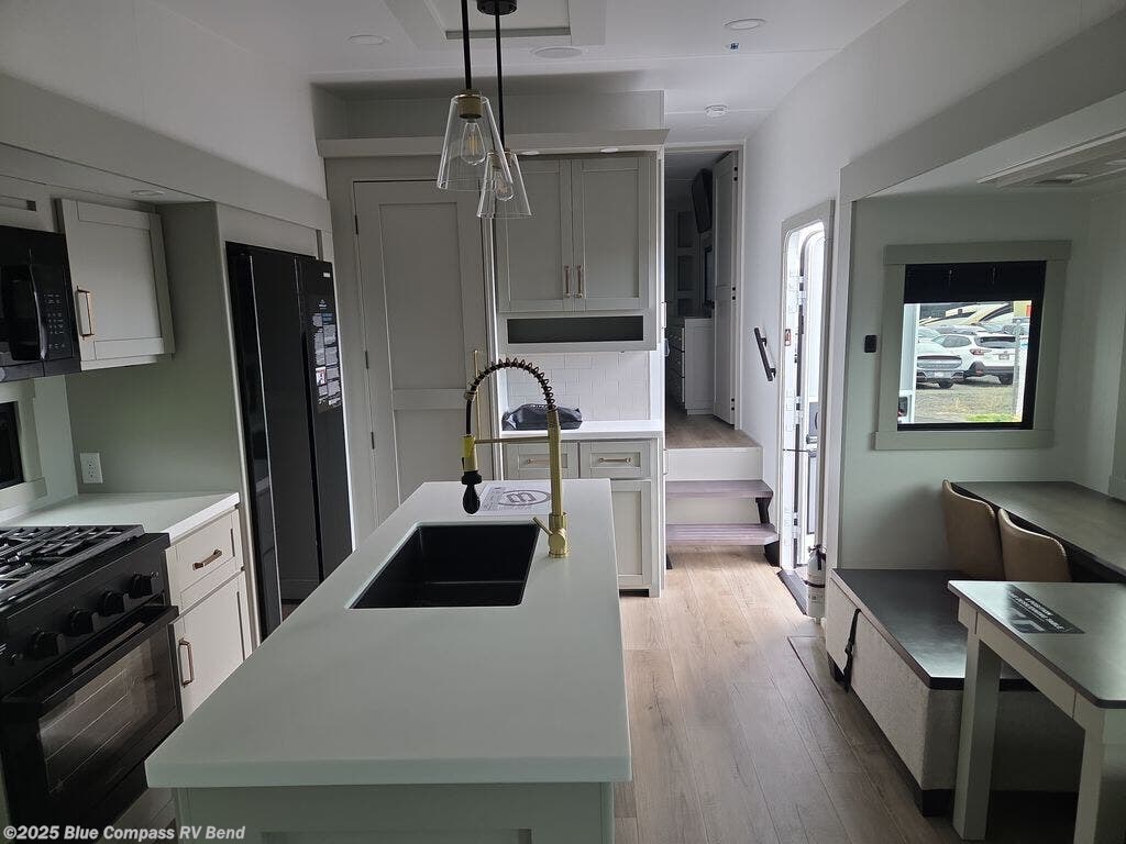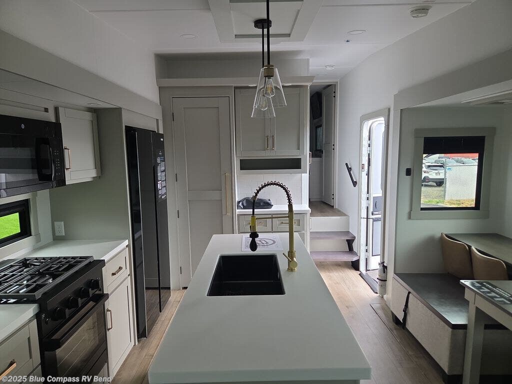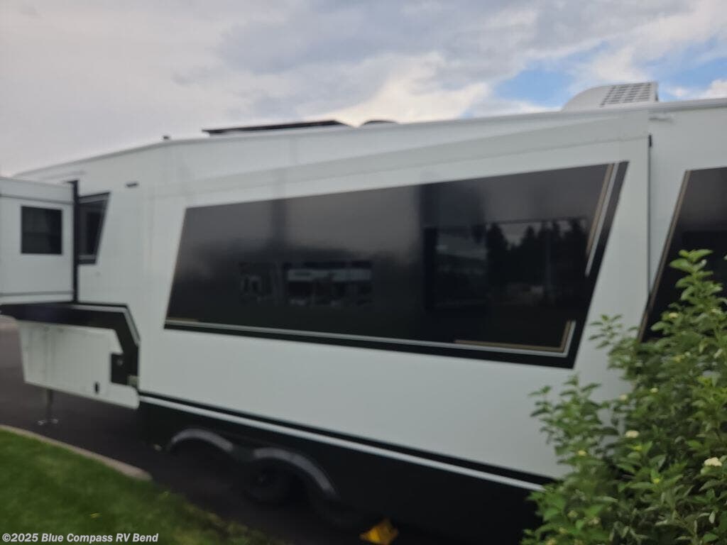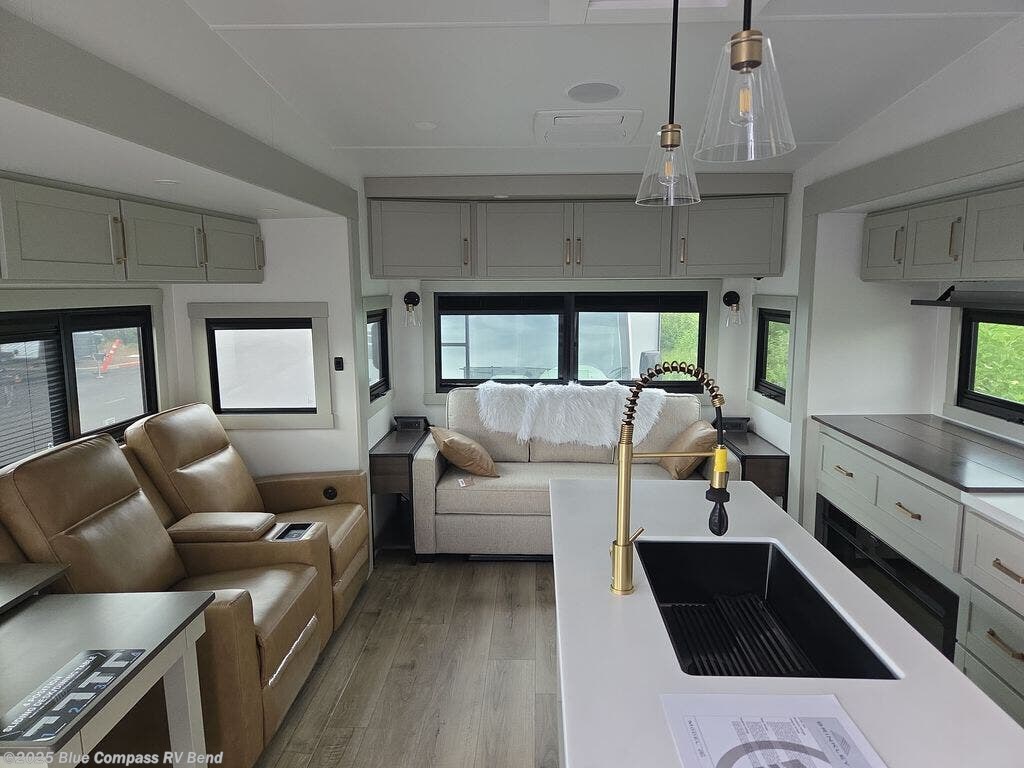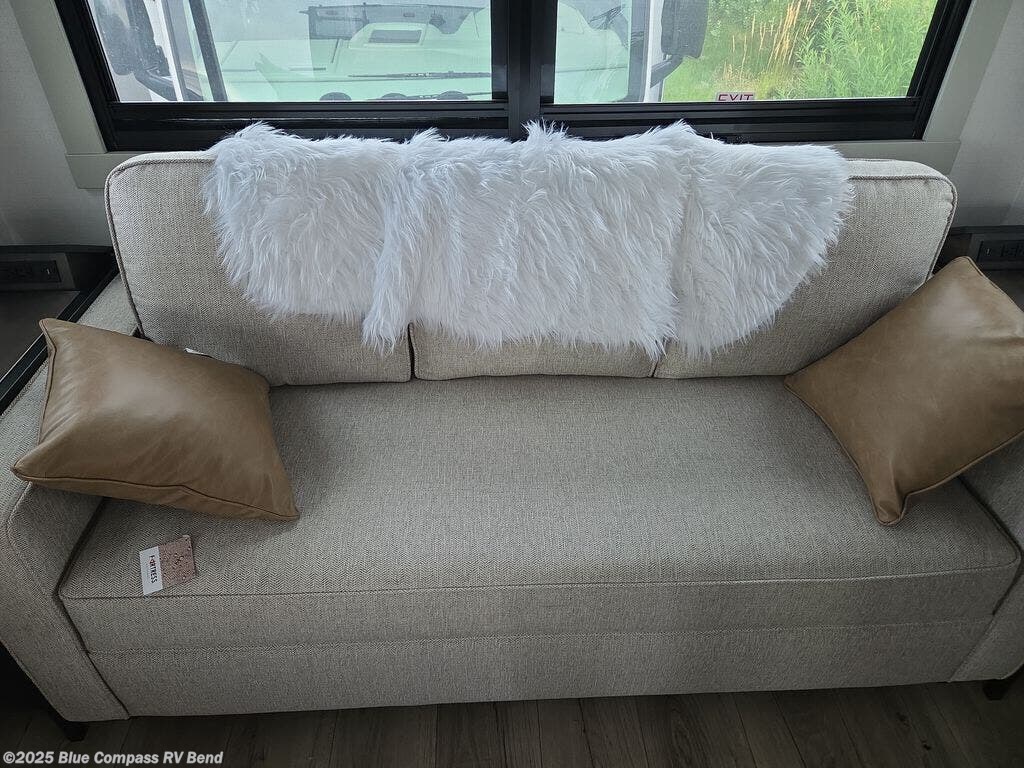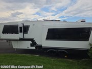 This Model Z luxury fifth wheel is bright and modern on the inside, with loads of amenities that will have you dreaming of your next trip! Enter and find a spacious combined living/kitchen space thanks to dual opposing slides. There is ample seating with a sliding desk/dining table, 62" theater seating, and a 72" tri-fold sofa along the rear wall. You can easily relax and enjoy the 50" Smart telescoping TV with a cozy fireplace below. The kitchen offers all that you need to prepare and cook meals just like home with a 16 cu. ft. refrigerator for your perishables, a 30" microwave oven, and three burner range top and oven. You will love the integrated spice rack, and the kitchen island all outfitted with dog bowls and double pull out trash bins with an integrated Stow 'N Go paper towel holder. There is also an 84" pantry with adjustable shelves for all of your canned and dry goods. Head up the steps to a private master suite with king bed slide. You can opt for the queen bed if you like. A sliding dresser top features hidden storage which is perfect for jewelry and other personal belongings. The front wardrobe features mirrored doors and the corner closet has been prepped for a stackable washer and dryer if you choose to add that option. Relax and enjoy a large bath featuring a linen cabinet, a 30" x 42" shower, and vanity with sink, plus medicine cabinet.