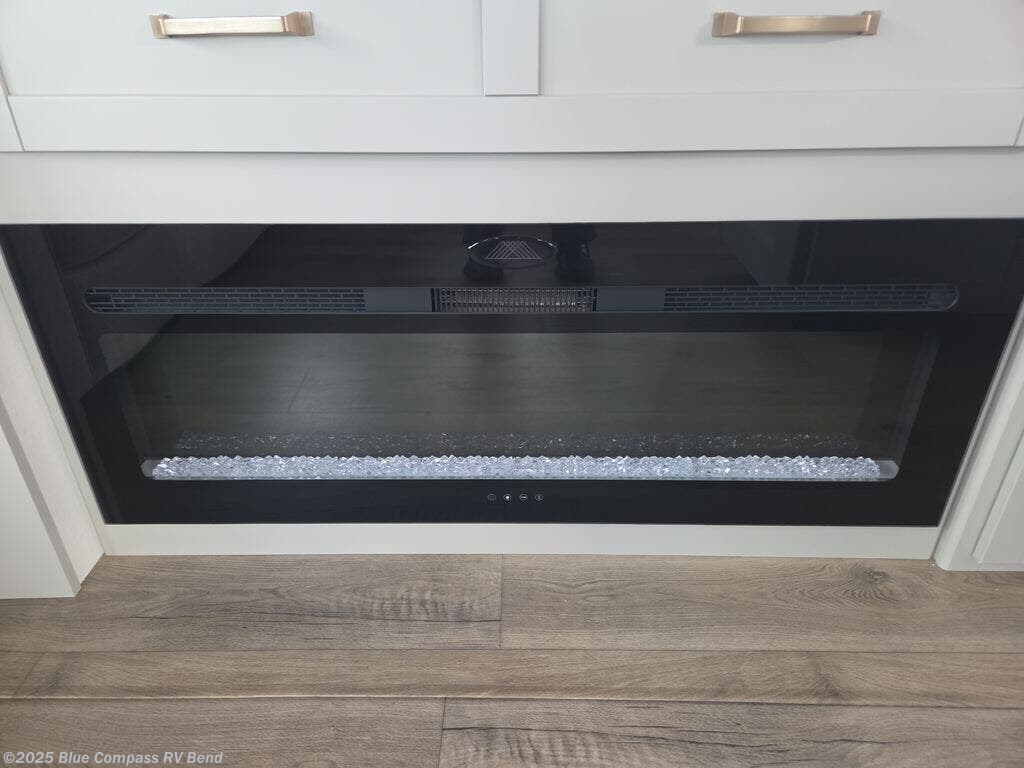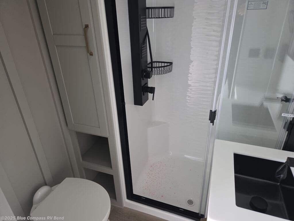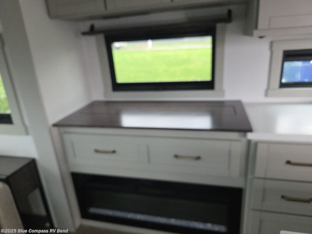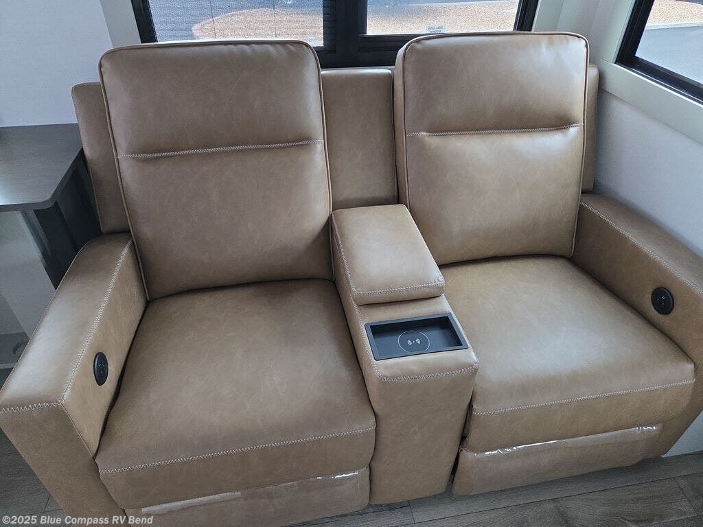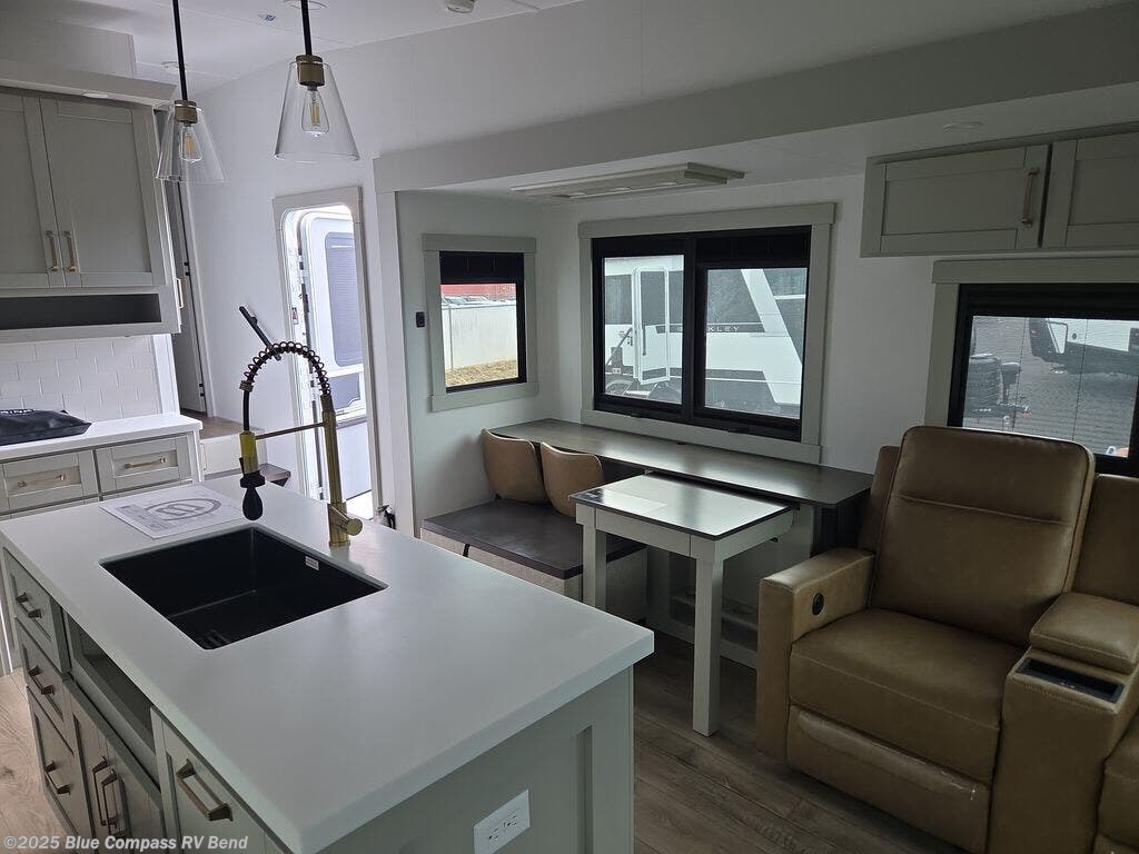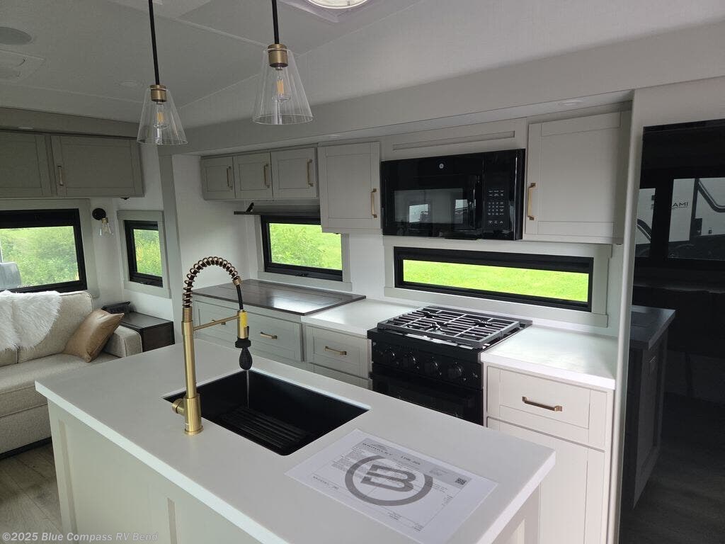 This Model Z luxury fifth wheel is bright and modern on the inside, with loads of amenities that will have you dreaming of your next trip! Enter and find a spacious combined living/kitchen space thanks to dual opposing slides. There is ample seating with a sliding desk/dining table, 62" theater seating, and a 72" tri-fold sofa along the rear wall. You can easily relax and enjoy the 50" Smart telescoping TV with a cozy fireplace below. The kitchen offers all that you need to prepare and cook meals just like home with a 16 cu. ft. refrigerator for your perishables, a 30" microwave oven, and three burner range top and oven. You will love the integrated spice rack, and the kitchen island all outfitted with dog bowls and double pull out trash bins with an integrated Stow 'N Go paper towel holder. There is also an 84" pantry with adjustable shelves for all of your canned and dry goods. Head up the steps to a private master suite with king bed slide. You can opt for the queen bed if you like. A sliding dresser top features hidden storage which is perfect for jewelry and other personal belongings. The front wardrobe features mirrored doors and the corner closet has been prepped for a stackable washer and dryer if you choose to add that option. Relax and enjoy a large bath featuring a linen cabinet, a 30" x 42" shower, and vanity with sink, plus medicine cabinet.