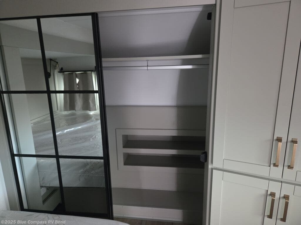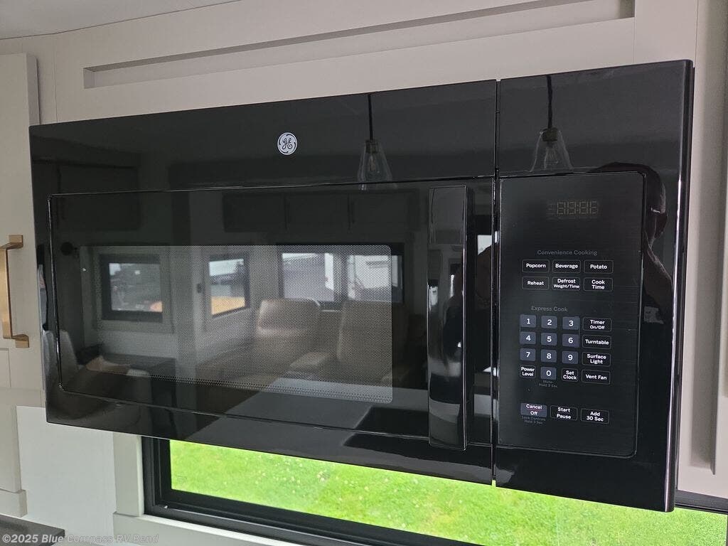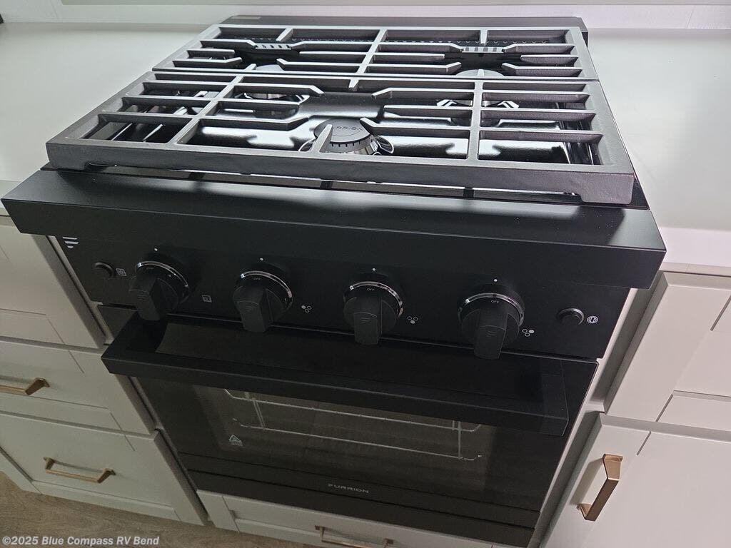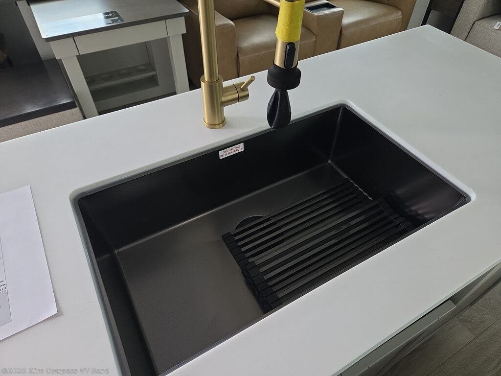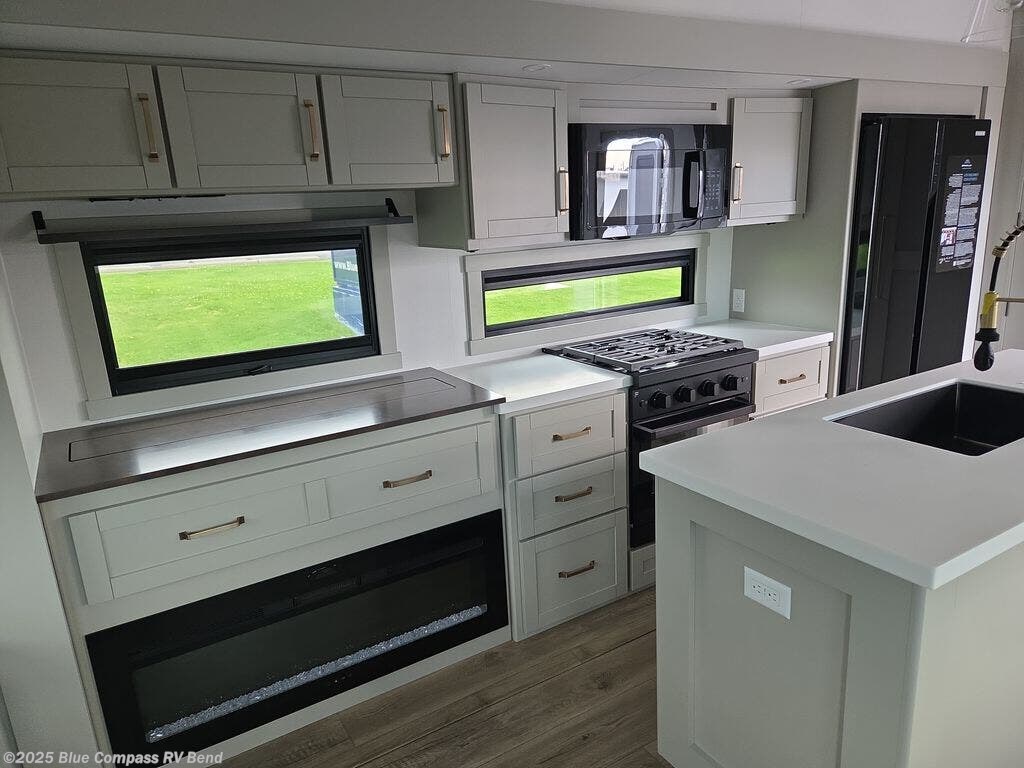 This Model Z luxury fifth wheel is bright and modern on the inside, with loads of amenities that will have you dreaming of your next trip! Enter and find a spacious combined living/kitchen space thanks to dual opposing slides. There is ample seating with a sliding desk/dining table, 62" theater seating, and a 72" tri-fold sofa along the rear wall. You can easily relax and enjoy the 50" Smart telescoping TV with a cozy fireplace below. The kitchen offers all that you need to prepare and cook meals just like home with a 16 cu. ft. refrigerator for your perishables, a 30" microwave oven, and three burner range top and oven. You will love the integrated spice rack, and the kitchen island all outfitted with dog bowls and double pull out trash bins with an integrated Stow 'N Go paper towel holder. There is also an 84" pantry with adjustable shelves for all of your canned and dry goods. Head up the steps to a private master suite with king bed slide. You can opt for the queen bed if you like. A sliding dresser top features hidden storage which is perfect for jewelry and other personal belongings. The front wardrobe features mirrored doors and the corner closet has been prepped for a stackable washer and dryer if you choose to add that option. Relax and enjoy a large bath featuring a linen cabinet, a 30" x 42" shower, and vanity with sink, plus medicine cabinet.