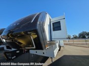 This Model Z luxury fifth wheel is bright and modern on the inside, with loads of amenities that will have you dreaming of your next trip! Enter and find a spacious combined living/kitchen space thanks to dual opposing slides. There is ample seating with a sliding desk/dining table, 62" theater seating, and a 72" tri-fold sofa along the rear wall. You can easily relax and enjoy the 50" Smart telescoping TV with a cozy fireplace below. The kitchen offers all that you need to prepare and cook meals just like home with a 16 cu. ft. refrigerator for your perishables, a 30" microwave oven, and three burner range top and oven. You will love the integrated spice rack, and the kitchen island all outfitted with dog bowls and double pull out trash bins with an integrated Stow 'N Go paper towel holder. There is also an 84" pantry with adjustable shelves for all of your canned and dry goods. Head up the steps to a private master suite with king bed slide. You can opt for the queen bed if you like. A sliding dresser top features hidden storage which is perfect for jewelry and other personal belongings. The front wardrobe features mirrored doors and the corner closet has been prepped for a stackable washer and dryer if you choose to add that option. Relax and enjoy a large bath featuring a linen cabinet, a 30" x 42" shower, and vanity with sink, plus medicine cabinet.