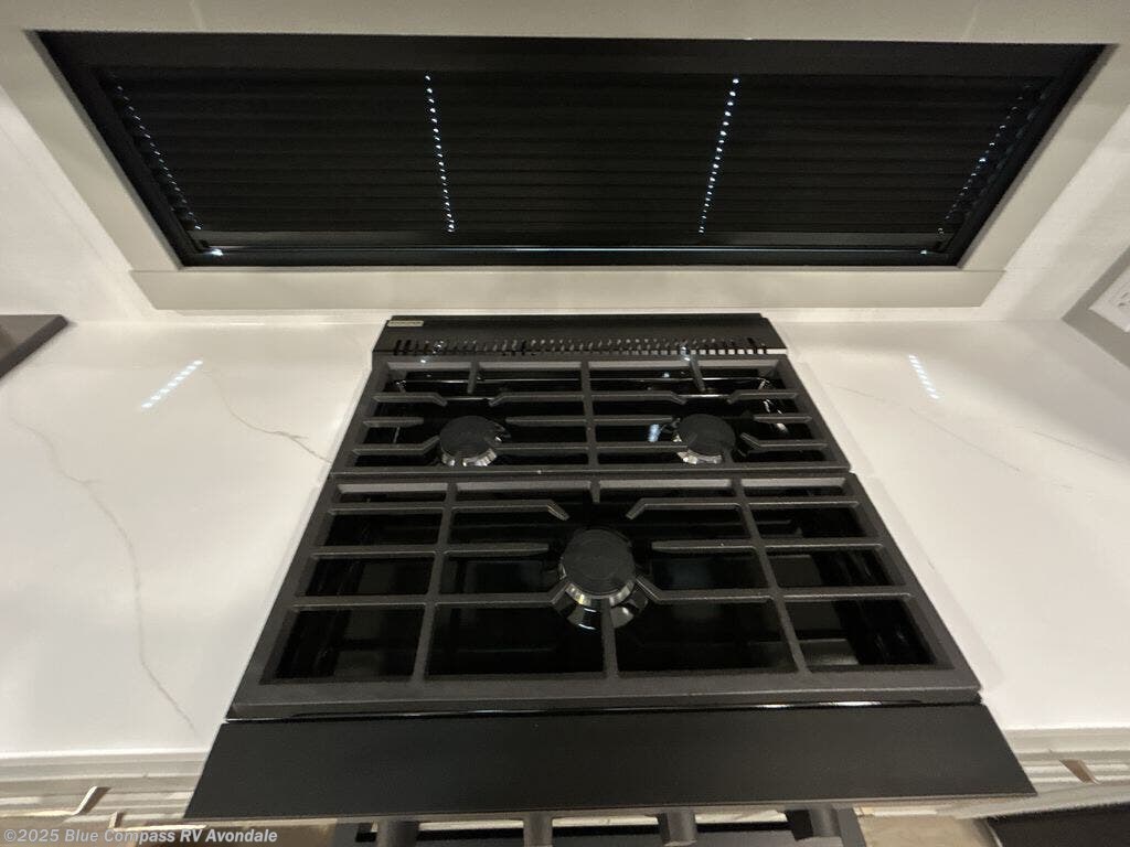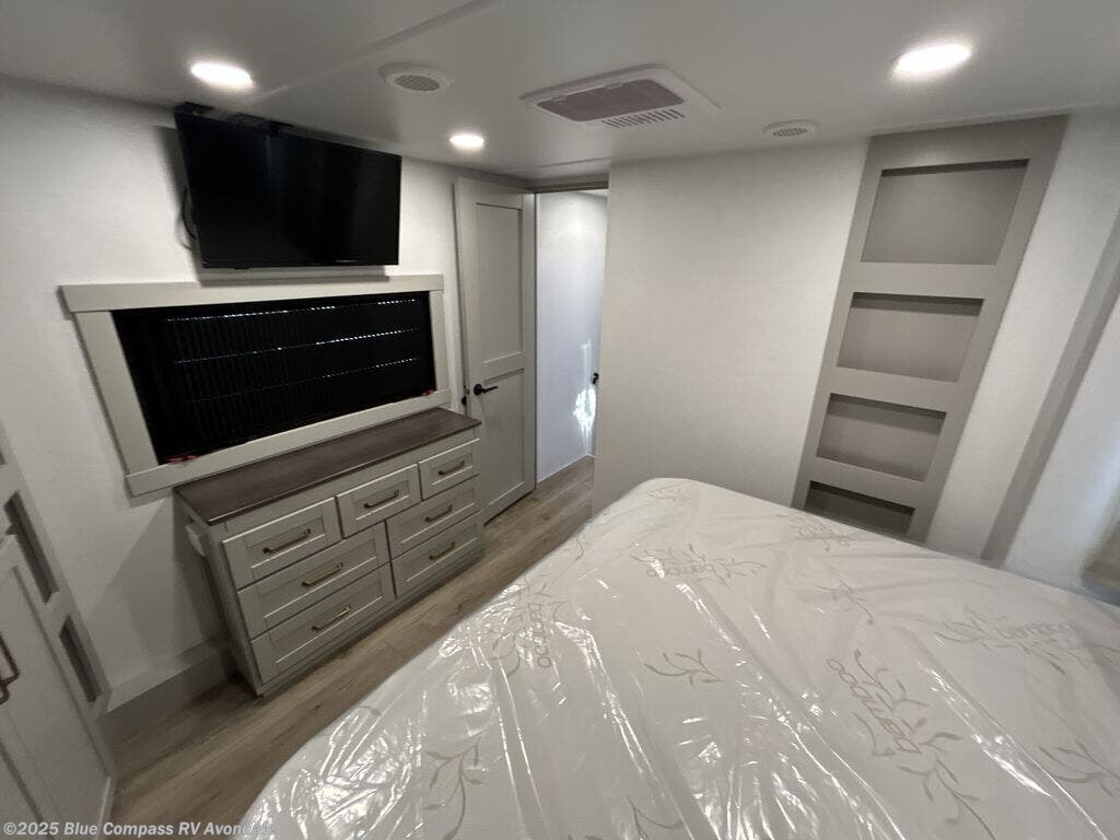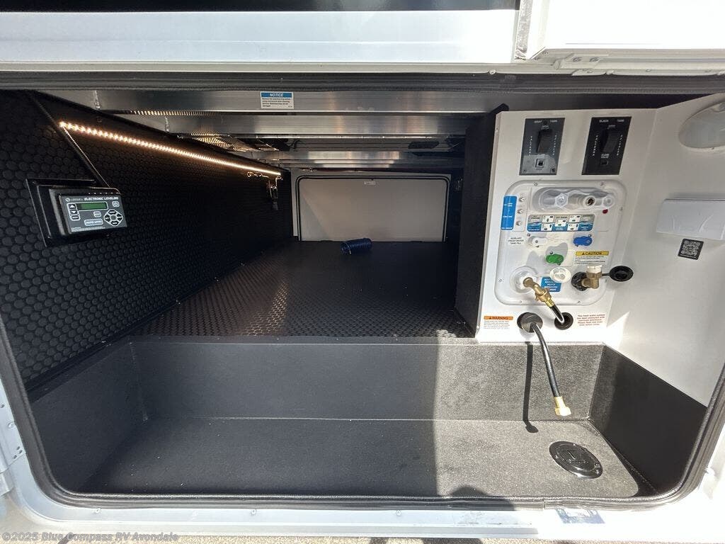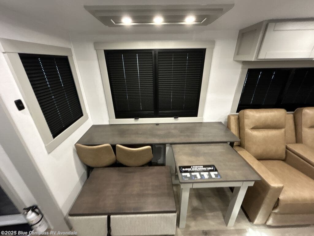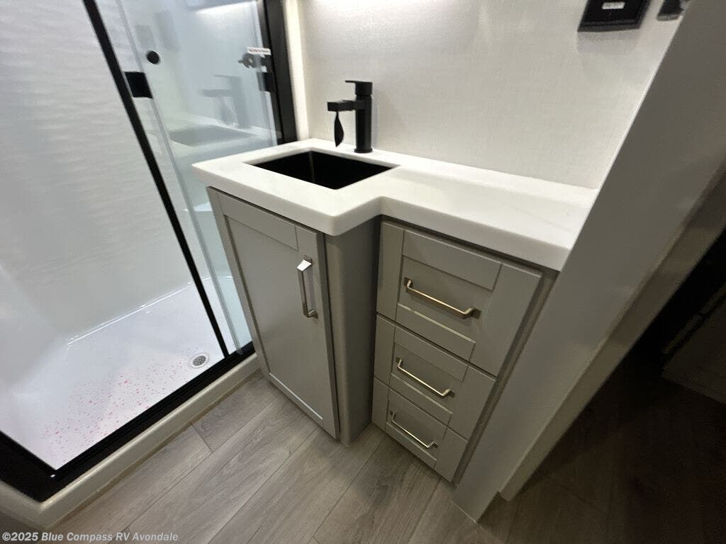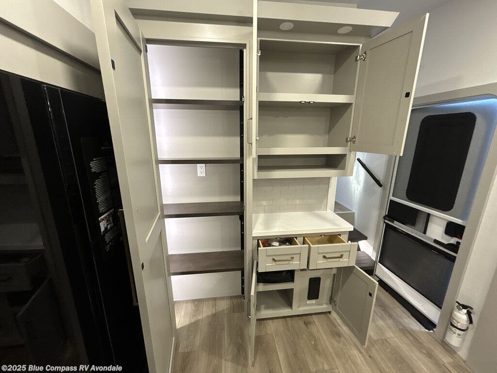 This Model Z luxury fifth wheel is bright and modern on the inside, with loads of amenities that will have you dreaming of your next trip! Enter and find a spacious combined living/kitchen space thanks to dual opposing slides. There is ample seating with a sliding desk/dining table, 62" theater seating, and a 72" tri-fold sofa along the rear wall. You can easily relax and enjoy the 50" Smart telescoping TV with a cozy fireplace below. The kitchen offers all that you need to prepare and cook meals just like home with a 16 cu. ft. refrigerator for your perishables, a 30" microwave oven, and three burner range top and oven. You will love the integrated spice rack, and the kitchen island all outfitted with dog bowls and double pull out trash bins with an integrated Stow 'N Go paper towel holder. There is also an 84" pantry with adjustable shelves for all of your canned and dry goods. Head up the steps to a private master suite with king bed slide. You can opt for the queen bed if you like. A sliding dresser top features hidden storage which is perfect for jewelry and other personal belongings. The front wardrobe features mirrored doors and the corner closet has been prepped for a stackable washer and dryer if you choose to add that option. Relax and enjoy a large bath featuring a linen cabinet, a 30" x 42" shower, and vanity with sink, plus medicine cabinet.