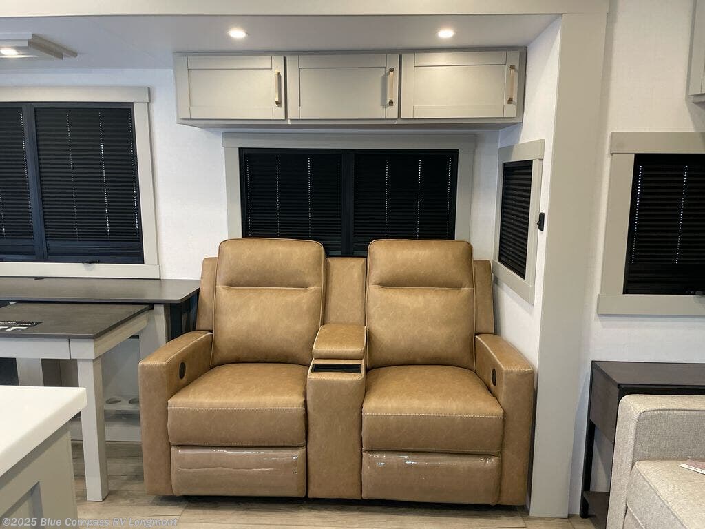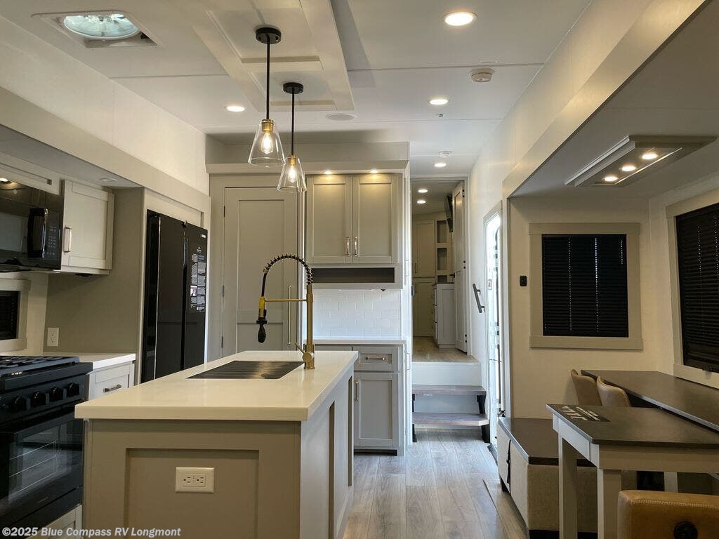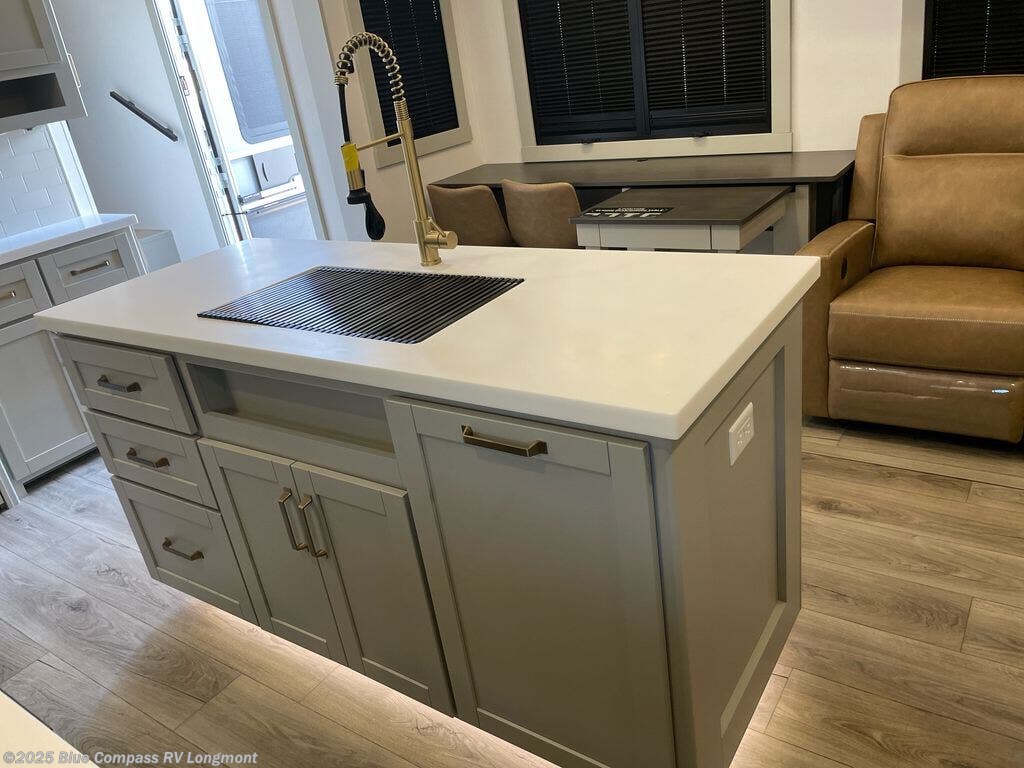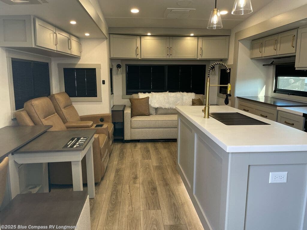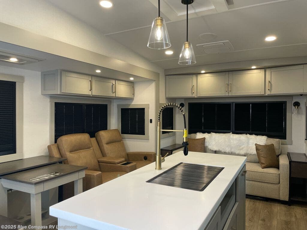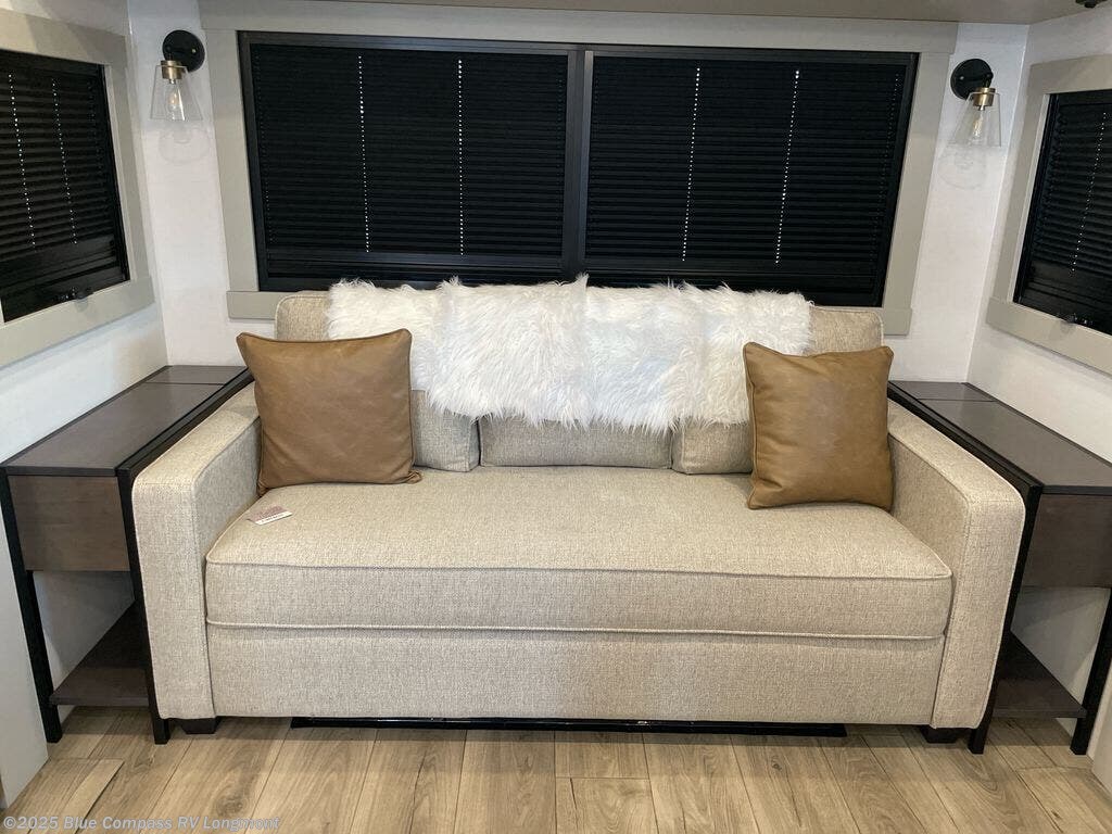 This Model Z luxury fifth wheel is bright and modern on the inside, with loads of amenities that will have you dreaming of your next trip! Enter and find a spacious combined living/kitchen space thanks to dual opposing slides. There is ample seating with a sliding desk/dining table, 62" theater seating, and a 72" tri-fold sofa along the rear wall. You can easily relax and enjoy the 50" Smart telescoping TV with a cozy fireplace below. The kitchen offers all that you need to prepare and cook meals just like home with a 16 cu. ft. refrigerator for your perishables, a 30" microwave oven, and three burner range top and oven. You will love the integrated spice rack, and the kitchen island all outfitted with dog bowls and double pull out trash bins with an integrated Stow 'N Go paper towel holder. There is also an 84" pantry with adjustable shelves for all of your canned and dry goods. Head up the steps to a private master suite with king bed slide. You can opt for the queen bed if you like. A sliding dresser top features hidden storage which is perfect for jewelry and other personal belongings. The front wardrobe features mirrored doors and the corner closet has been prepped for a stackable washer and dryer if you choose to add that option. Relax and enjoy a large bath featuring a linen cabinet, a 30" x 42" shower, and vanity with sink, plus medicine cabinet.