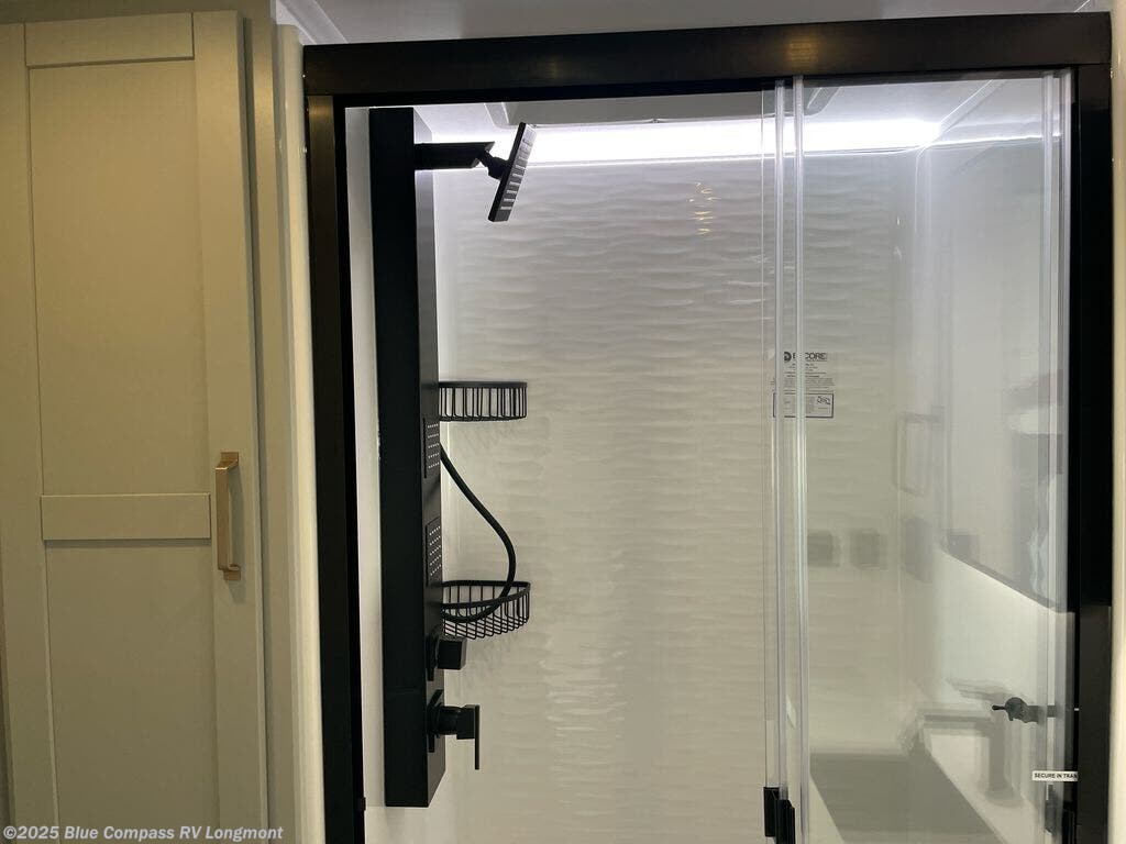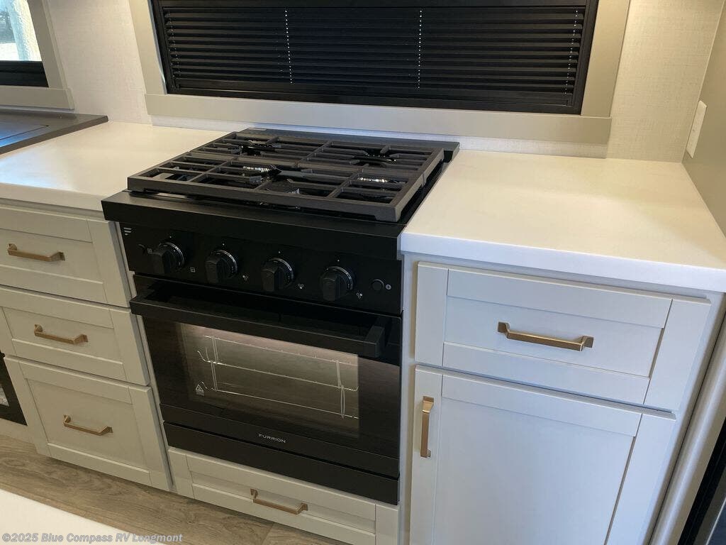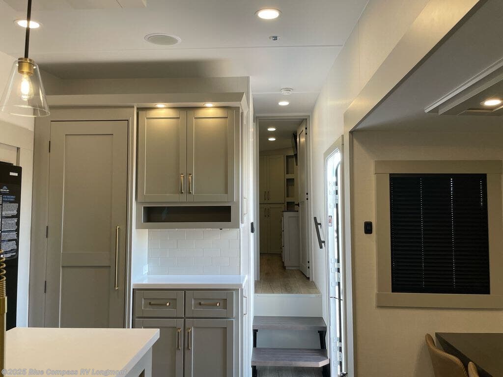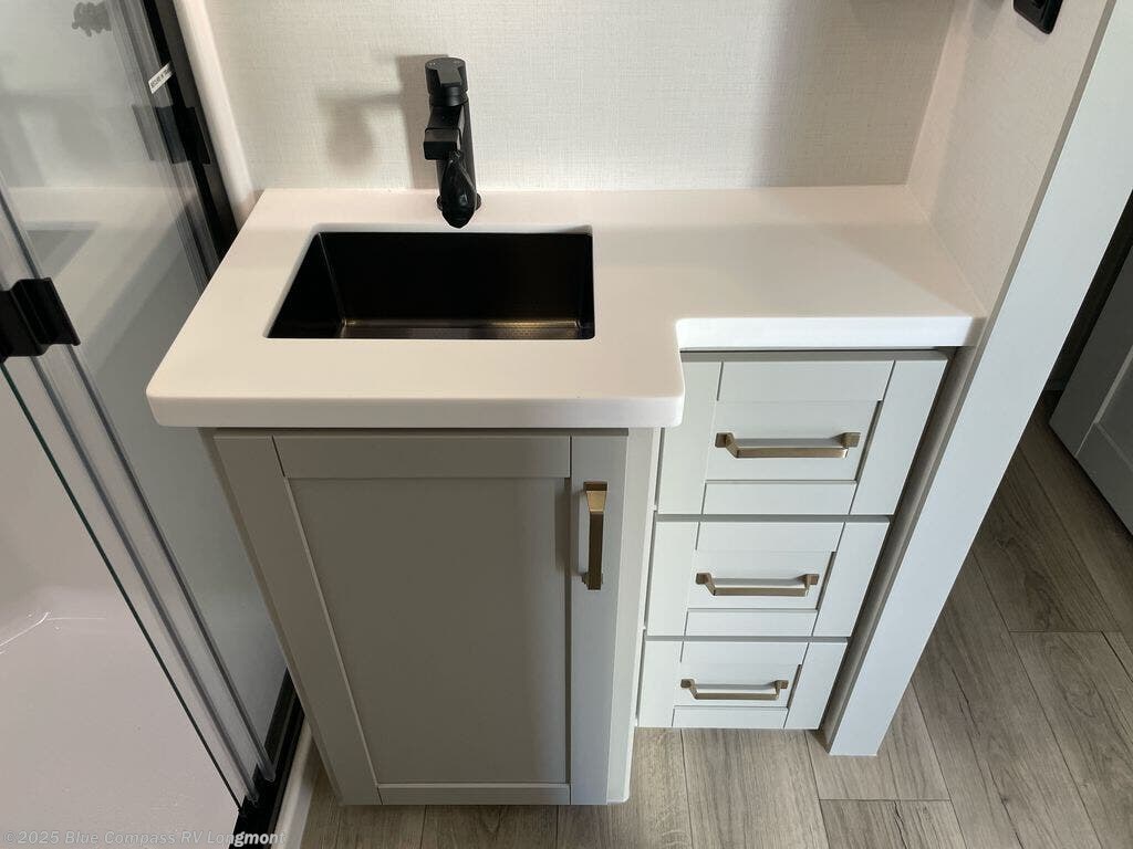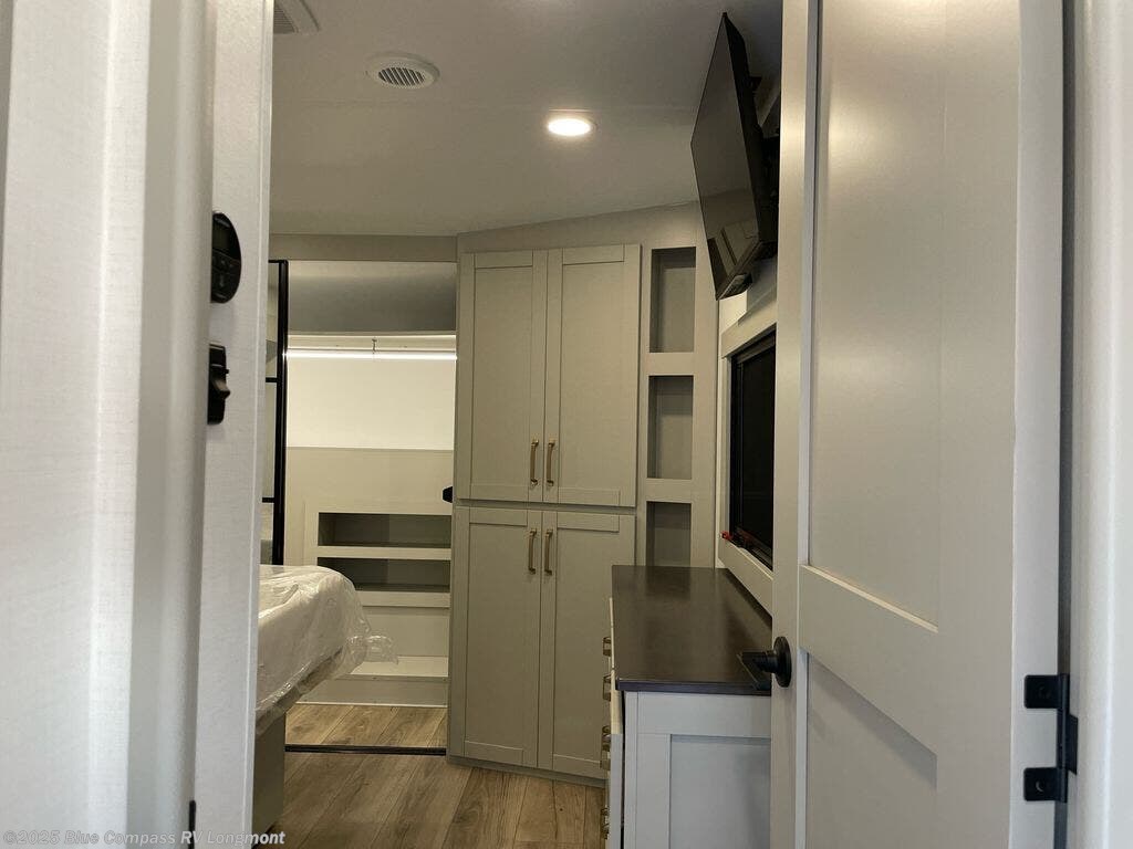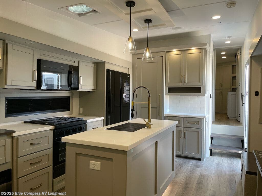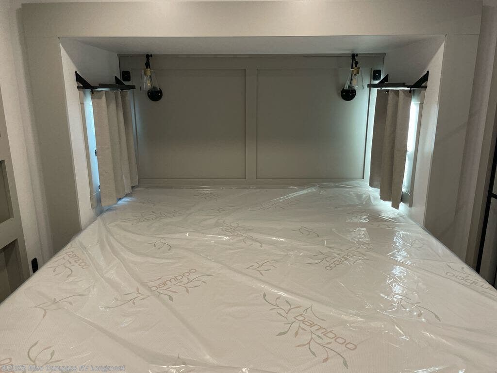 This Model Z luxury fifth wheel is bright and modern on the inside, with loads of amenities that will have you dreaming of your next trip! Enter and find a spacious combined living/kitchen space thanks to dual opposing slides. There is ample seating with a sliding desk/dining table, 62" theater seating, and a 72" tri-fold sofa along the rear wall. You can easily relax and enjoy the 50" Smart telescoping TV with a cozy fireplace below. The kitchen offers all that you need to prepare and cook meals just like home with a 16 cu. ft. refrigerator for your perishables, a 30" microwave oven, and three burner range top and oven. You will love the integrated spice rack, and the kitchen island all outfitted with dog bowls and double pull out trash bins with an integrated Stow 'N Go paper towel holder. There is also an 84" pantry with adjustable shelves for all of your canned and dry goods. Head up the steps to a private master suite with king bed slide. You can opt for the queen bed if you like. A sliding dresser top features hidden storage which is perfect for jewelry and other personal belongings. The front wardrobe features mirrored doors and the corner closet has been prepped for a stackable washer and dryer if you choose to add that option. Relax and enjoy a large bath featuring a linen cabinet, a 30" x 42" shower, and vanity with sink, plus medicine cabinet.