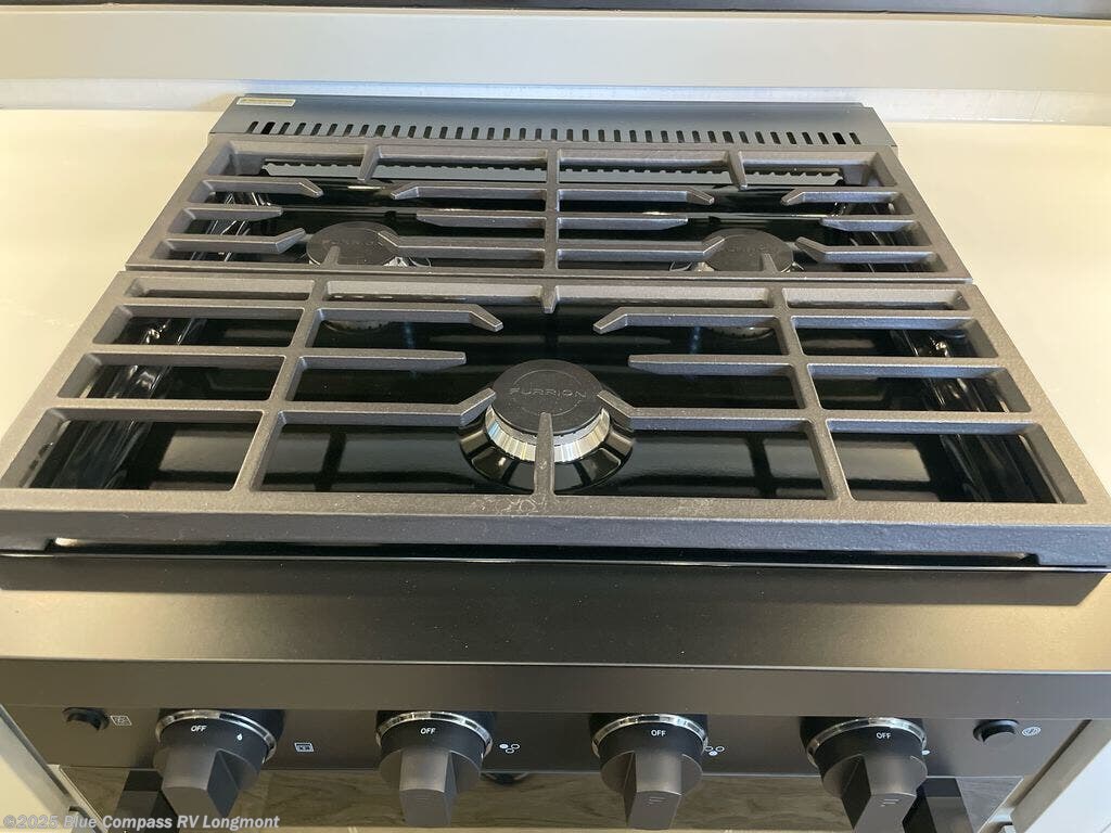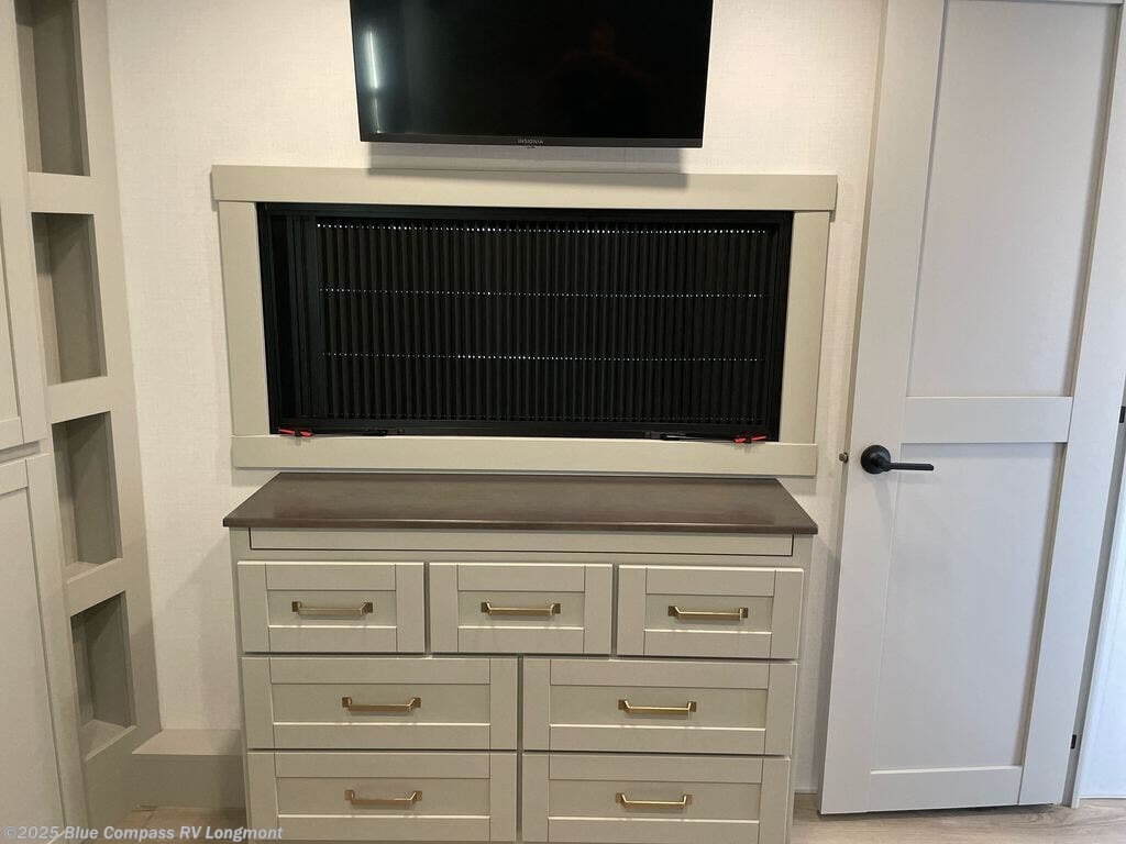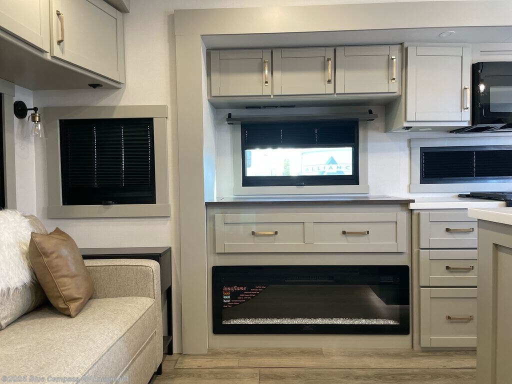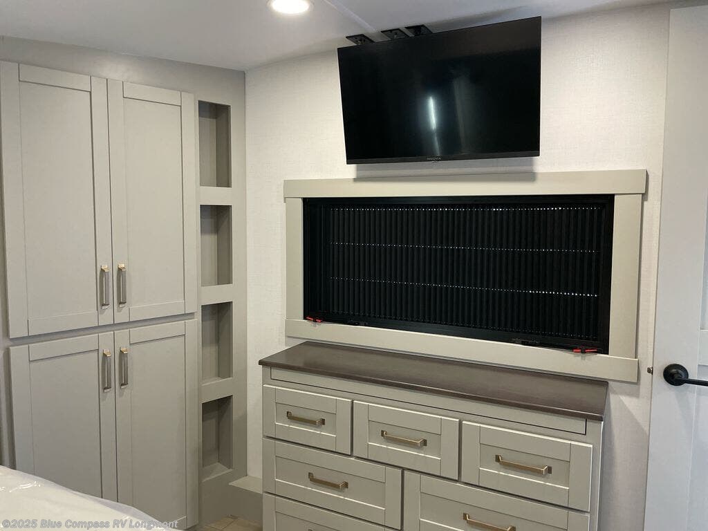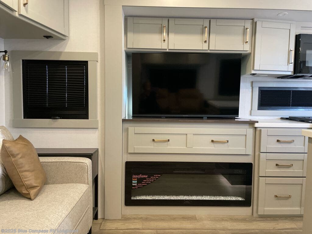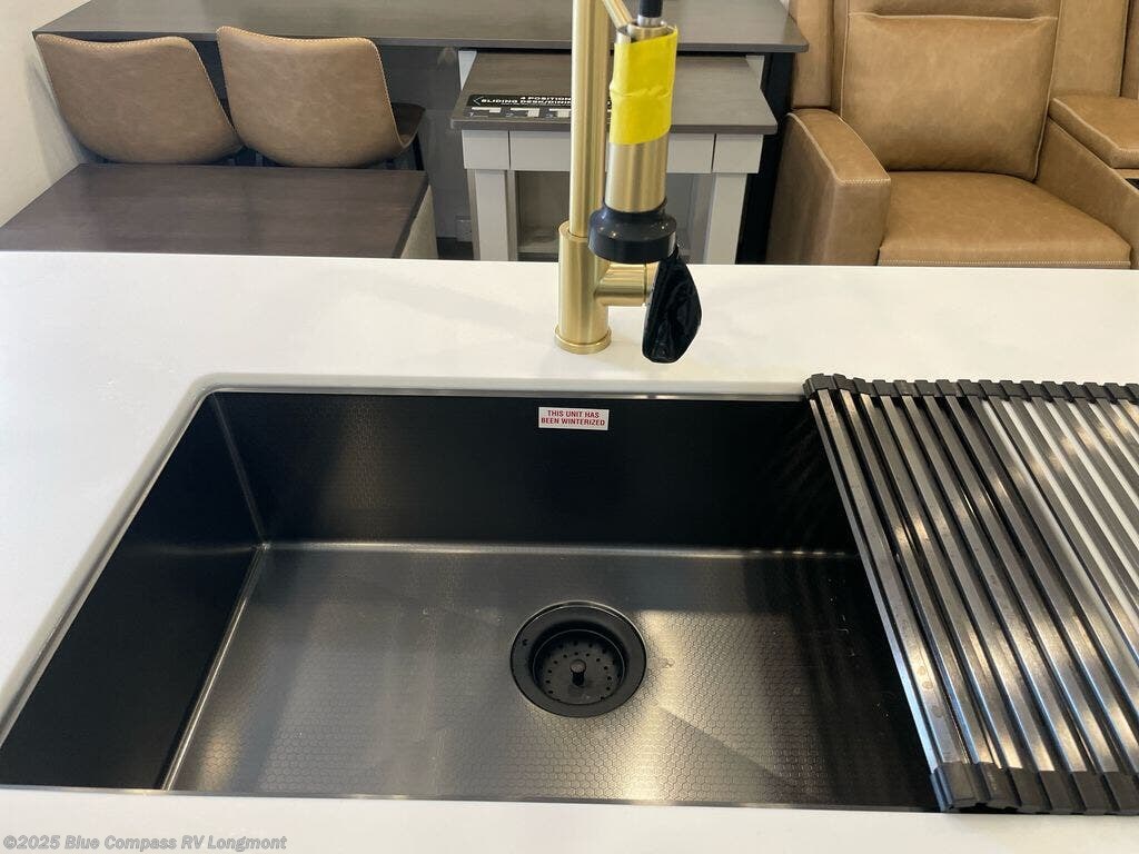 This Model Z luxury fifth wheel is bright and modern on the inside, with loads of amenities that will have you dreaming of your next trip! Enter and find a spacious combined living/kitchen space thanks to dual opposing slides. There is ample seating with a sliding desk/dining table, 62" theater seating, and a 72" tri-fold sofa along the rear wall. You can easily relax and enjoy the 50" Smart telescoping TV with a cozy fireplace below. The kitchen offers all that you need to prepare and cook meals just like home with a 16 cu. ft. refrigerator for your perishables, a 30" microwave oven, and three burner range top and oven. You will love the integrated spice rack, and the kitchen island all outfitted with dog bowls and double pull out trash bins with an integrated Stow 'N Go paper towel holder. There is also an 84" pantry with adjustable shelves for all of your canned and dry goods. Head up the steps to a private master suite with king bed slide. You can opt for the queen bed if you like. A sliding dresser top features hidden storage which is perfect for jewelry and other personal belongings. The front wardrobe features mirrored doors and the corner closet has been prepped for a stackable washer and dryer if you choose to add that option. Relax and enjoy a large bath featuring a linen cabinet, a 30" x 42" shower, and vanity with sink, plus medicine cabinet.
