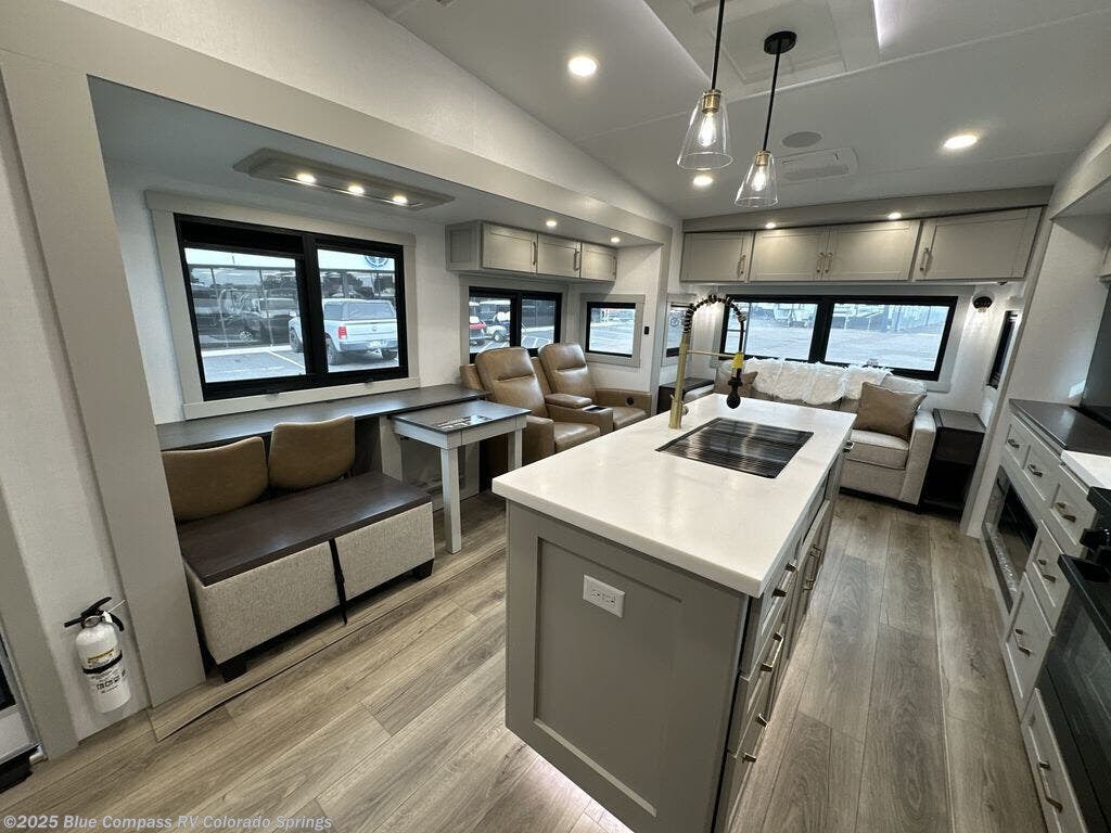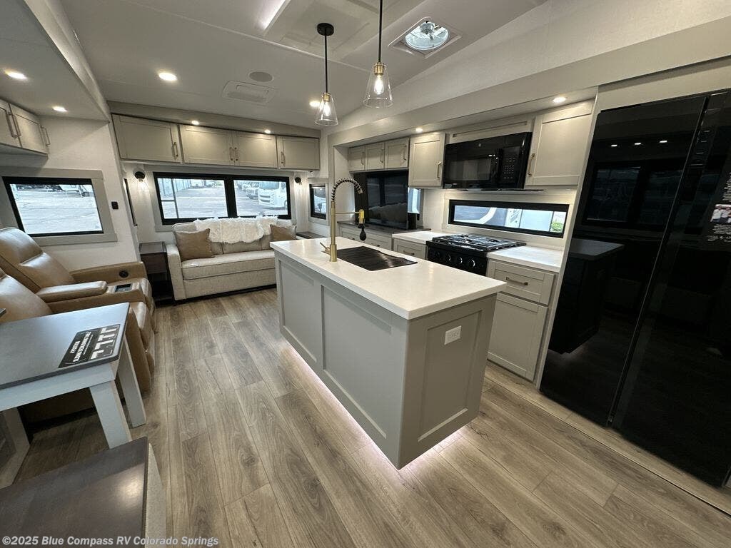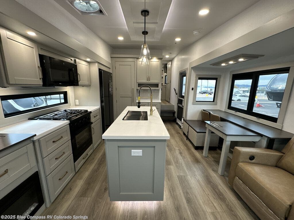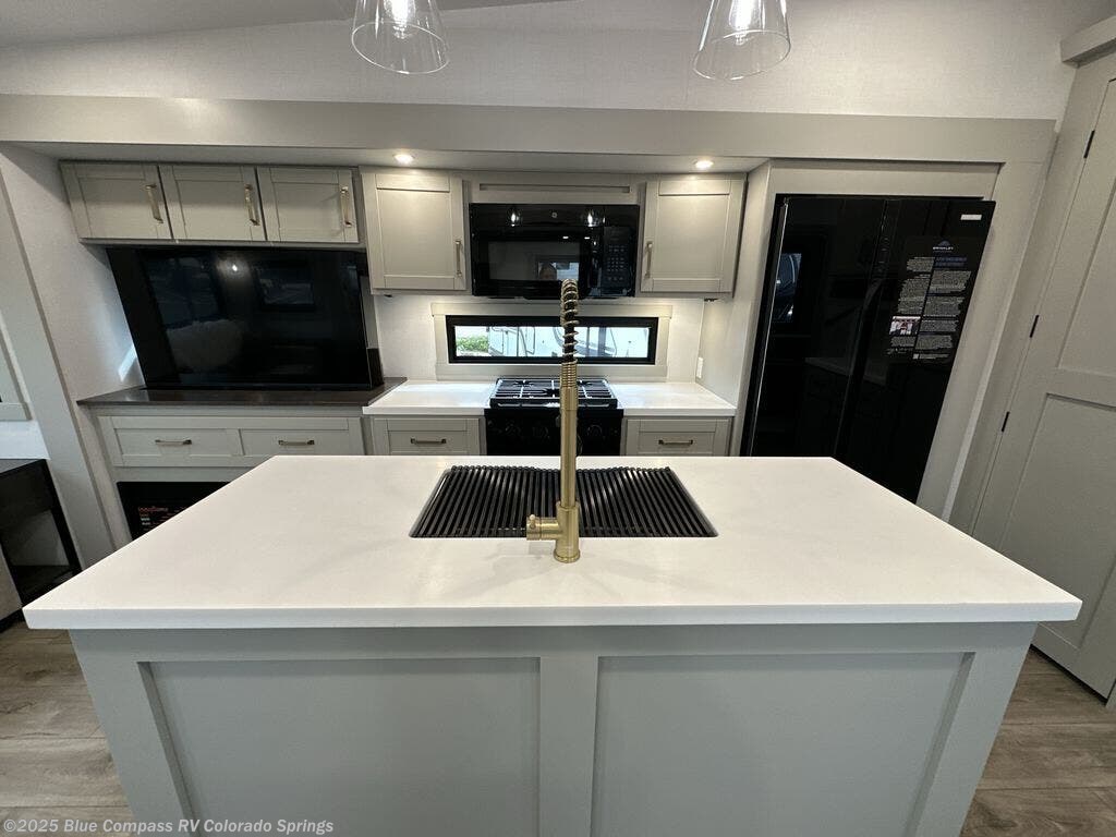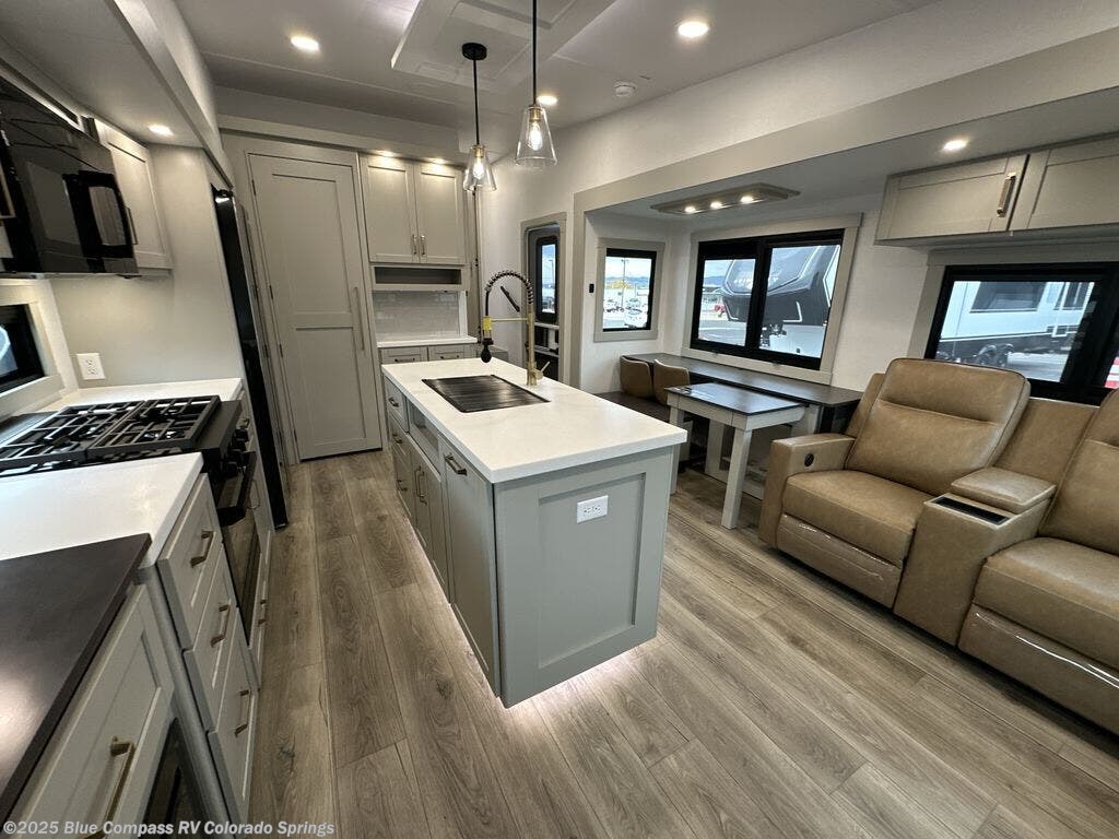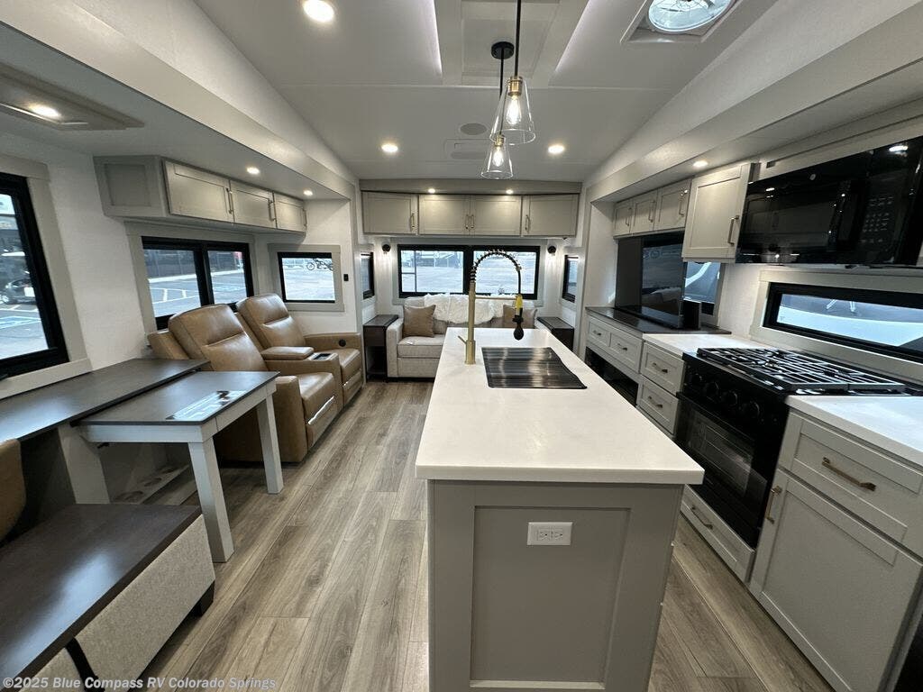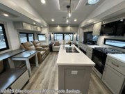 This Model Z luxury fifth wheel is bright and modern on the inside, with loads of amenities that will have you dreaming of your next trip! Enter and find a spacious combined living/kitchen space thanks to dual opposing slides. There is ample seating with a sliding desk/dining table, 62" theater seating, and a 72" tri-fold sofa along the rear wall. You can easily relax and enjoy the 50" Smart telescoping TV with a cozy fireplace below. The kitchen offers all that you need to prepare and cook meals just like home with a 16 cu. ft. refrigerator for your perishables, a 30" microwave oven, and three burner range top and oven. You will love the integrated spice rack, and the kitchen island all outfitted with dog bowls and double pull out trash bins with an integrated Stow 'N Go paper towel holder. There is also an 84" pantry with adjustable shelves for all of your canned and dry goods. Head up the steps to a private master suite with king bed slide. You can opt for the queen bed if you like. A sliding dresser top features hidden storage which is perfect for jewelry and other personal belongings. The front wardrobe features mirrored doors and the corner closet has been prepped for a stackable washer and dryer if you choose to add that option. Relax and enjoy a large bath featuring a linen cabinet, a 30" x 42" shower, and vanity with sink, plus medicine cabinet.