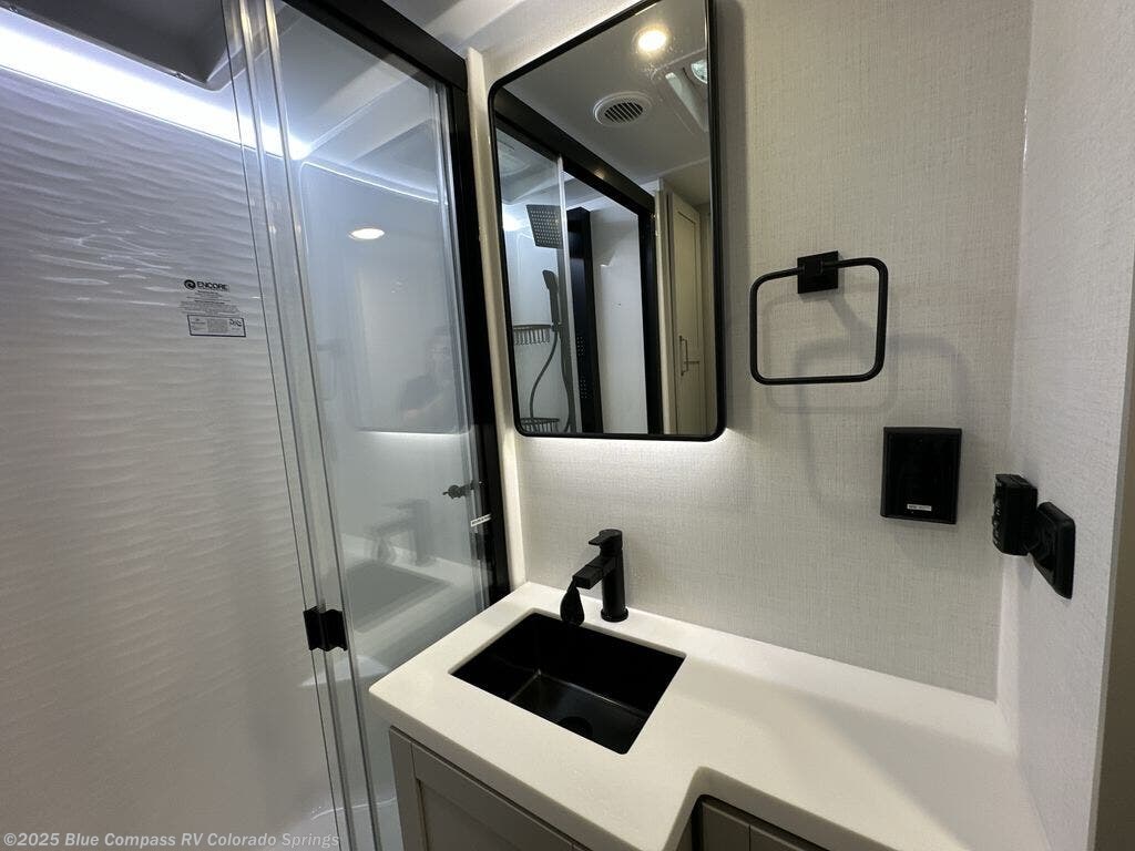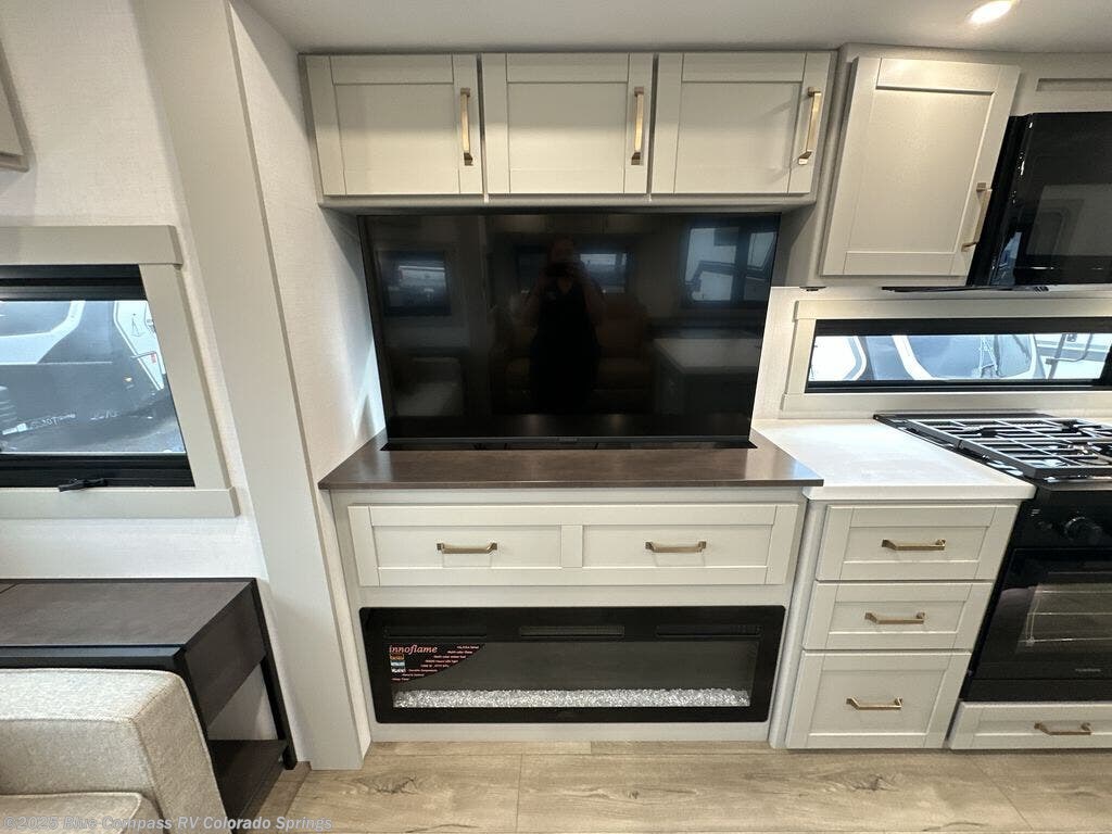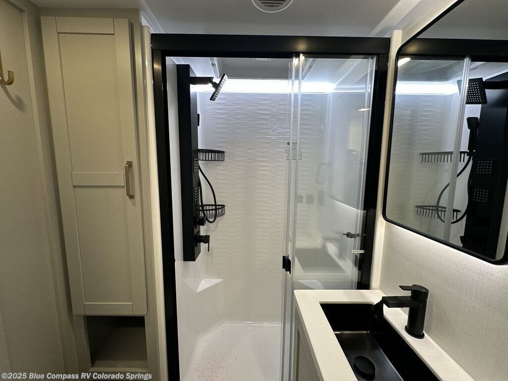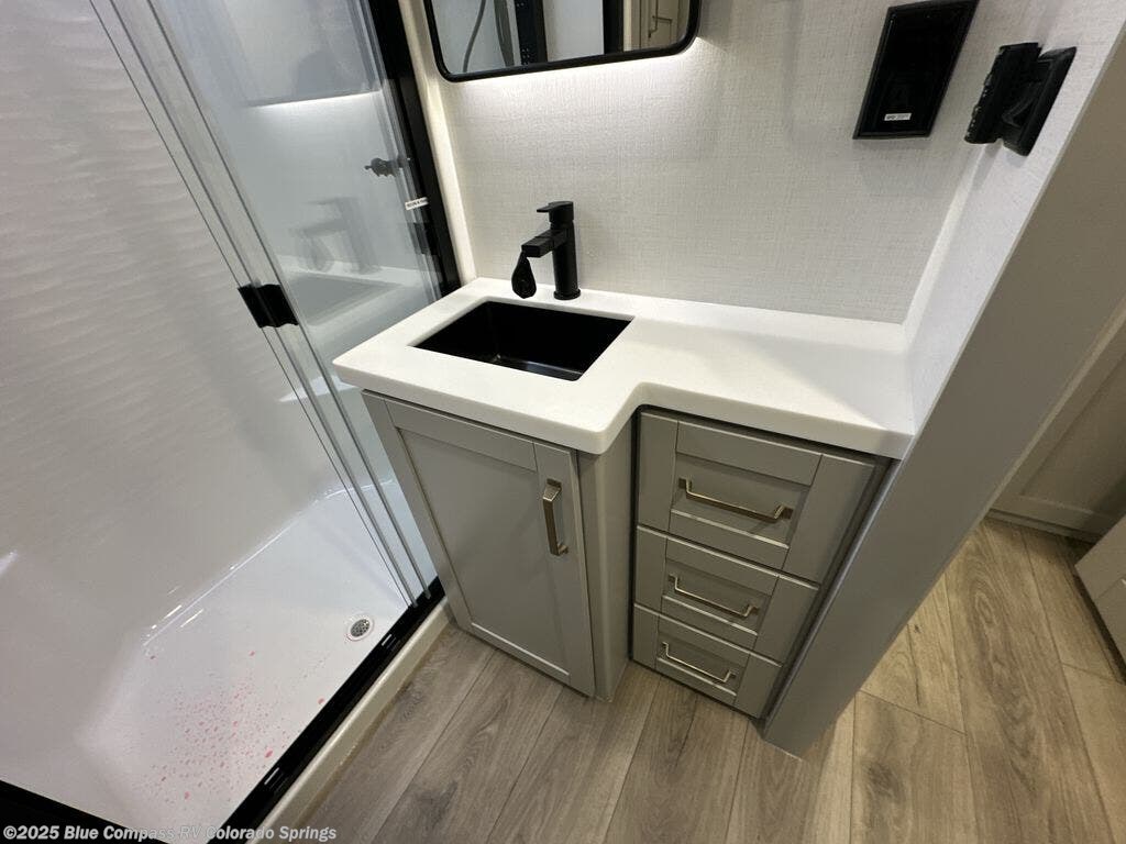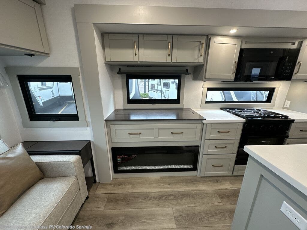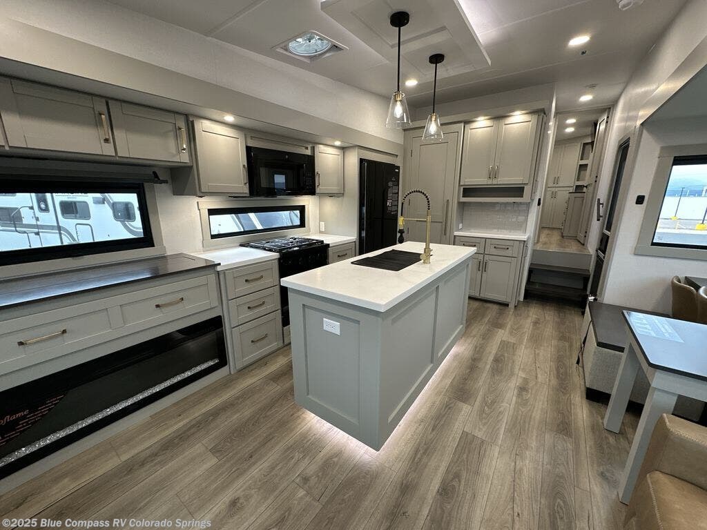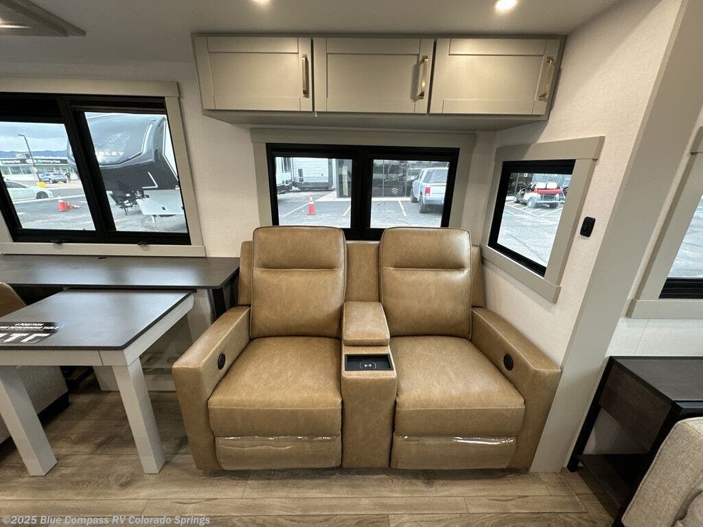 This Model Z luxury fifth wheel is bright and modern on the inside, with loads of amenities that will have you dreaming of your next trip! Enter and find a spacious combined living/kitchen space thanks to dual opposing slides. There is ample seating with a sliding desk/dining table, 62" theater seating, and a 72" tri-fold sofa along the rear wall. You can easily relax and enjoy the 50" Smart telescoping TV with a cozy fireplace below. The kitchen offers all that you need to prepare and cook meals just like home with a 16 cu. ft. refrigerator for your perishables, a 30" microwave oven, and three burner range top and oven. You will love the integrated spice rack, and the kitchen island all outfitted with dog bowls and double pull out trash bins with an integrated Stow 'N Go paper towel holder. There is also an 84" pantry with adjustable shelves for all of your canned and dry goods. Head up the steps to a private master suite with king bed slide. You can opt for the queen bed if you like. A sliding dresser top features hidden storage which is perfect for jewelry and other personal belongings. The front wardrobe features mirrored doors and the corner closet has been prepped for a stackable washer and dryer if you choose to add that option. Relax and enjoy a large bath featuring a linen cabinet, a 30" x 42" shower, and vanity with sink, plus medicine cabinet.