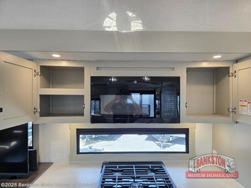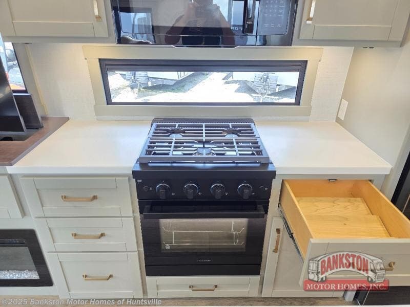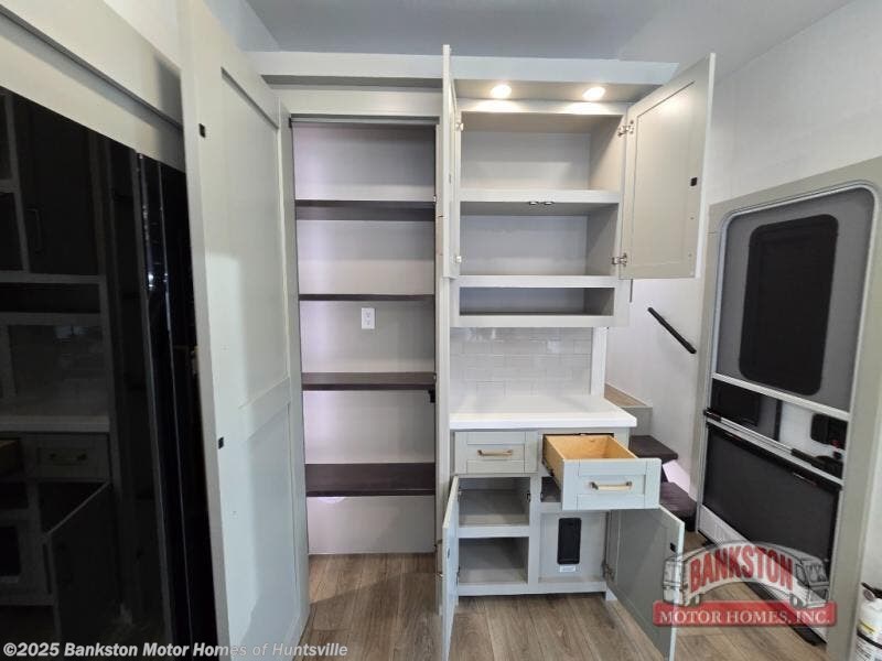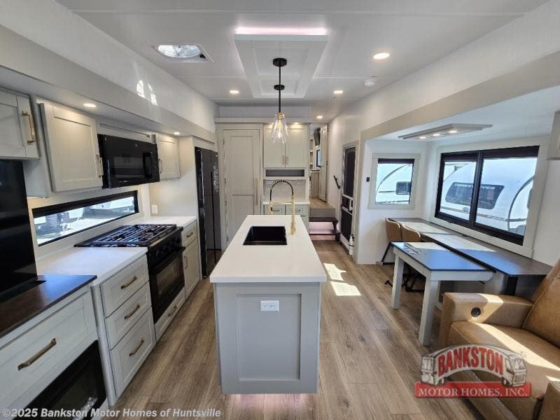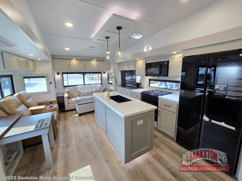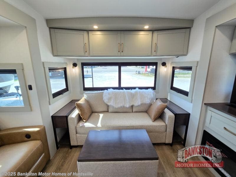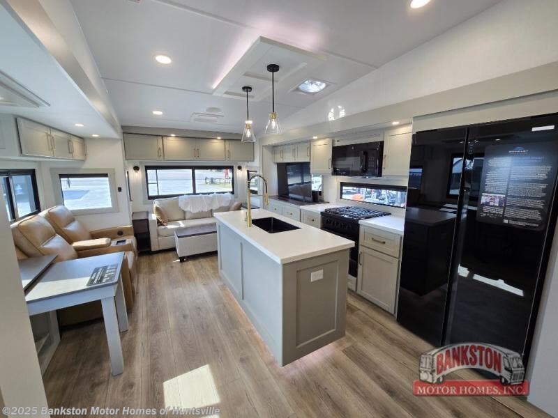 This Model Z luxury fifth wheel is bright and modern on the inside, with loads of amenities that will have you dreaming of your next trip! Enter and find a spacious combined living/kitchen space thanks to dual opposing slides. There is ample seating with a sliding desk/dining table, 62" theater seating, and a 72" tri-fold sofa along the rear wall. You can easily relax and enjoy the 50" Smart telescoping TV with a cozy fireplace below. The kitchen offers all that you need to prepare and cook meals just like home with a 16 cu. ft. refrigerator for your perishables, a 30" microwave oven, and three burner range top and oven. You will love the integrated spice rack, and the kitchen island all outfitted with dog bowls and double pull out trash bins with an integrated Stow 'N Go paper towel holder. There is also an 84" pantry with adjustable shelves for all of your canned and dry goods. Head up the steps to a private master suite with king bed slide. You can opt for the queen bed if you like. A sliding dresser top features hidden storage which is perfect for jewelry and other personal belongings. The front wardrobe features mirrored doors and the corner closet has been prepped for a stackable washer and dryer if you choose to add that option. Relax and enjoy a large bath featuring a linen cabinet, a 30" x 42" shower, and vanity with sink, plus medicine cabinet.