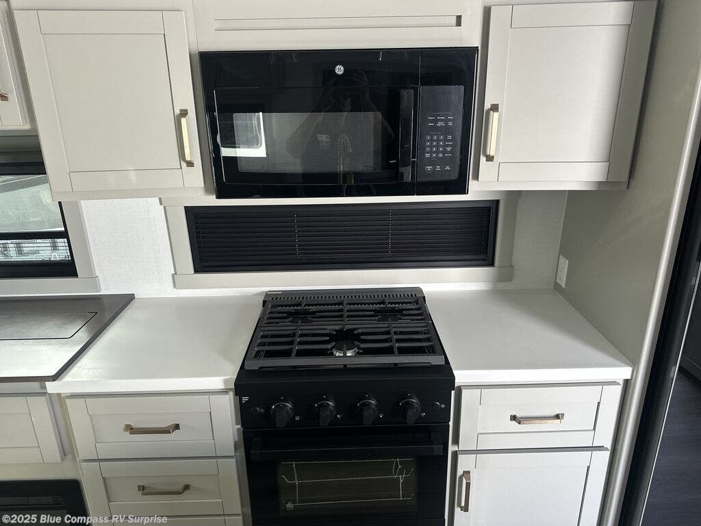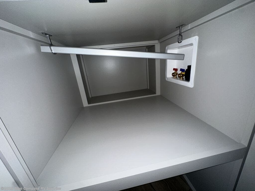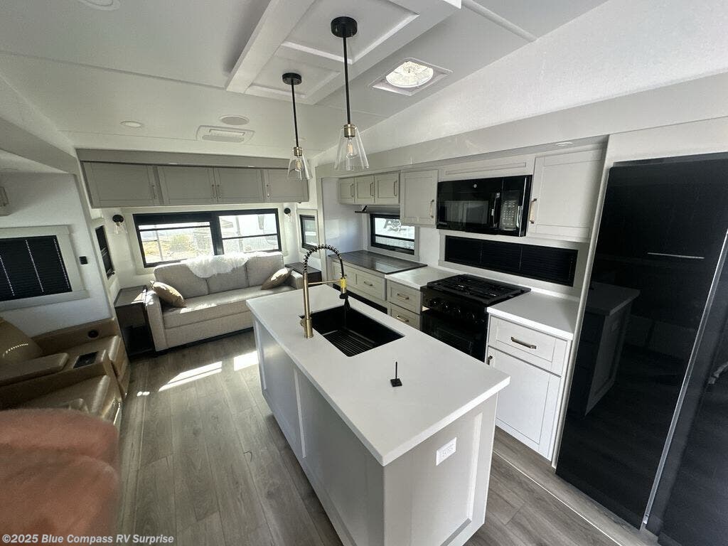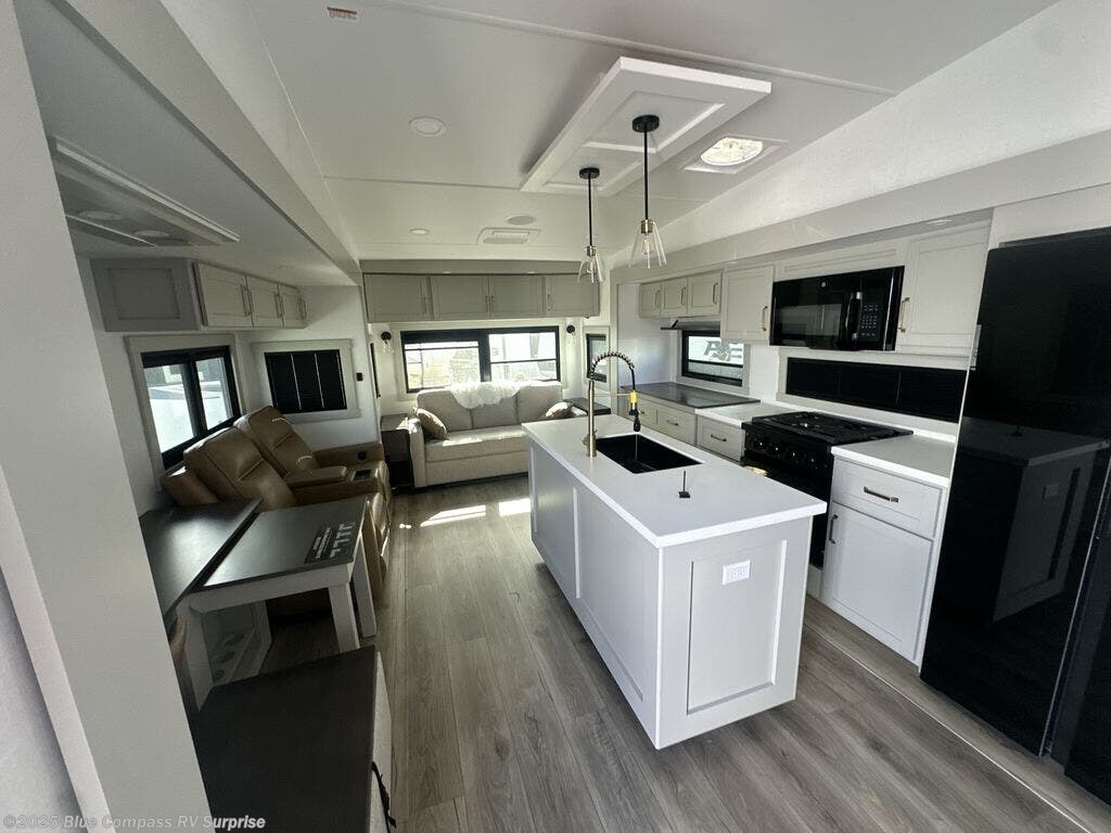 This Model Z luxury fifth wheel is bright and modern on the inside, with loads of amenities that will have you dreaming of your next trip! Enter and find a spacious combined living/kitchen space thanks to dual opposing slides. There is ample seating with a sliding desk/dining table, 62" theater seating, and a 72" tri-fold sofa along the rear wall. You can easily relax and enjoy the 50" Smart telescoping TV with a cozy fireplace below. The kitchen offers all that you need to prepare and cook meals just like home with a 16 cu. ft. refrigerator for your perishables, a 30" microwave oven, and three burner range top and oven. You will love the integrated spice rack, and the kitchen island all outfitted with dog bowls and double pull out trash bins with an integrated Stow 'N Go paper towel holder. There is also an 84" pantry with adjustable shelves for all of your canned and dry goods. Head up the steps to a private master suite with king bed slide. You can opt for the queen bed if you like. A sliding dresser top features hidden storage which is perfect for jewelry and other personal belongings. The front wardrobe features mirrored doors and the corner closet has been prepped for a stackable washer and dryer if you choose to add that option. Relax and enjoy a large bath featuring a linen cabinet, a 30" x 42" shower, and vanity with sink, plus medicine cabinet.