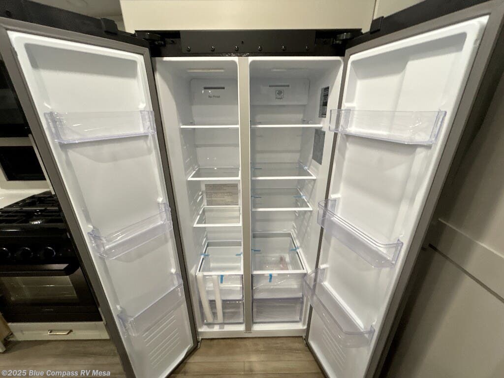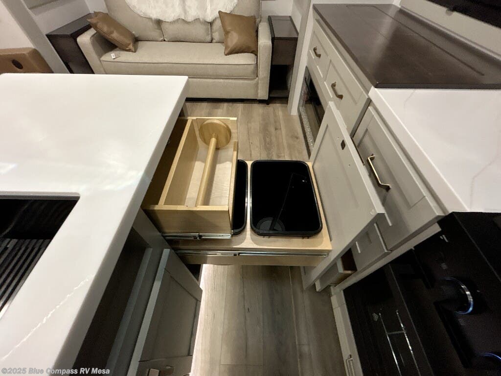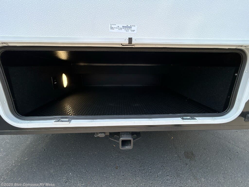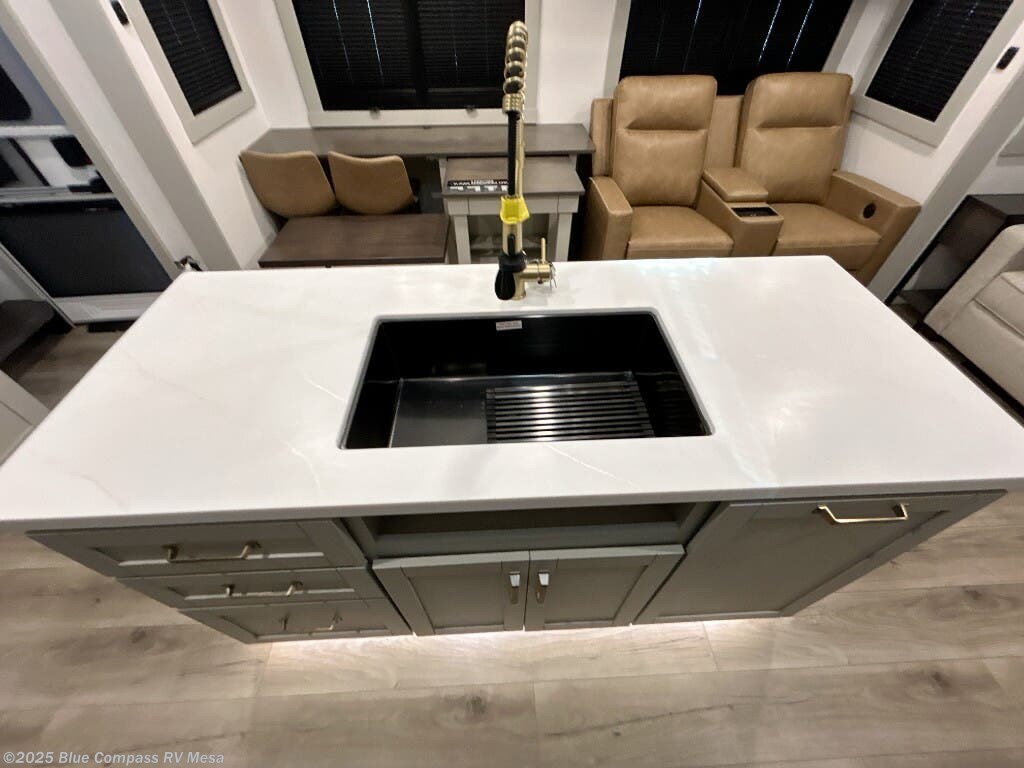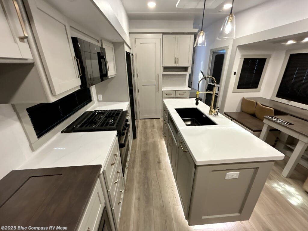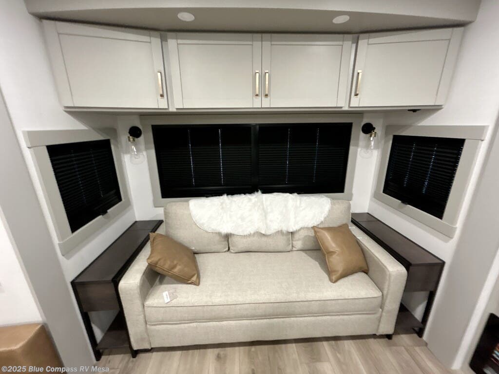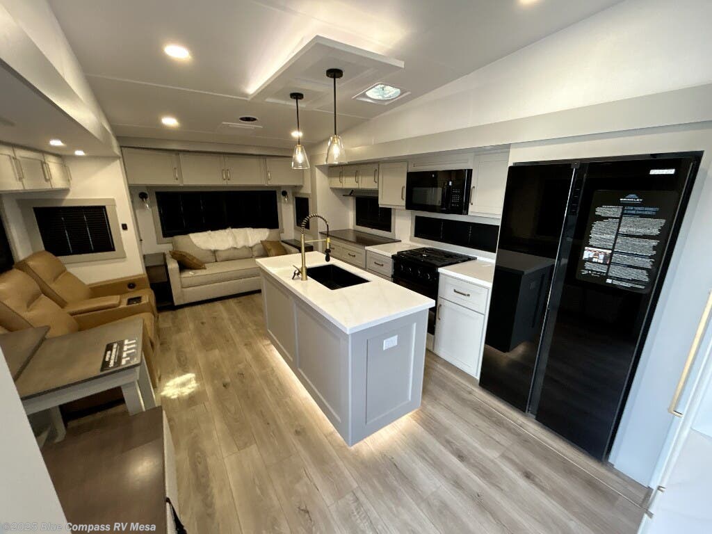 This Model Z luxury fifth wheel is bright and modern on the inside, with loads of amenities that will have you dreaming of your next trip! Enter and find a spacious combined living/kitchen space thanks to dual opposing slides. There is ample seating with a sliding desk/dining table, 62" theater seating, and a 72" tri-fold sofa along the rear wall. You can easily relax and enjoy the 50" Smart telescoping TV with a cozy fireplace below. The kitchen offers all that you need to prepare and cook meals just like home with a 16 cu. ft. refrigerator for your perishables, a 30" microwave oven, and three burner range top and oven. You will love the integrated spice rack, and the kitchen island all outfitted with dog bowls and double pull out trash bins with an integrated Stow 'N Go paper towel holder. There is also an 84" pantry with adjustable shelves for all of your canned and dry goods. Head up the steps to a private master suite with king bed slide. You can opt for the queen bed if you like. A sliding dresser top features hidden storage which is perfect for jewelry and other personal belongings. The front wardrobe features mirrored doors and the corner closet has been prepped for a stackable washer and dryer if you choose to add that option. Relax and enjoy a large bath featuring a linen cabinet, a 30" x 42" shower, and vanity with sink, plus medicine cabinet.