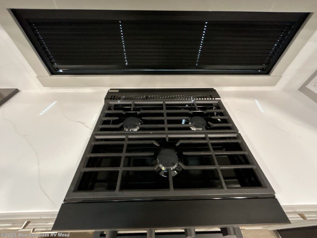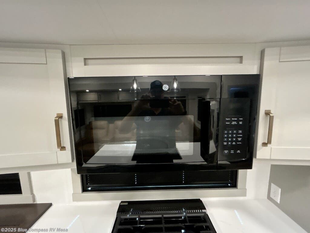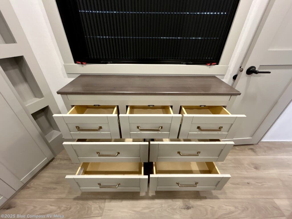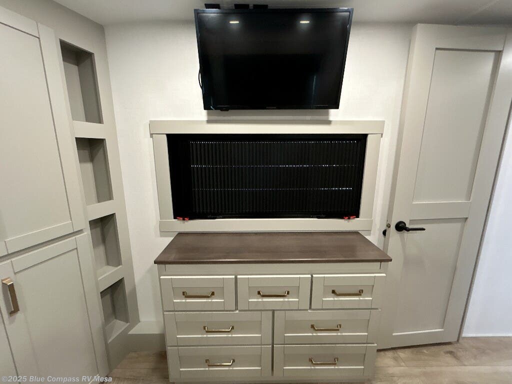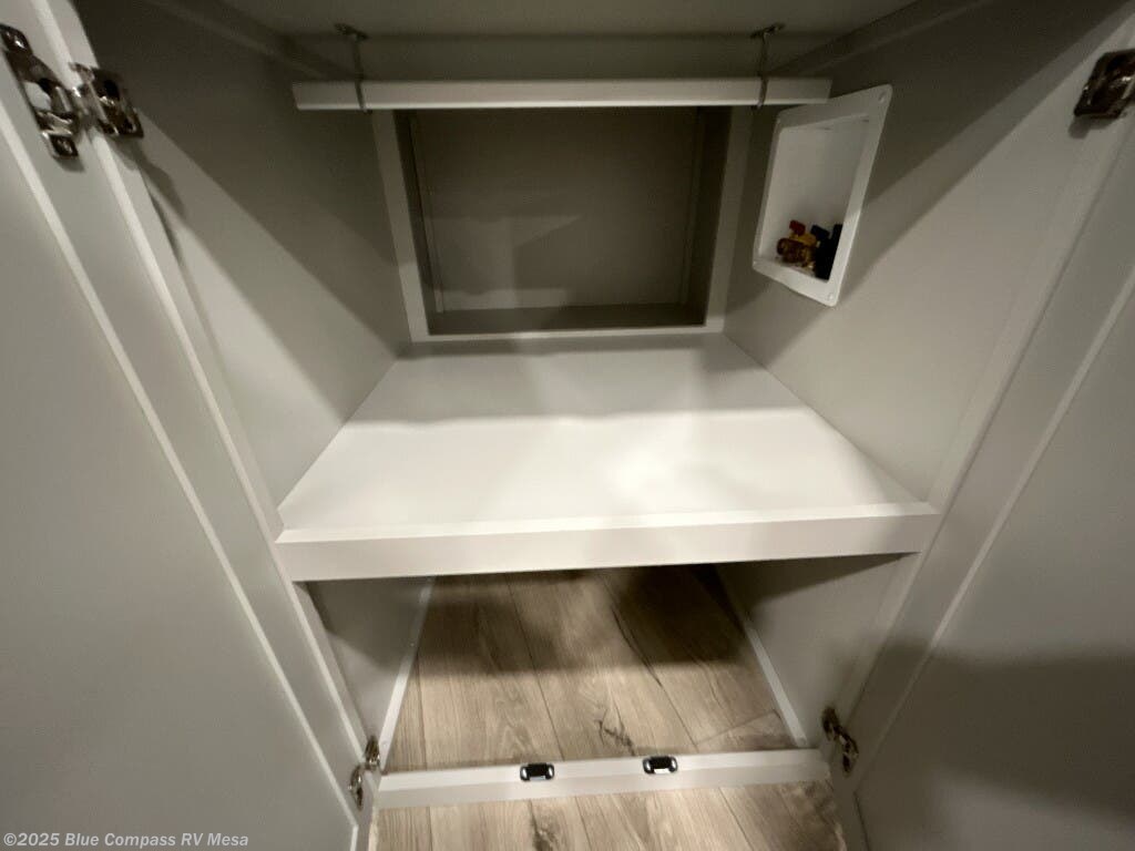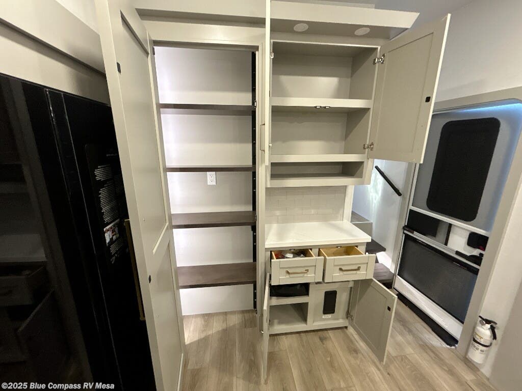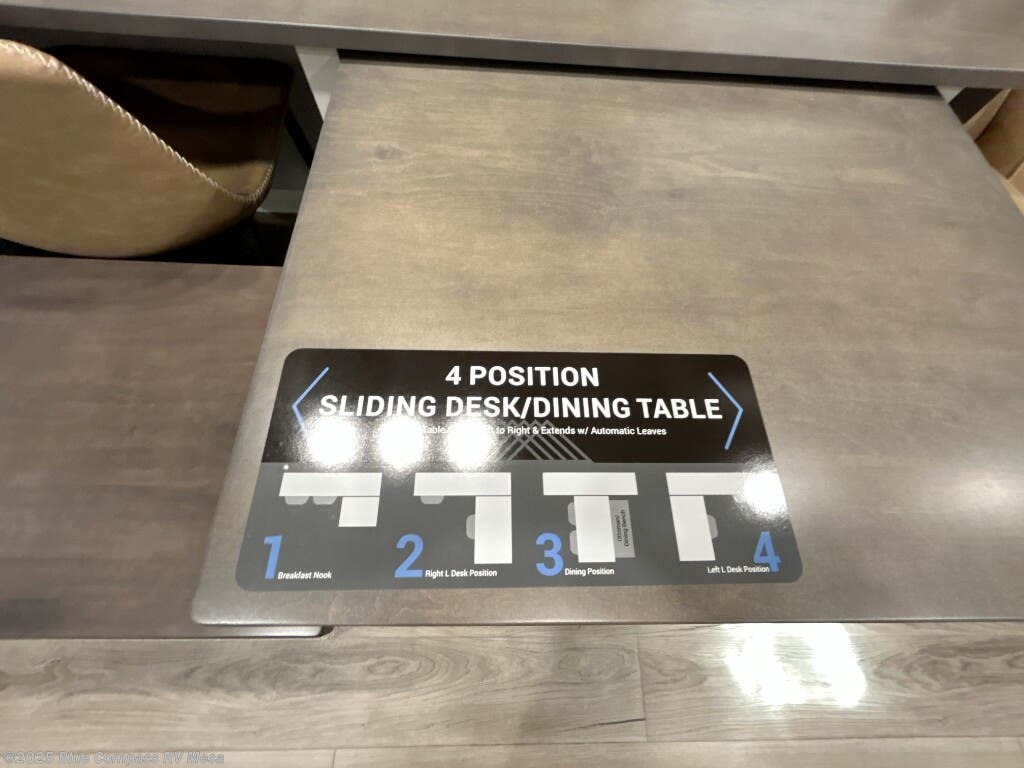 This Model Z luxury fifth wheel is bright and modern on the inside, with loads of amenities that will have you dreaming of your next trip! Enter and find a spacious combined living/kitchen space thanks to dual opposing slides. There is ample seating with a sliding desk/dining table, 62" theater seating, and a 72" tri-fold sofa along the rear wall. You can easily relax and enjoy the 50" Smart telescoping TV with a cozy fireplace below. The kitchen offers all that you need to prepare and cook meals just like home with a 16 cu. ft. refrigerator for your perishables, a 30" microwave oven, and three burner range top and oven. You will love the integrated spice rack, and the kitchen island all outfitted with dog bowls and double pull out trash bins with an integrated Stow 'N Go paper towel holder. There is also an 84" pantry with adjustable shelves for all of your canned and dry goods. Head up the steps to a private master suite with king bed slide. You can opt for the queen bed if you like. A sliding dresser top features hidden storage which is perfect for jewelry and other personal belongings. The front wardrobe features mirrored doors and the corner closet has been prepped for a stackable washer and dryer if you choose to add that option. Relax and enjoy a large bath featuring a linen cabinet, a 30" x 42" shower, and vanity with sink, plus medicine cabinet.