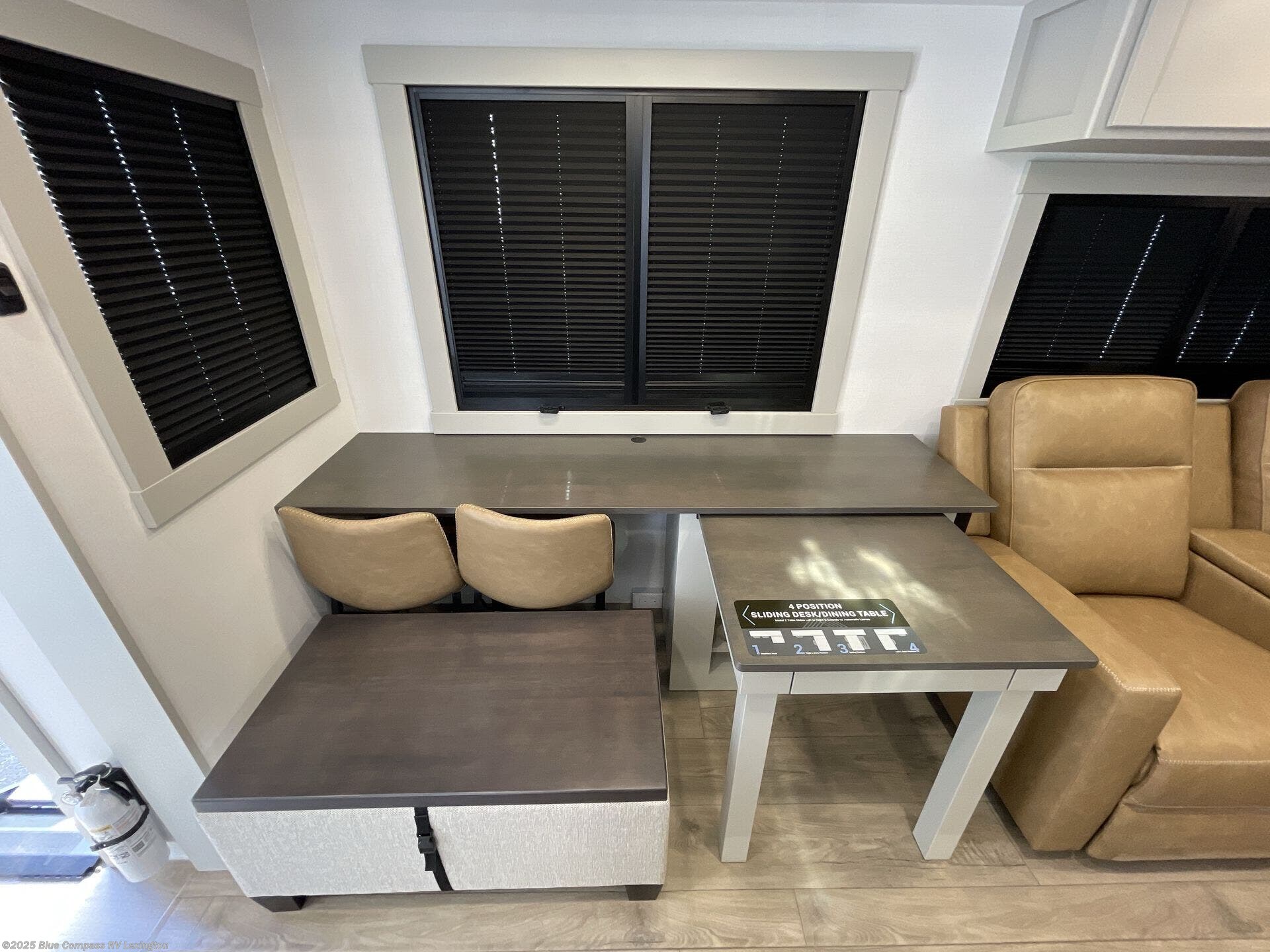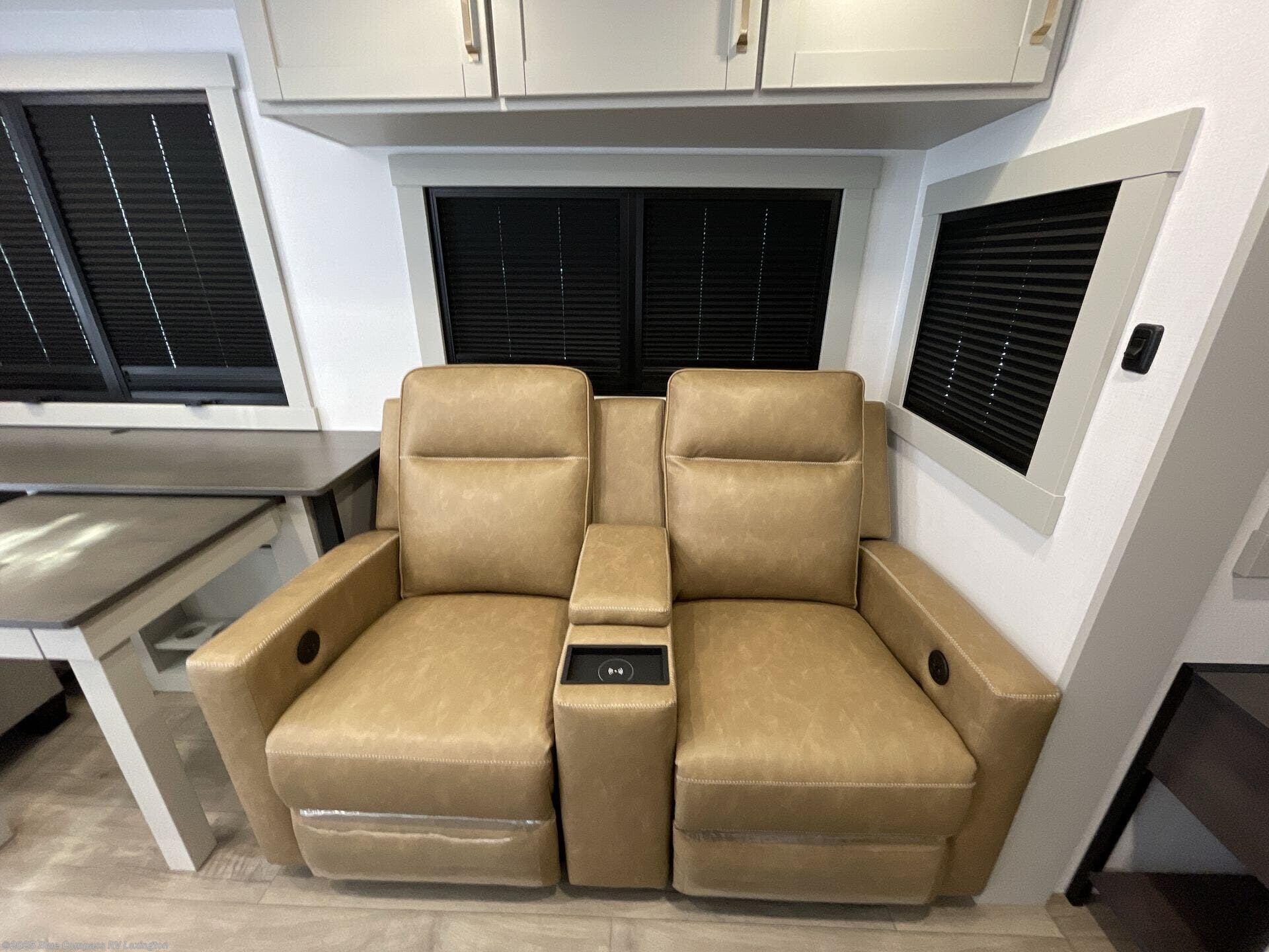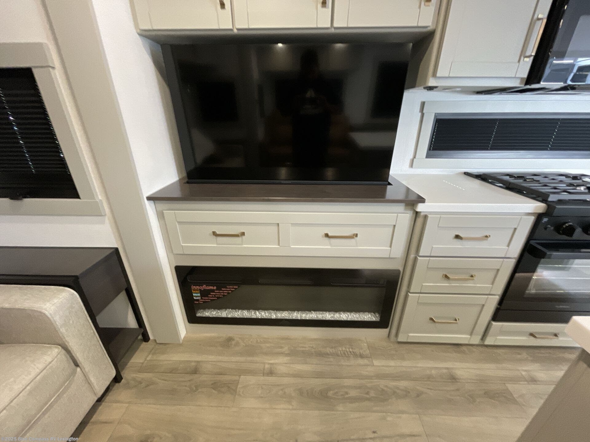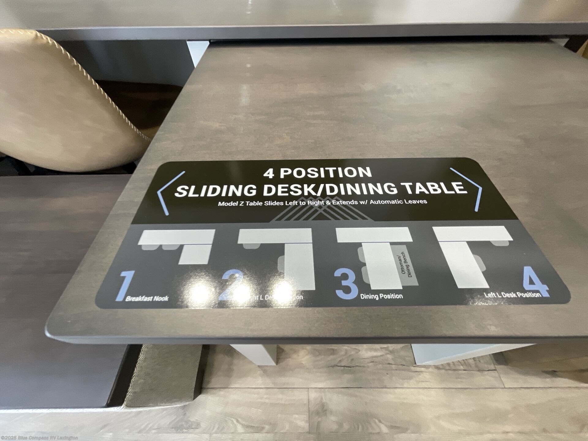 This Model Z luxury fifth wheel is bright and modern on the inside, with loads of amenities that will have you dreaming of your next trip! Enter and find a spacious combined living/kitchen space thanks to dual opposing slides. There is ample seating with a sliding desk/dining table, 62" theater seating, and a 72" tri-fold sofa along the rear wall. You can easily relax and enjoy the 50" Smart telescoping TV with a cozy fireplace below. The kitchen offers all that you need to prepare and cook meals just like home with a 16 cu. ft. refrigerator for your perishables, a 30" microwave oven, and three burner range top and oven. You will love the integrated spice rack, and the kitchen island all outfitted with dog bowls and double pull out trash bins with an integrated Stow 'N Go paper towel holder. There is also an 84" pantry with adjustable shelves for all of your canned and dry goods. Head up the steps to a private master suite with king bed slide. You can opt for the queen bed if you like. A sliding dresser top features hidden storage which is perfect for jewelry and other personal belongings. The front wardrobe features mirrored doors and the corner closet has been prepped for a stackable washer and dryer if you choose to add that option. Relax and enjoy a large bath featuring a linen cabinet, a 30" x 42" shower, and vanity with sink, plus medicine cabinet.