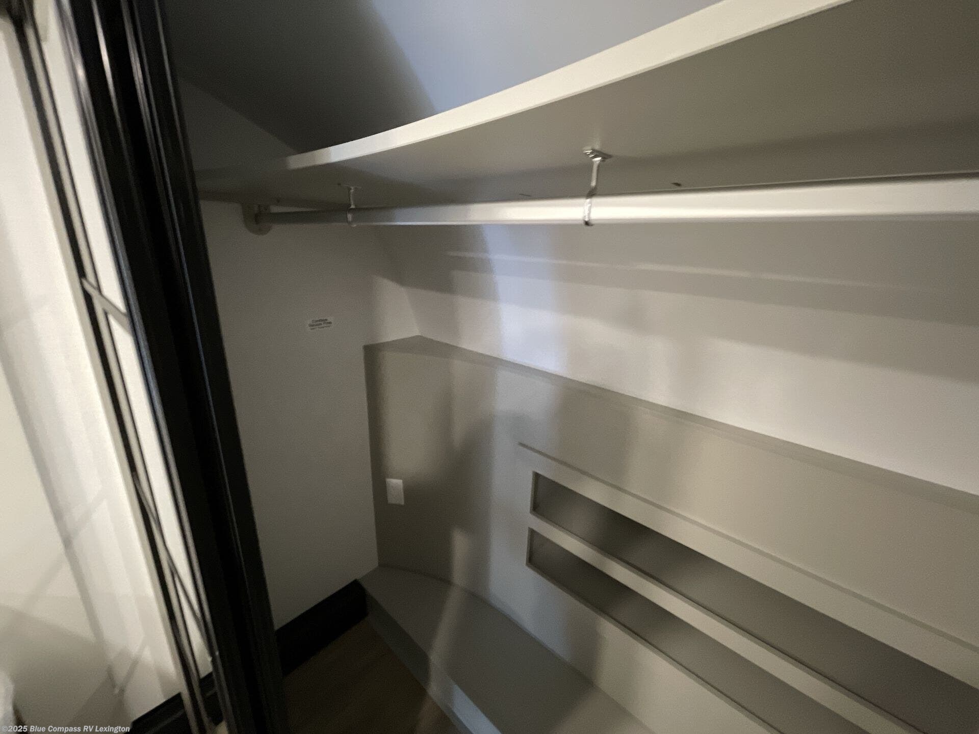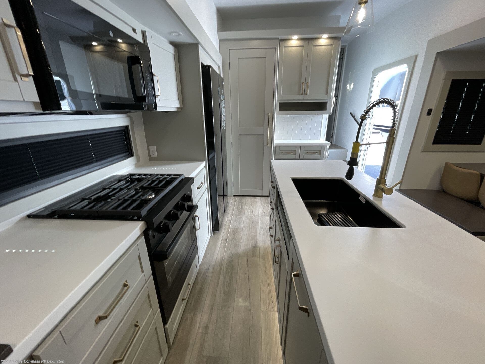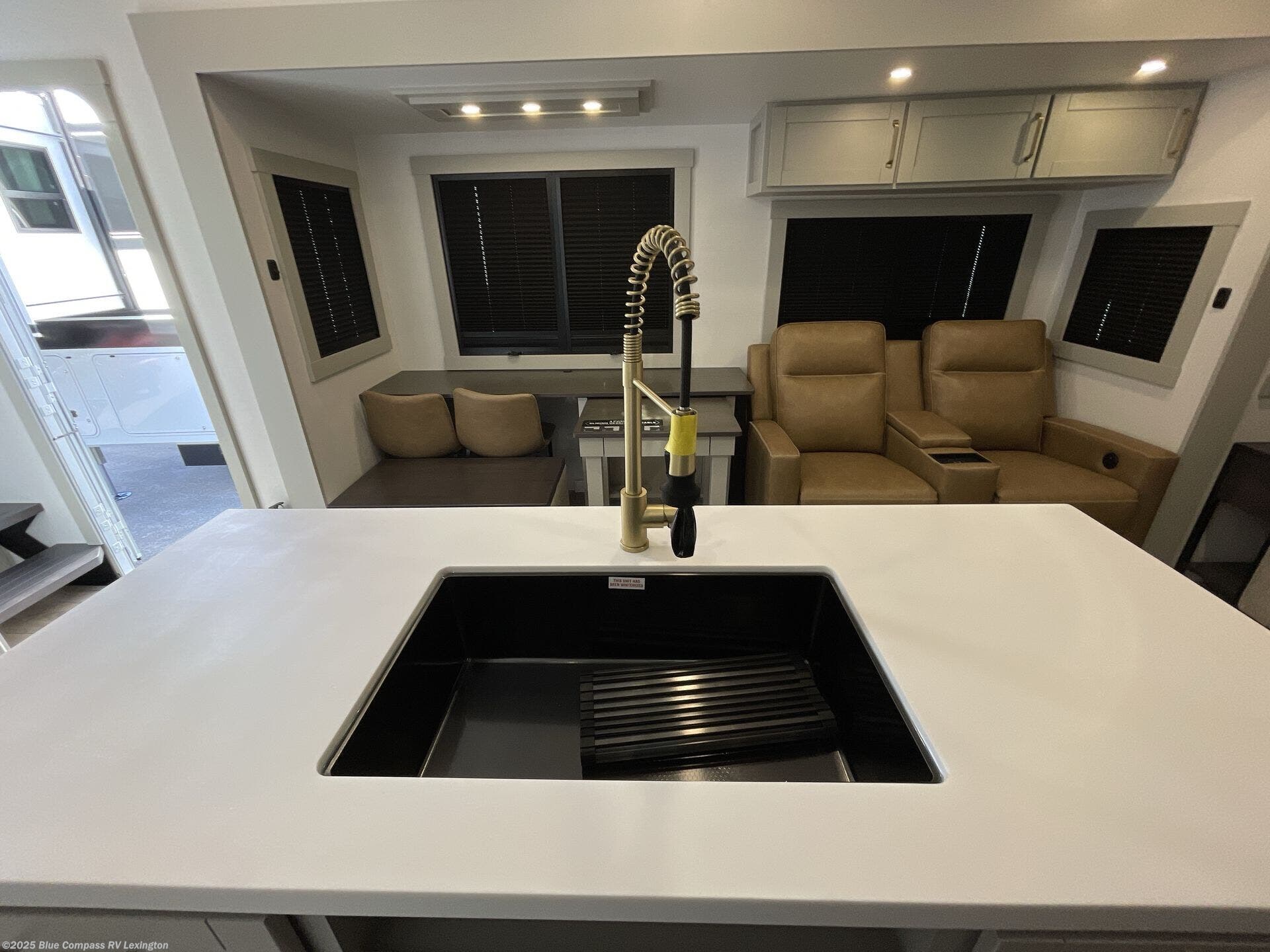 This Model Z luxury fifth wheel is bright and modern on the inside, with loads of amenities that will have you dreaming of your next trip! Enter and find a spacious combined living/kitchen space thanks to dual opposing slides. There is ample seating with a sliding desk/dining table, 62" theater seating, and a 72" tri-fold sofa along the rear wall. You can easily relax and enjoy the 50" Smart telescoping TV with a cozy fireplace below. The kitchen offers all that you need to prepare and cook meals just like home with a 16 cu. ft. refrigerator for your perishables, a 30" microwave oven, and three burner range top and oven. You will love the integrated spice rack, and the kitchen island all outfitted with dog bowls and double pull out trash bins with an integrated Stow 'N Go paper towel holder. There is also an 84" pantry with adjustable shelves for all of your canned and dry goods. Head up the steps to a private master suite with king bed slide. You can opt for the queen bed if you like. A sliding dresser top features hidden storage which is perfect for jewelry and other personal belongings. The front wardrobe features mirrored doors and the corner closet has been prepped for a stackable washer and dryer if you choose to add that option. Relax and enjoy a large bath featuring a linen cabinet, a 30" x 42" shower, and vanity with sink, plus medicine cabinet.