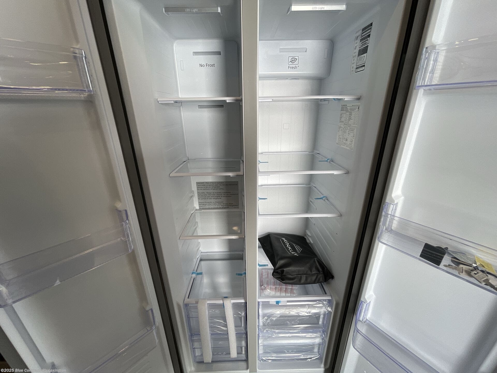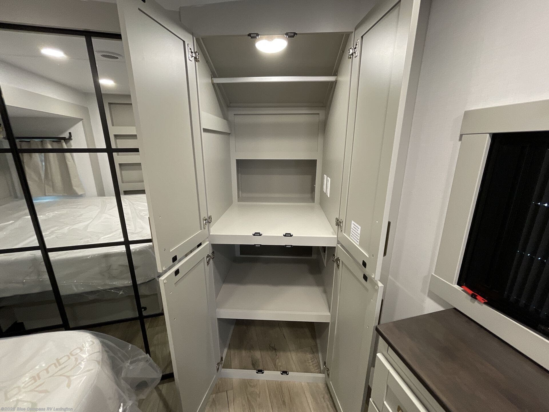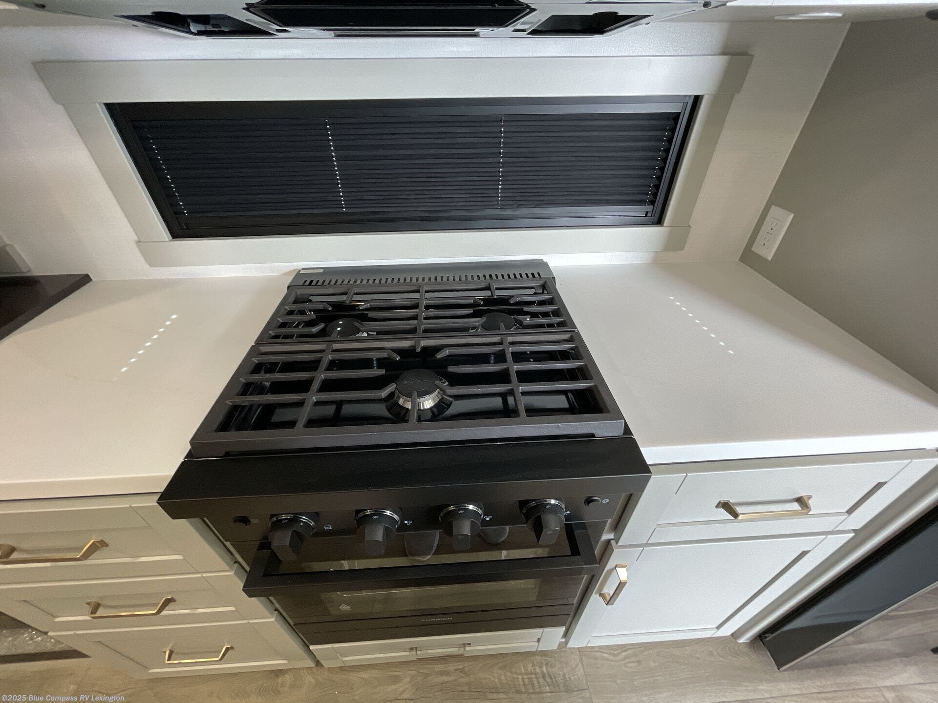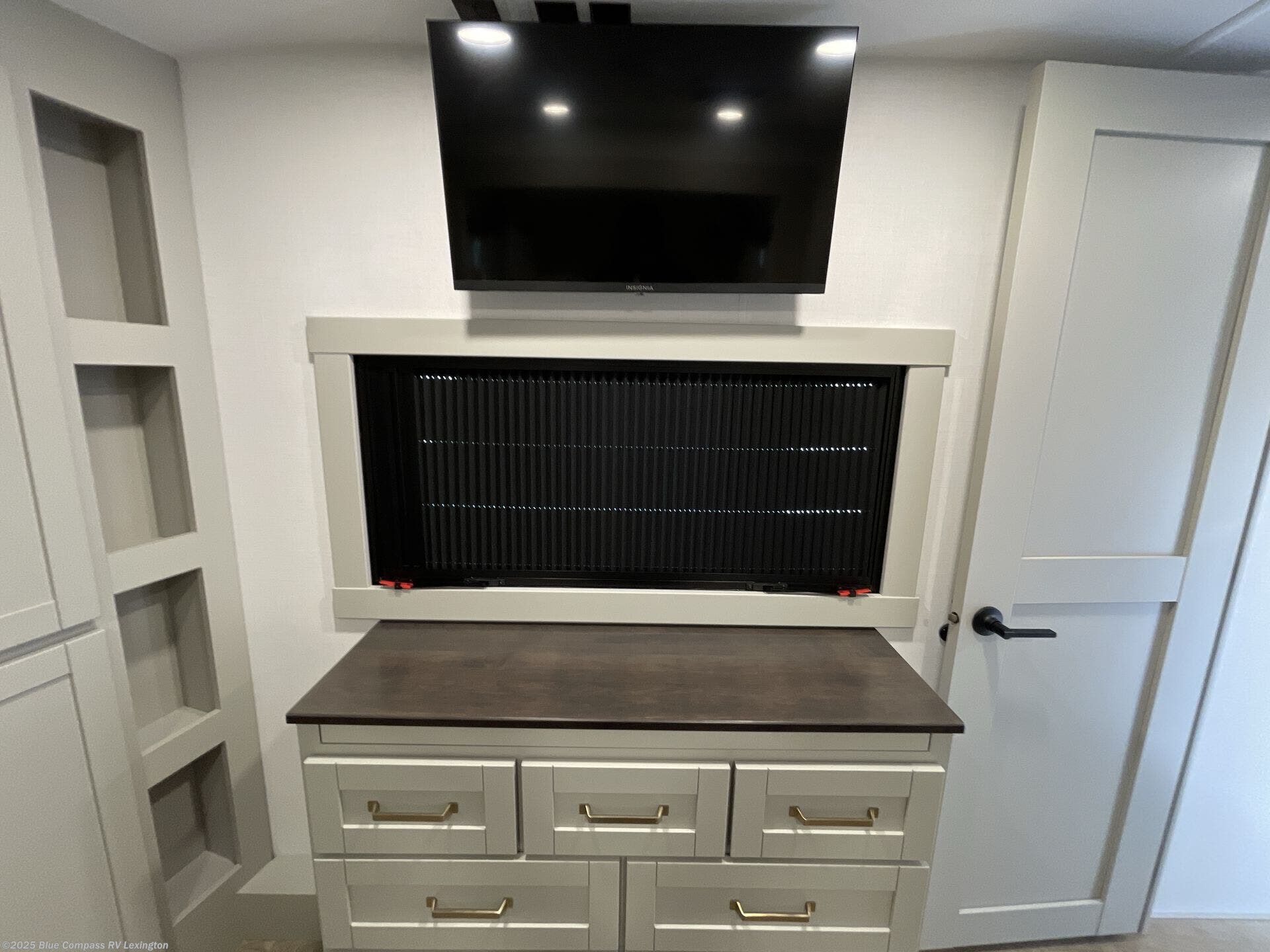 This Model Z luxury fifth wheel is bright and modern on the inside, with loads of amenities that will have you dreaming of your next trip! Enter and find a spacious combined living/kitchen space thanks to dual opposing slides. There is ample seating with a sliding desk/dining table, 62" theater seating, and a 72" tri-fold sofa along the rear wall. You can easily relax and enjoy the 50" Smart telescoping TV with a cozy fireplace below. The kitchen offers all that you need to prepare and cook meals just like home with a 16 cu. ft. refrigerator for your perishables, a 30" microwave oven, and three burner range top and oven. You will love the integrated spice rack, and the kitchen island all outfitted with dog bowls and double pull out trash bins with an integrated Stow 'N Go paper towel holder. There is also an 84" pantry with adjustable shelves for all of your canned and dry goods. Head up the steps to a private master suite with king bed slide. You can opt for the queen bed if you like. A sliding dresser top features hidden storage which is perfect for jewelry and other personal belongings. The front wardrobe features mirrored doors and the corner closet has been prepped for a stackable washer and dryer if you choose to add that option. Relax and enjoy a large bath featuring a linen cabinet, a 30" x 42" shower, and vanity with sink, plus medicine cabinet.