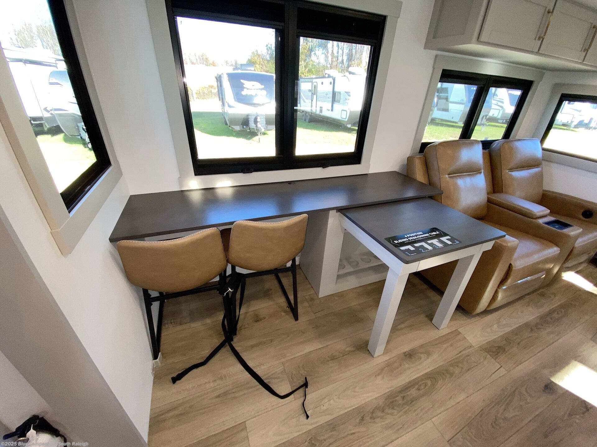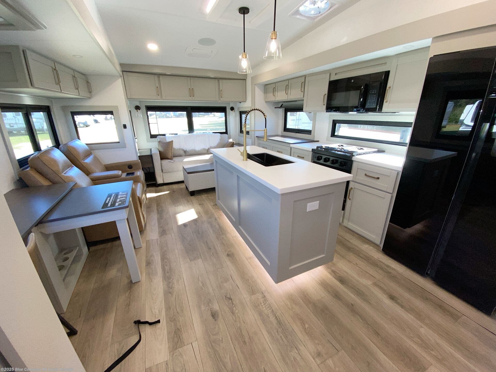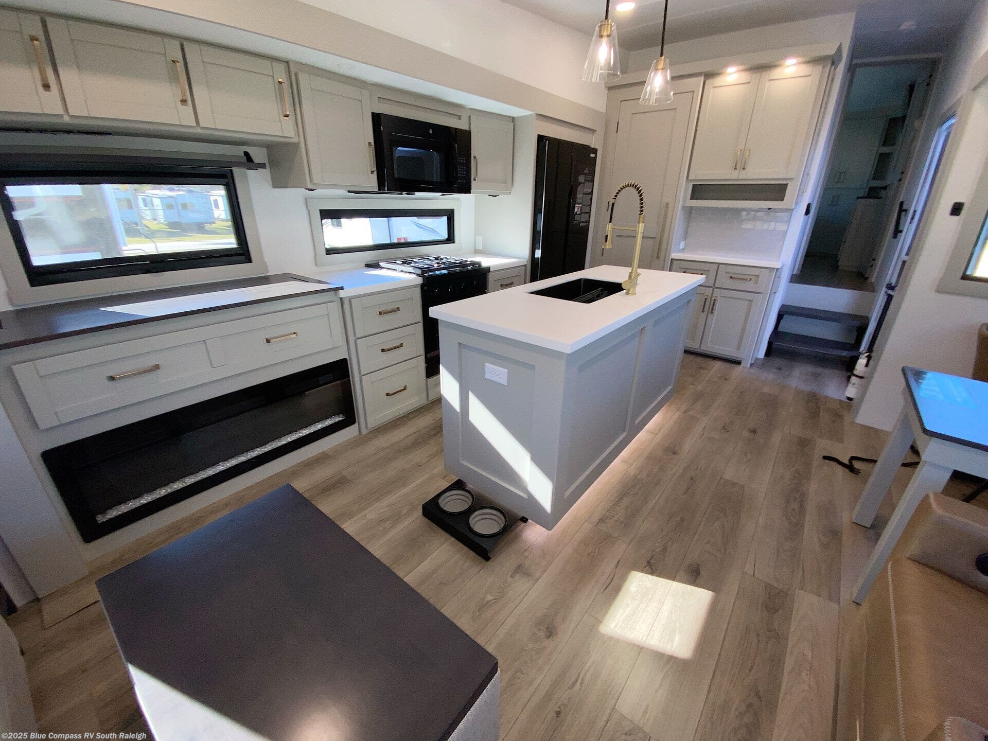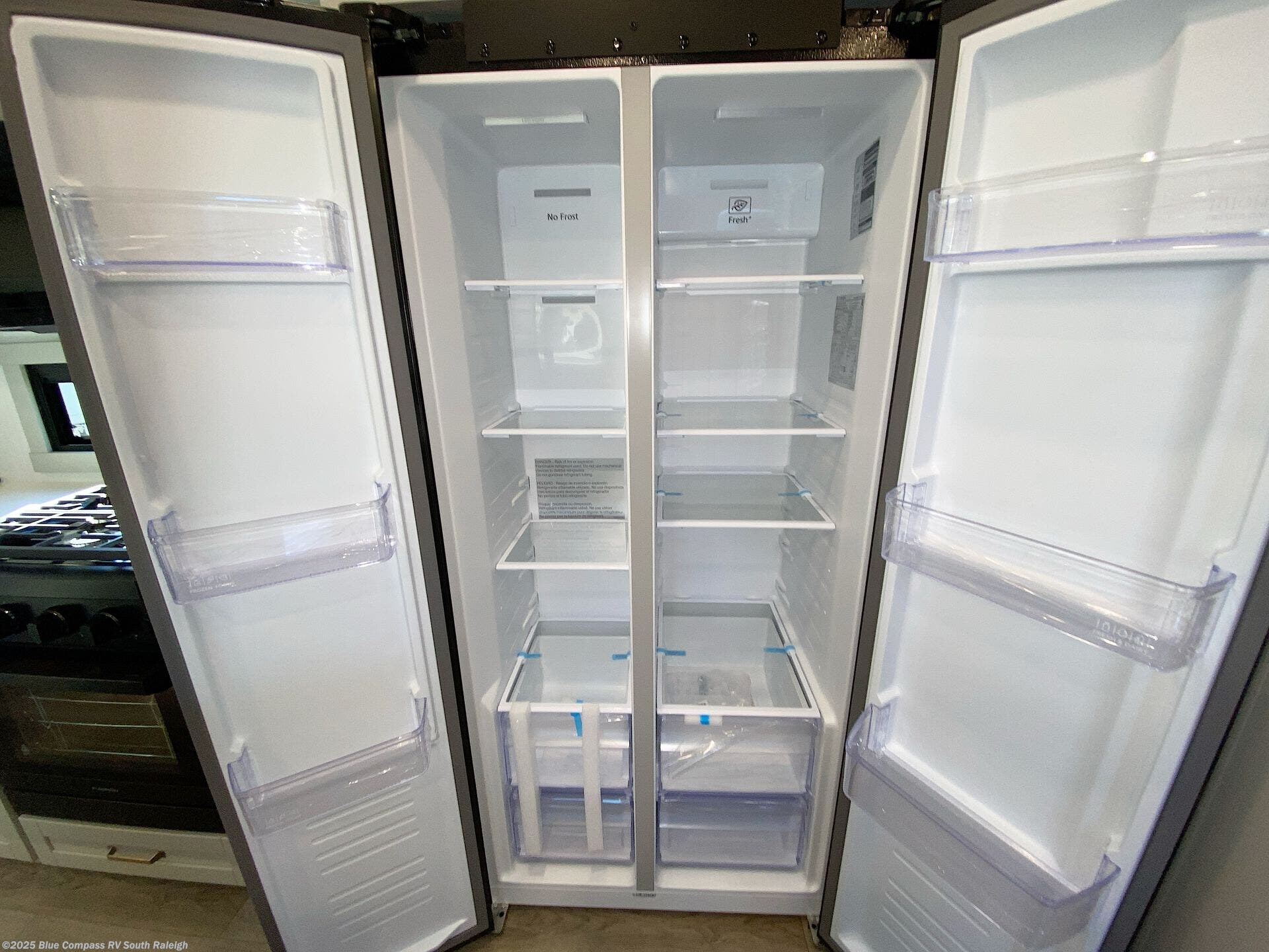 This Model Z luxury fifth wheel is bright and modern on the inside, with loads of amenities that will have you dreaming of your next trip! Enter and find a spacious combined living/kitchen space thanks to dual opposing slides. There is ample seating with a sliding desk/dining table, 62" theater seating, and a 72" tri-fold sofa along the rear wall. You can easily relax and enjoy the 50" Smart telescoping TV with a cozy fireplace below. The kitchen offers all that you need to prepare and cook meals just like home with a 16 cu. ft. refrigerator for your perishables, a 30" microwave oven, and three burner range top and oven. You will love the integrated spice rack, and the kitchen island all outfitted with dog bowls and double pull out trash bins with an integrated Stow 'N Go paper towel holder. There is also an 84" pantry with adjustable shelves for all of your canned and dry goods. Head up the steps to a private master suite with king bed slide. You can opt for the queen bed if you like. A sliding dresser top features hidden storage which is perfect for jewelry and other personal belongings. The front wardrobe features mirrored doors and the corner closet has been prepped for a stackable washer and dryer if you choose to add that option. Relax and enjoy a large bath featuring a linen cabinet, a 30" x 42" shower, and vanity with sink, plus medicine cabinet.