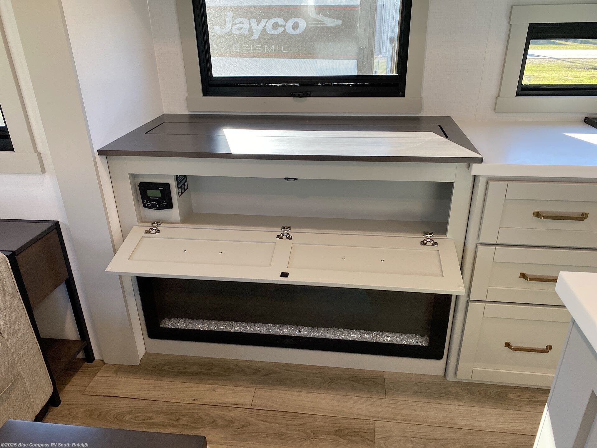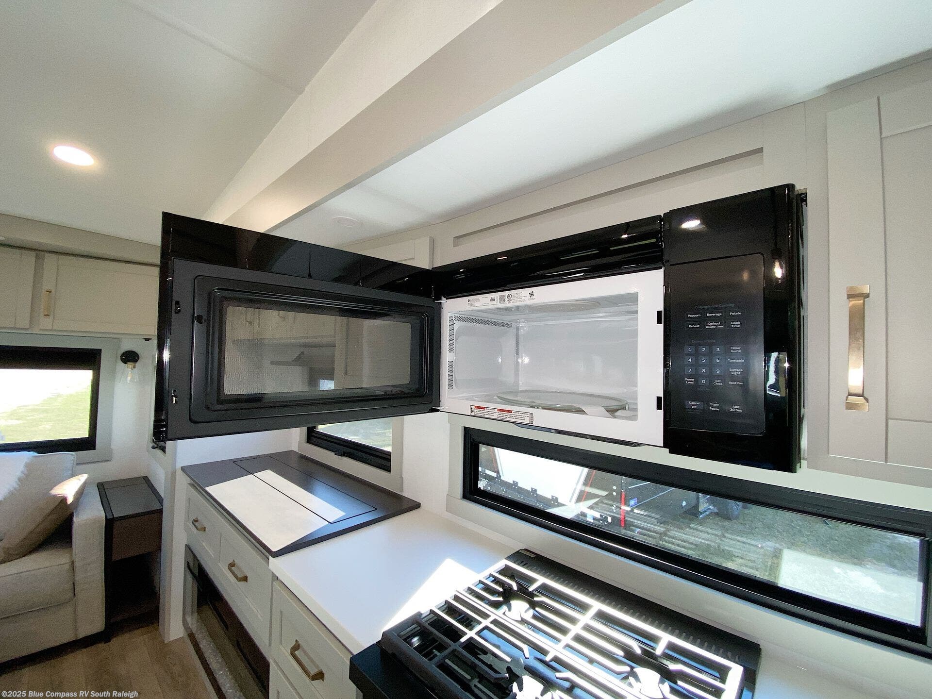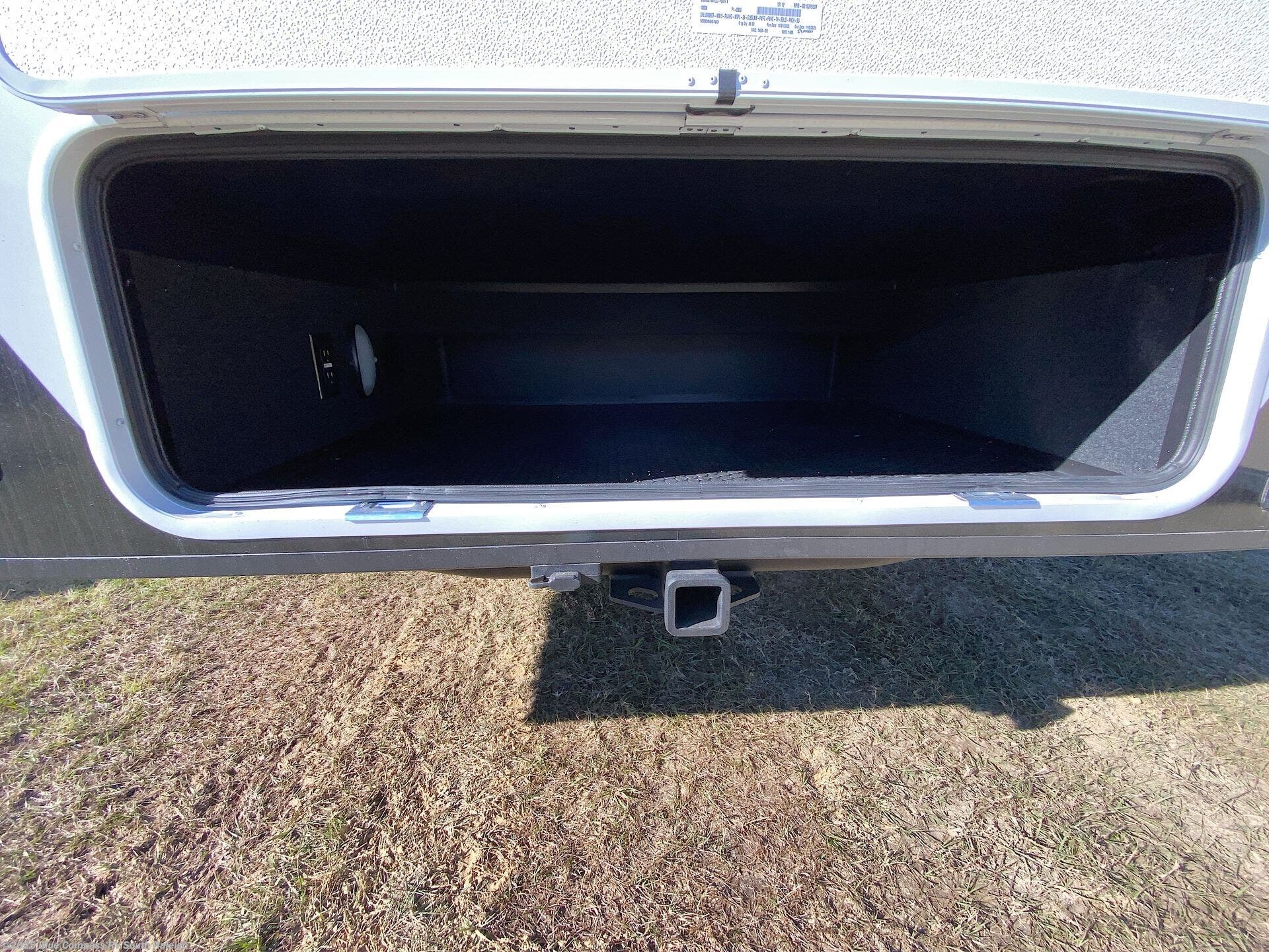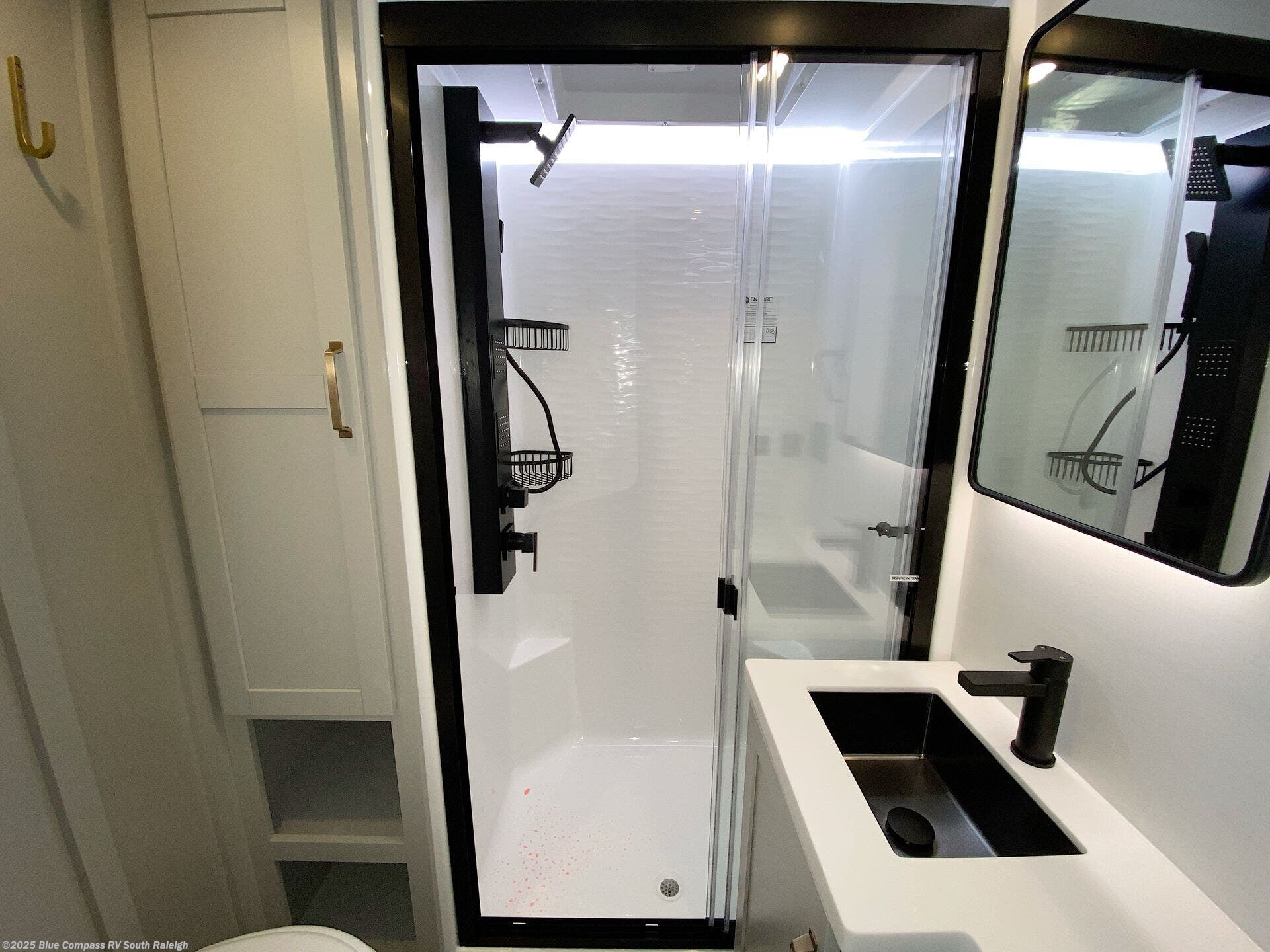 This Model Z luxury fifth wheel is bright and modern on the inside, with loads of amenities that will have you dreaming of your next trip! Enter and find a spacious combined living/kitchen space thanks to dual opposing slides. There is ample seating with a sliding desk/dining table, 62" theater seating, and a 72" tri-fold sofa along the rear wall. You can easily relax and enjoy the 50" Smart telescoping TV with a cozy fireplace below. The kitchen offers all that you need to prepare and cook meals just like home with a 16 cu. ft. refrigerator for your perishables, a 30" microwave oven, and three burner range top and oven. You will love the integrated spice rack, and the kitchen island all outfitted with dog bowls and double pull out trash bins with an integrated Stow 'N Go paper towel holder. There is also an 84" pantry with adjustable shelves for all of your canned and dry goods. Head up the steps to a private master suite with king bed slide. You can opt for the queen bed if you like. A sliding dresser top features hidden storage which is perfect for jewelry and other personal belongings. The front wardrobe features mirrored doors and the corner closet has been prepped for a stackable washer and dryer if you choose to add that option. Relax and enjoy a large bath featuring a linen cabinet, a 30" x 42" shower, and vanity with sink, plus medicine cabinet.