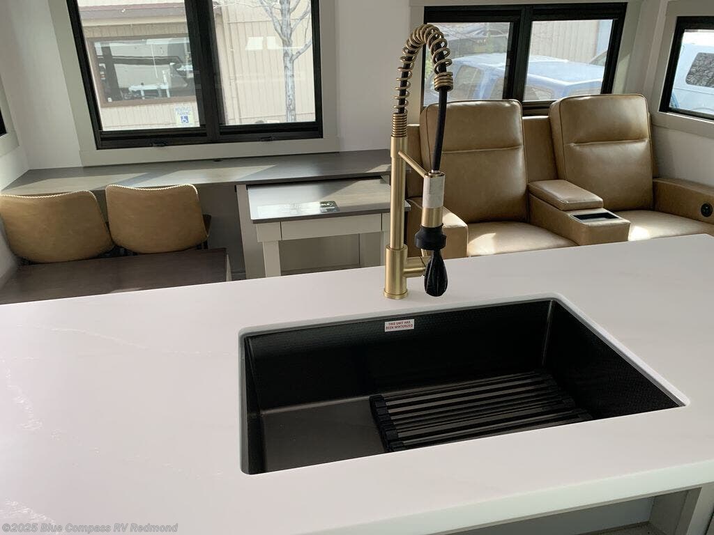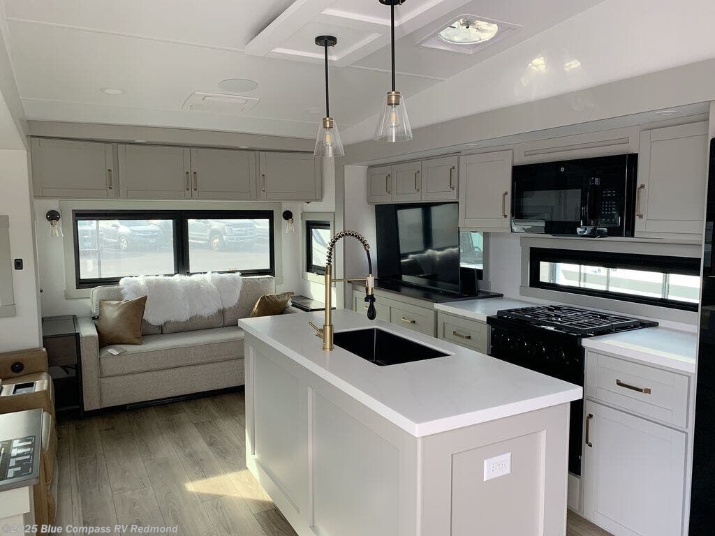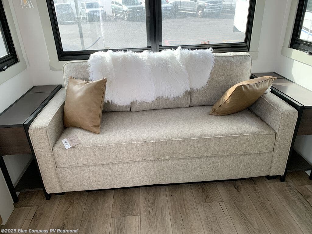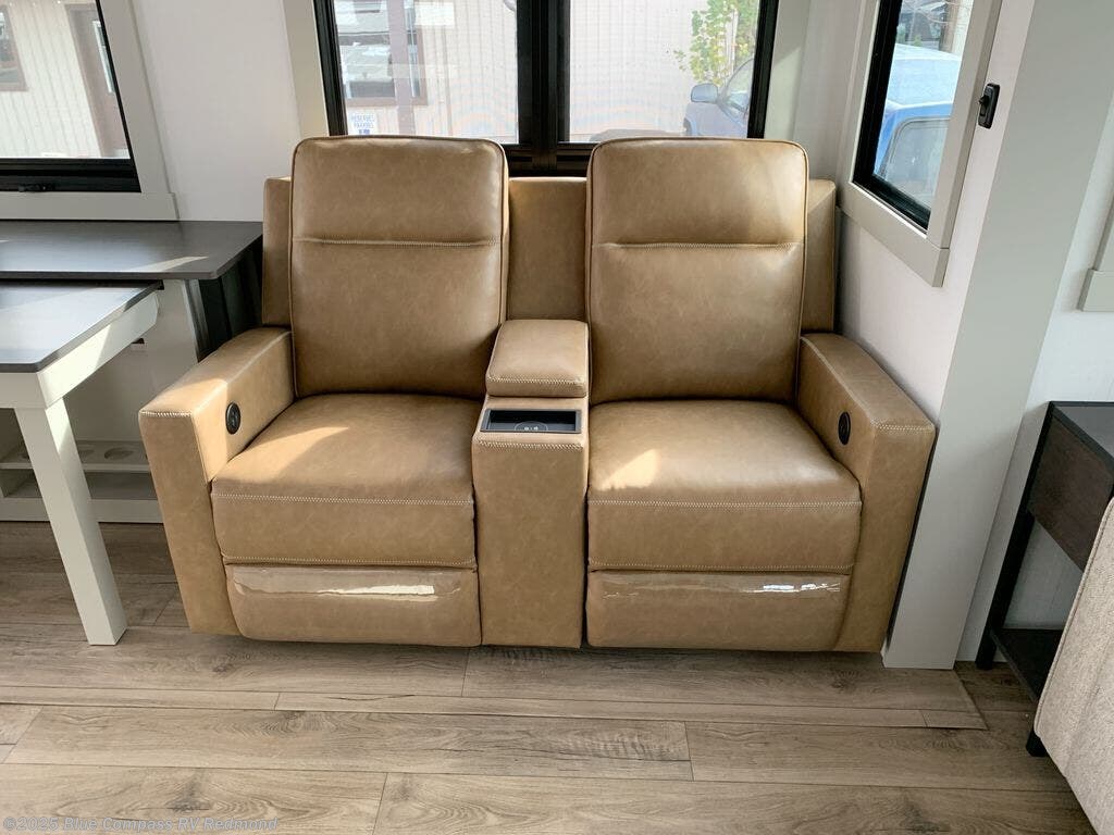 This Model Z luxury fifth wheel is bright and modern on the inside, with loads of amenities that will have you dreaming of your next trip! Enter and find a spacious combined living/kitchen space thanks to dual opposing slides. There is ample seating with a sliding desk/dining table, 62" theater seating, and a 72" tri-fold sofa along the rear wall. You can easily relax and enjoy the 50" Smart telescoping TV with a cozy fireplace below. The kitchen offers all that you need to prepare and cook meals just like home with a 16 cu. ft. refrigerator for your perishables, a 30" microwave oven, and three burner range top and oven. You will love the integrated spice rack, and the kitchen island all outfitted with dog bowls and double pull out trash bins with an integrated Stow 'N Go paper towel holder. There is also an 84" pantry with adjustable shelves for all of your canned and dry goods. Head up the steps to a private master suite with king bed slide. You can opt for the queen bed if you like. A sliding dresser top features hidden storage which is perfect for jewelry and other personal belongings. The front wardrobe features mirrored doors and the corner closet has been prepped for a stackable washer and dryer if you choose to add that option. Relax and enjoy a large bath featuring a linen cabinet, a 30" x 42" shower, and vanity with sink, plus medicine cabinet.