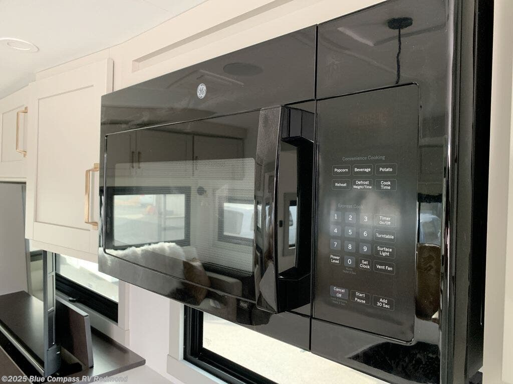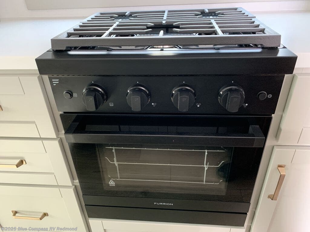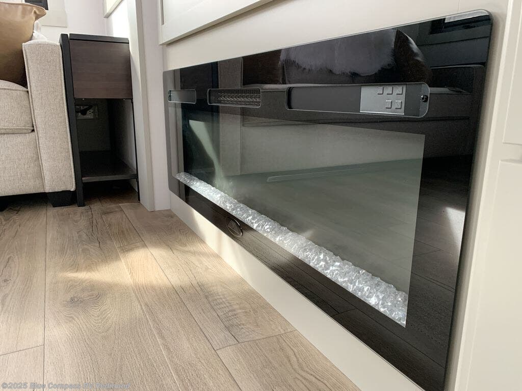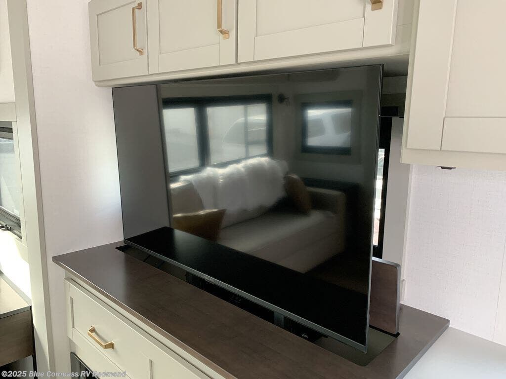 This Model Z luxury fifth wheel is bright and modern on the inside, with loads of amenities that will have you dreaming of your next trip! Enter and find a spacious combined living/kitchen space thanks to dual opposing slides. There is ample seating with a sliding desk/dining table, 62" theater seating, and a 72" tri-fold sofa along the rear wall. You can easily relax and enjoy the 50" Smart telescoping TV with a cozy fireplace below. The kitchen offers all that you need to prepare and cook meals just like home with a 16 cu. ft. refrigerator for your perishables, a 30" microwave oven, and three burner range top and oven. You will love the integrated spice rack, and the kitchen island all outfitted with dog bowls and double pull out trash bins with an integrated Stow 'N Go paper towel holder. There is also an 84" pantry with adjustable shelves for all of your canned and dry goods. Head up the steps to a private master suite with king bed slide. You can opt for the queen bed if you like. A sliding dresser top features hidden storage which is perfect for jewelry and other personal belongings. The front wardrobe features mirrored doors and the corner closet has been prepped for a stackable washer and dryer if you choose to add that option. Relax and enjoy a large bath featuring a linen cabinet, a 30" x 42" shower, and vanity with sink, plus medicine cabinet.
