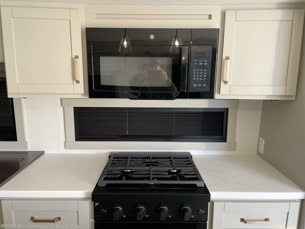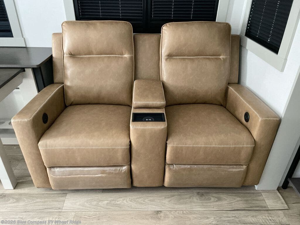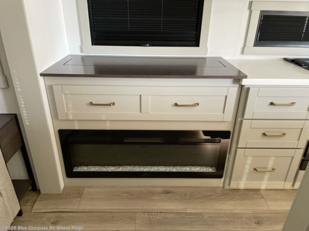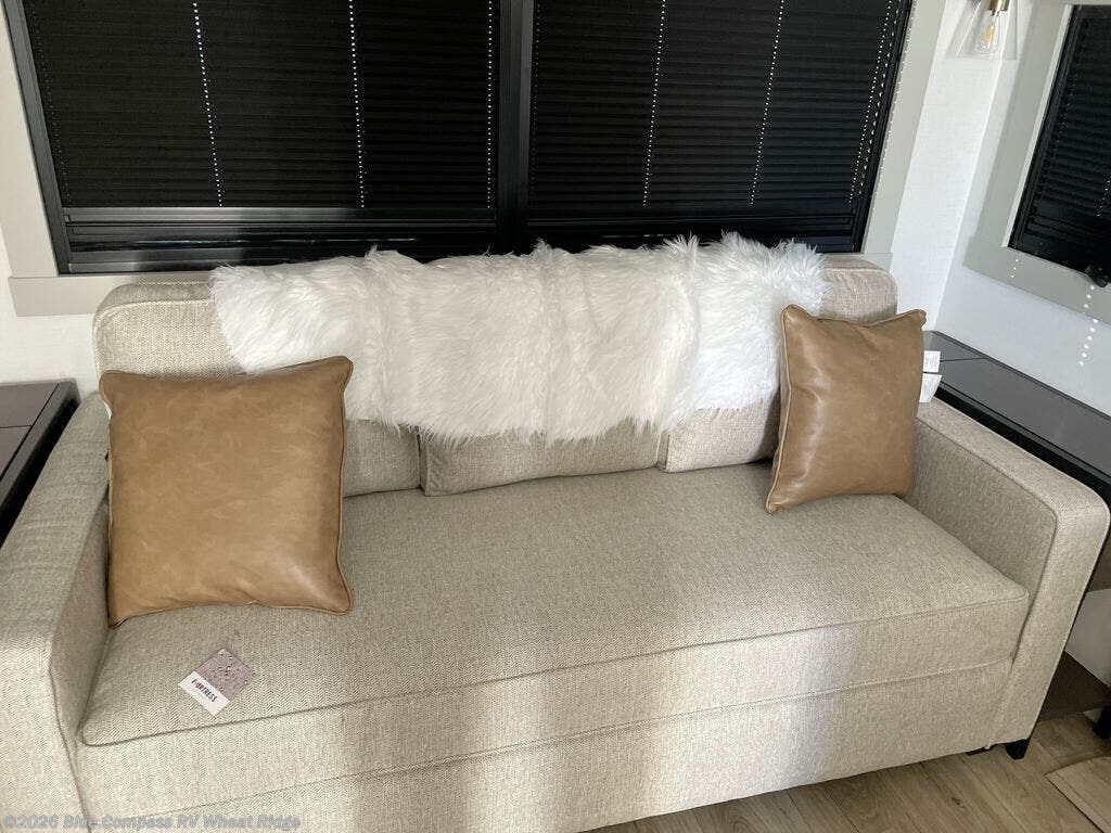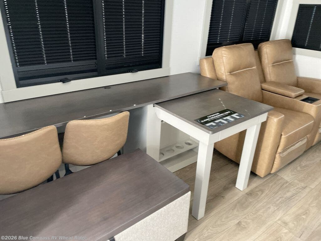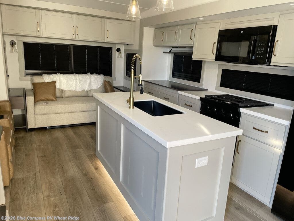 This Model Z luxury fifth wheel is bright and modern on the inside, with loads of amenities that will have you dreaming of your next trip! Enter and find a spacious combined living/kitchen space thanks to dual opposing slides. There is ample seating with a sliding desk/dining table, 62" theater seating, and a 72" tri-fold sofa along the rear wall. You can easily relax and enjoy the 50" Smart telescoping TV with a cozy fireplace below. The kitchen offers all that you need to prepare and cook meals just like home with a 16 cu. ft. refrigerator for your perishables, a 30" microwave oven, and three burner range top and oven. You will love the integrated spice rack, and the kitchen island all outfitted with dog bowls and double pull out trash bins with an integrated Stow 'N Go paper towel holder. There is also an 84" pantry with adjustable shelves for all of your canned and dry goods. Head up the steps to a private master suite with king bed slide. You can opt for the queen bed if you like. A sliding dresser top features hidden storage which is perfect for jewelry and other personal belongings. The front wardrobe features mirrored doors and the corner closet has been prepped for a stackable washer and dryer if you choose to add that option. Relax and enjoy a large bath featuring a linen cabinet, a 30" x 42" shower, and vanity with sink, plus medicine cabinet.