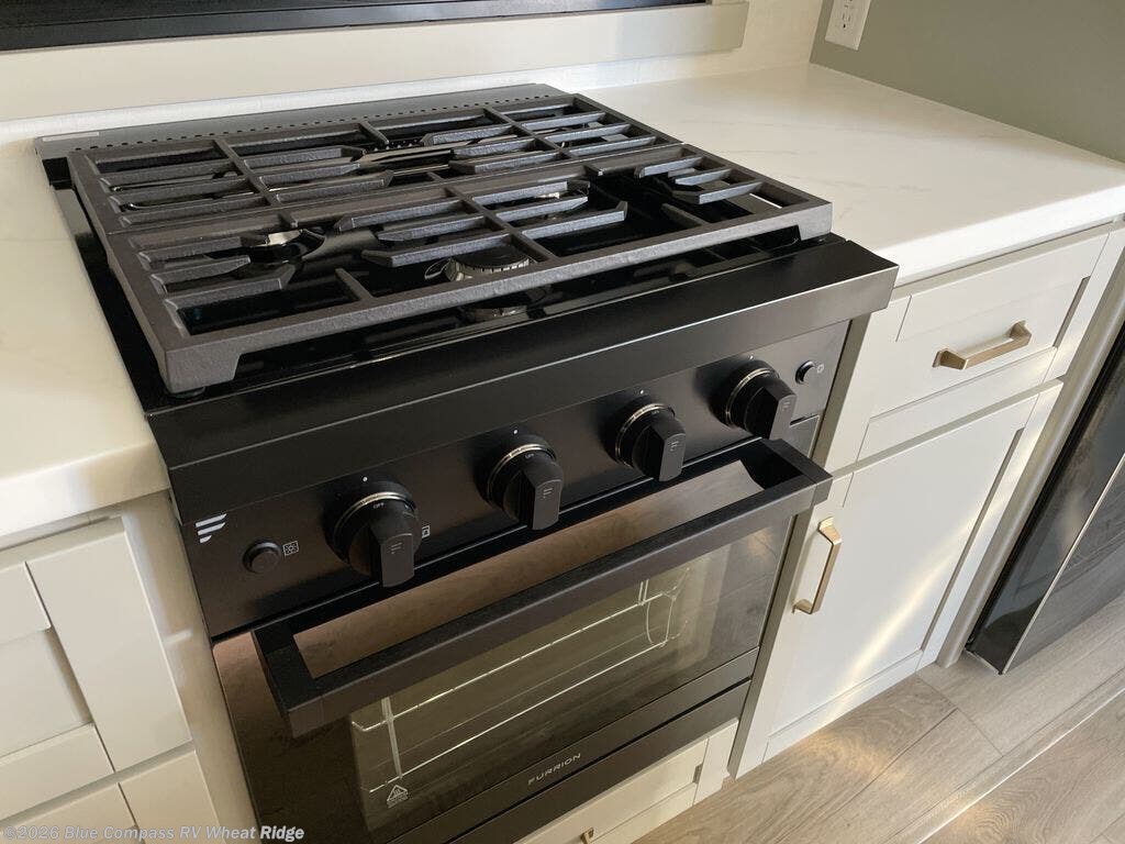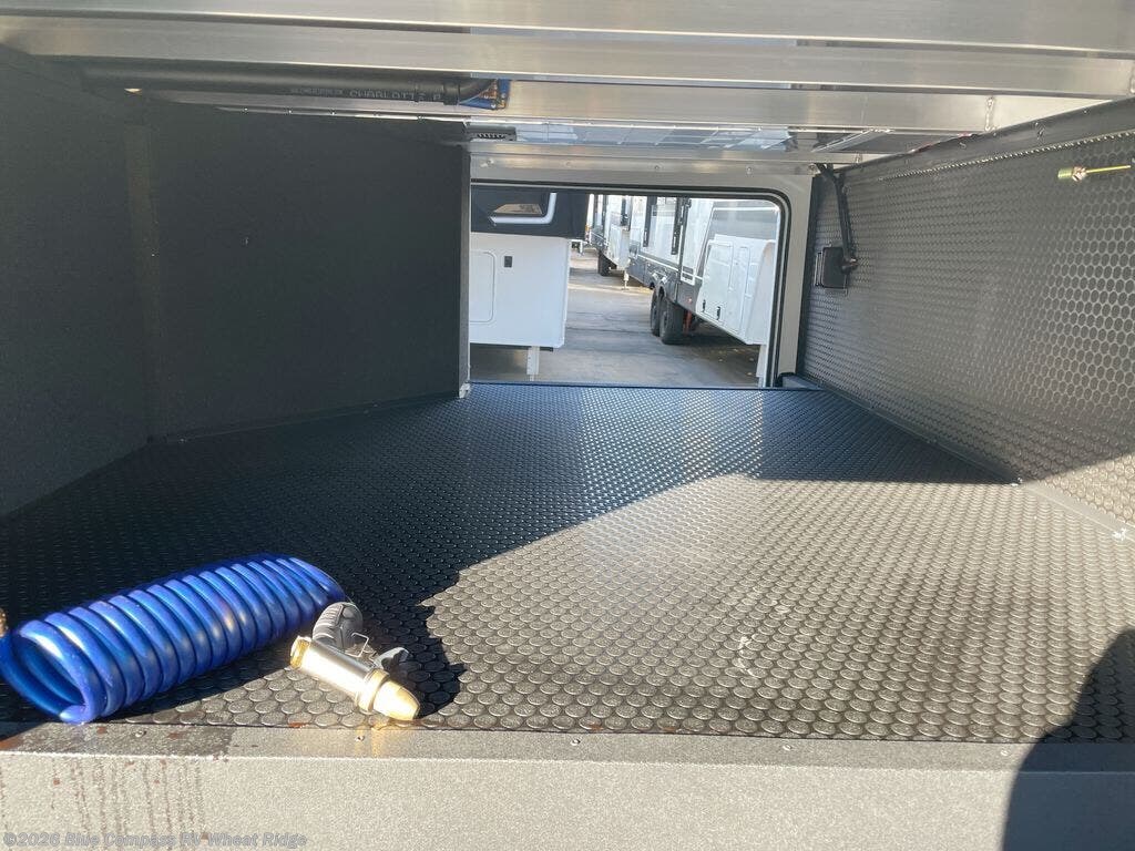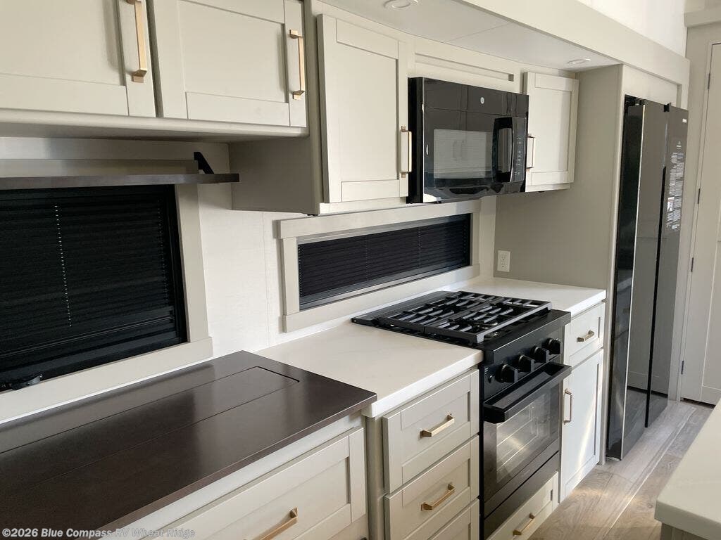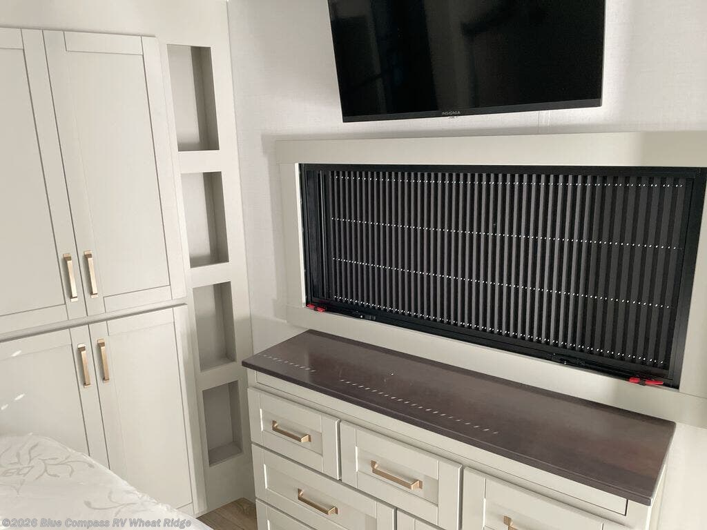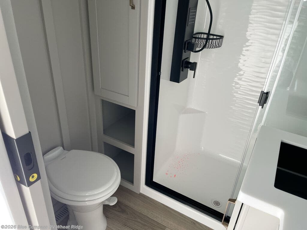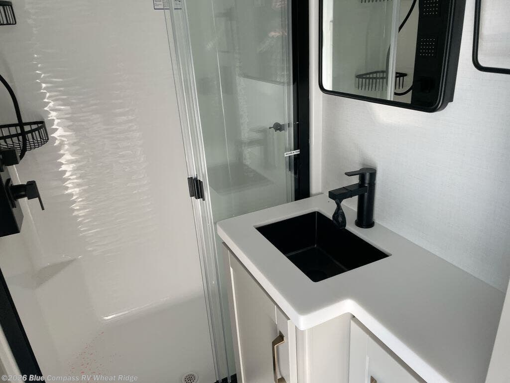 This Model Z luxury fifth wheel is bright and modern on the inside, with loads of amenities that will have you dreaming of your next trip! Enter and find a spacious combined living/kitchen space thanks to dual opposing slides. There is ample seating with a sliding desk/dining table, 62" theater seating, and a 72" tri-fold sofa along the rear wall. You can easily relax and enjoy the 50" Smart telescoping TV with a cozy fireplace below. The kitchen offers all that you need to prepare and cook meals just like home with a 16 cu. ft. refrigerator for your perishables, a 30" microwave oven, and three burner range top and oven. You will love the integrated spice rack, and the kitchen island all outfitted with dog bowls and double pull out trash bins with an integrated Stow 'N Go paper towel holder. There is also an 84" pantry with adjustable shelves for all of your canned and dry goods. Head up the steps to a private master suite with king bed slide. You can opt for the queen bed if you like. A sliding dresser top features hidden storage which is perfect for jewelry and other personal belongings. The front wardrobe features mirrored doors and the corner closet has been prepped for a stackable washer and dryer if you choose to add that option. Relax and enjoy a large bath featuring a linen cabinet, a 30" x 42" shower, and vanity with sink, plus medicine cabinet.
