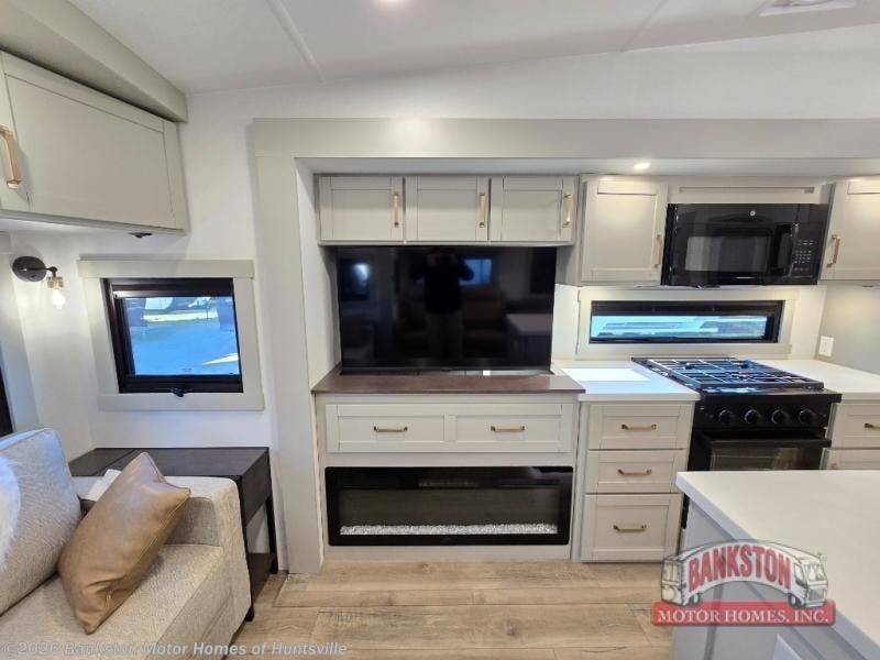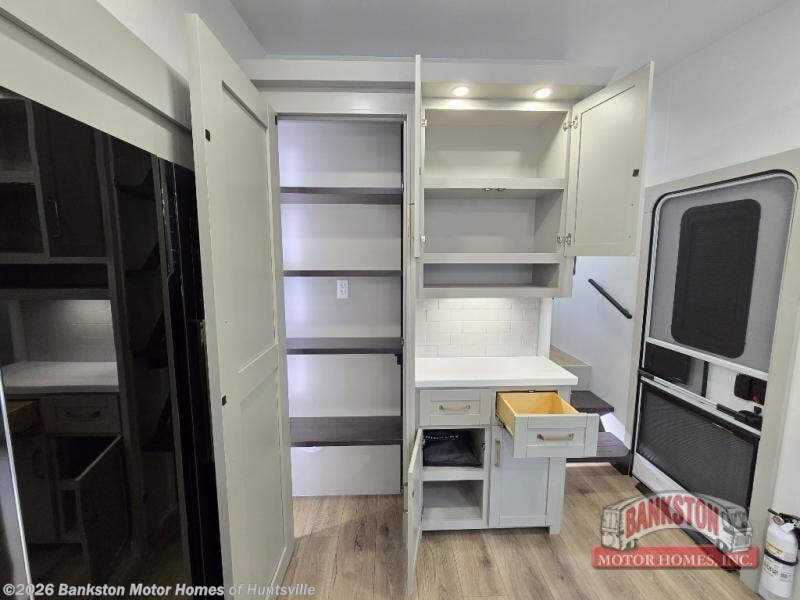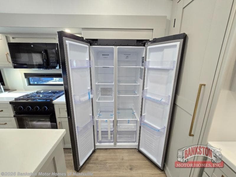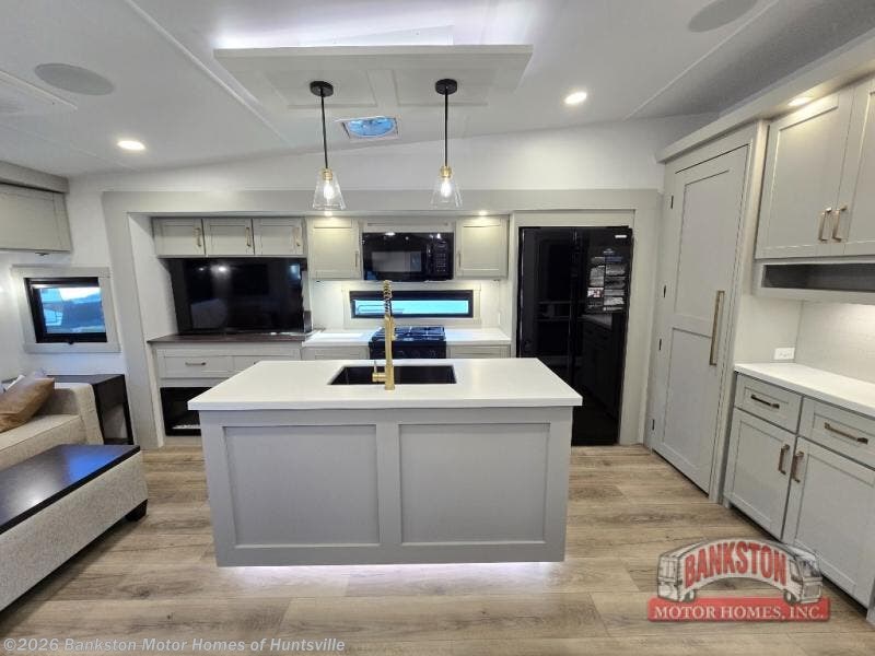 This Model Z luxury fifth wheel is bright and modern on the inside, with loads of amenities that will have you dreaming of your next trip! Enter and find a spacious combined living/kitchen space thanks to dual opposing slides. There is ample seating with a sliding desk/dining table, 62" theater seating, and a 72" tri-fold sofa along the rear wall. You can easily relax and enjoy the 50" Smart telescoping TV with a cozy fireplace below. The kitchen offers all that you need to prepare and cook meals just like home with a 16 cu. ft. refrigerator for your perishables, a 30" microwave oven, and three burner range top and oven. You will love the integrated spice rack, and the kitchen island all outfitted with dog bowls and double pull out trash bins with an integrated Stow 'N Go paper towel holder. There is also an 84" pantry with adjustable shelves for all of your canned and dry goods. Head up the steps to a private master suite with king bed slide. You can opt for the queen bed if you like. A sliding dresser top features hidden storage which is perfect for jewelry and other personal belongings. The front wardrobe features mirrored doors and the corner closet has been prepped for a stackable washer and dryer if you choose to add that option. Relax and enjoy a large bath featuring a linen cabinet, a 30" x 42" shower, and vanity with sink, plus medicine cabinet.