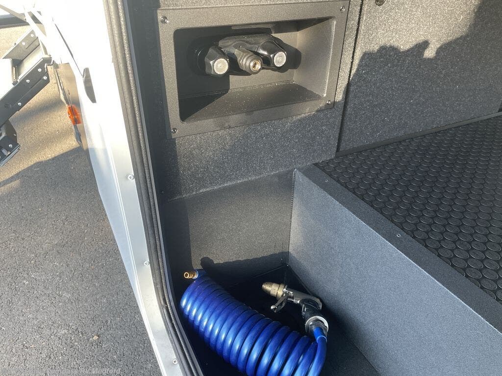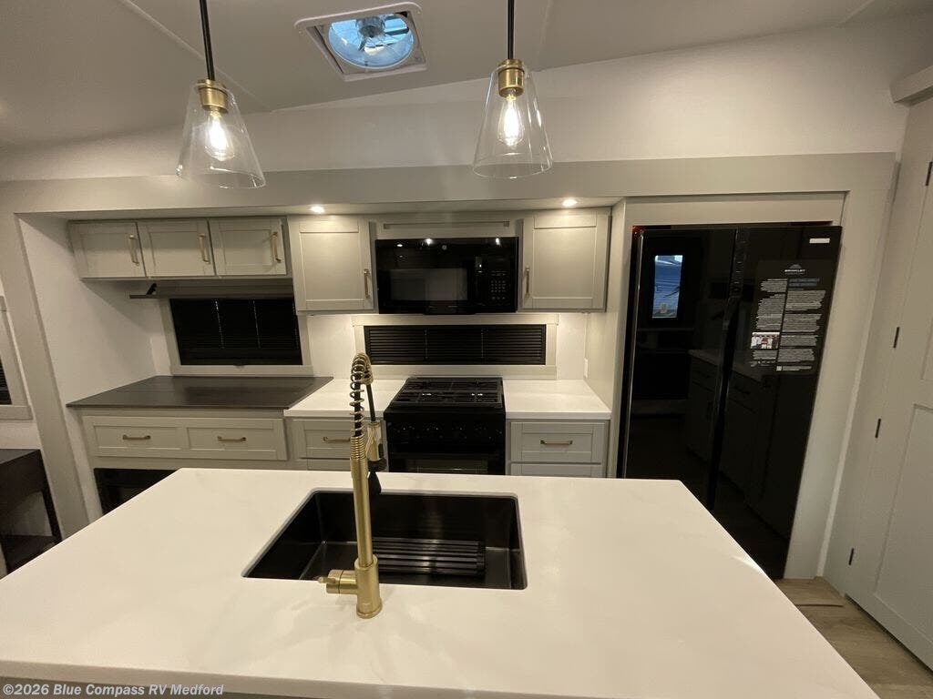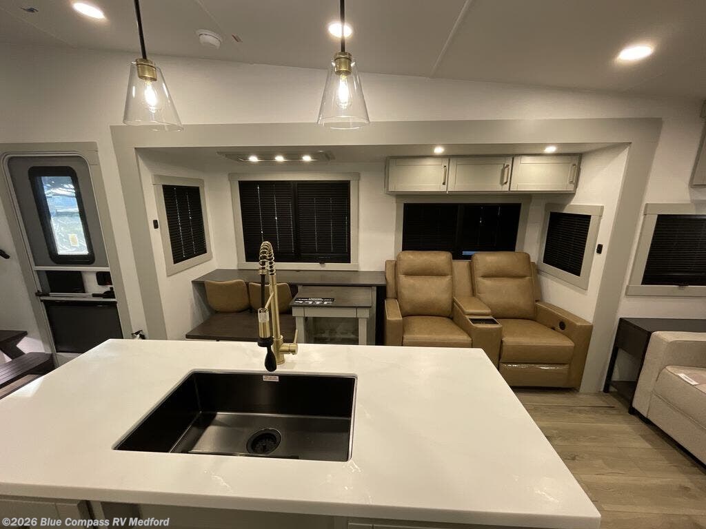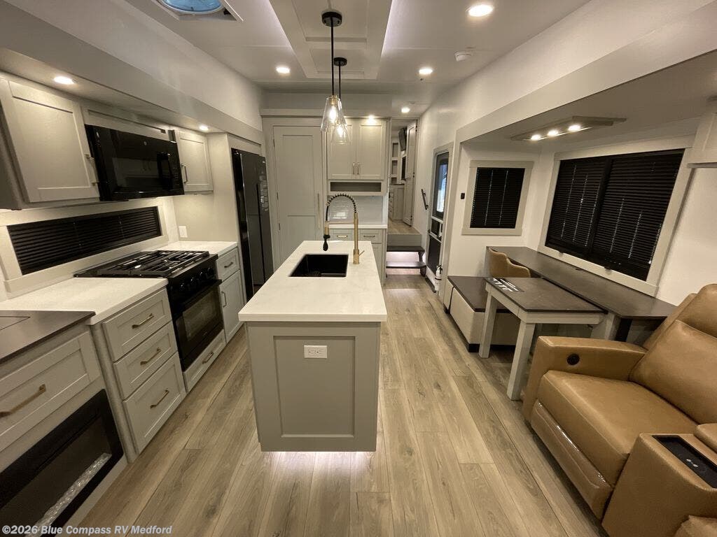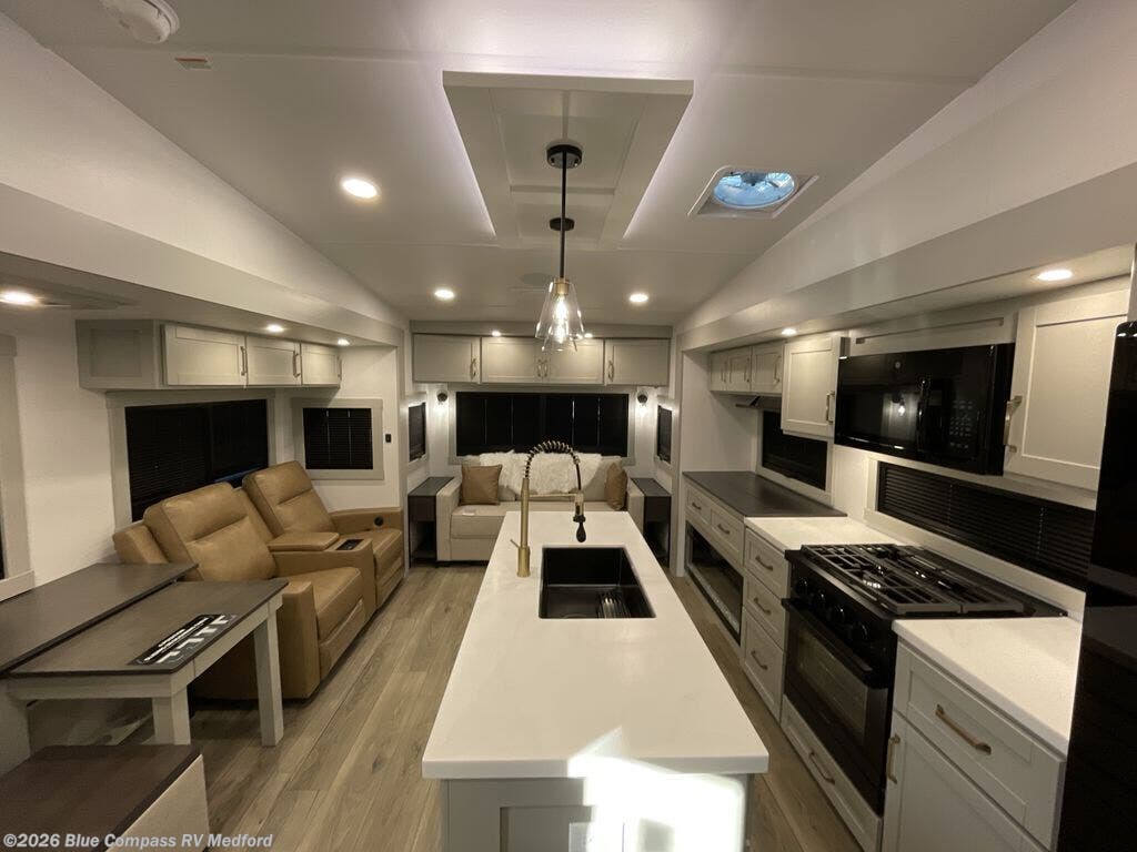 This Model Z luxury fifth wheel is bright and modern on the inside, with loads of amenities that will have you dreaming of your next trip! Enter and find a spacious combined living/kitchen space thanks to dual opposing slides. There is ample seating with a sliding desk/dining table, 62" theater seating, and a 72" tri-fold sofa along the rear wall. You can easily relax and enjoy the 50" Smart telescoping TV with a cozy fireplace below. The kitchen offers all that you need to prepare and cook meals just like home with a 16 cu. ft. refrigerator for your perishables, a 30" microwave oven, and three burner range top and oven. You will love the integrated spice rack, and the kitchen island all outfitted with dog bowls and double pull out trash bins with an integrated Stow 'N Go paper towel holder. There is also an 84" pantry with adjustable shelves for all of your canned and dry goods. Head up the steps to a private master suite with king bed slide. You can opt for the queen bed if you like. A sliding dresser top features hidden storage which is perfect for jewelry and other personal belongings. The front wardrobe features mirrored doors and the corner closet has been prepped for a stackable washer and dryer if you choose to add that option. Relax and enjoy a large bath featuring a linen cabinet, a 30" x 42" shower, and vanity with sink, plus medicine cabinet.