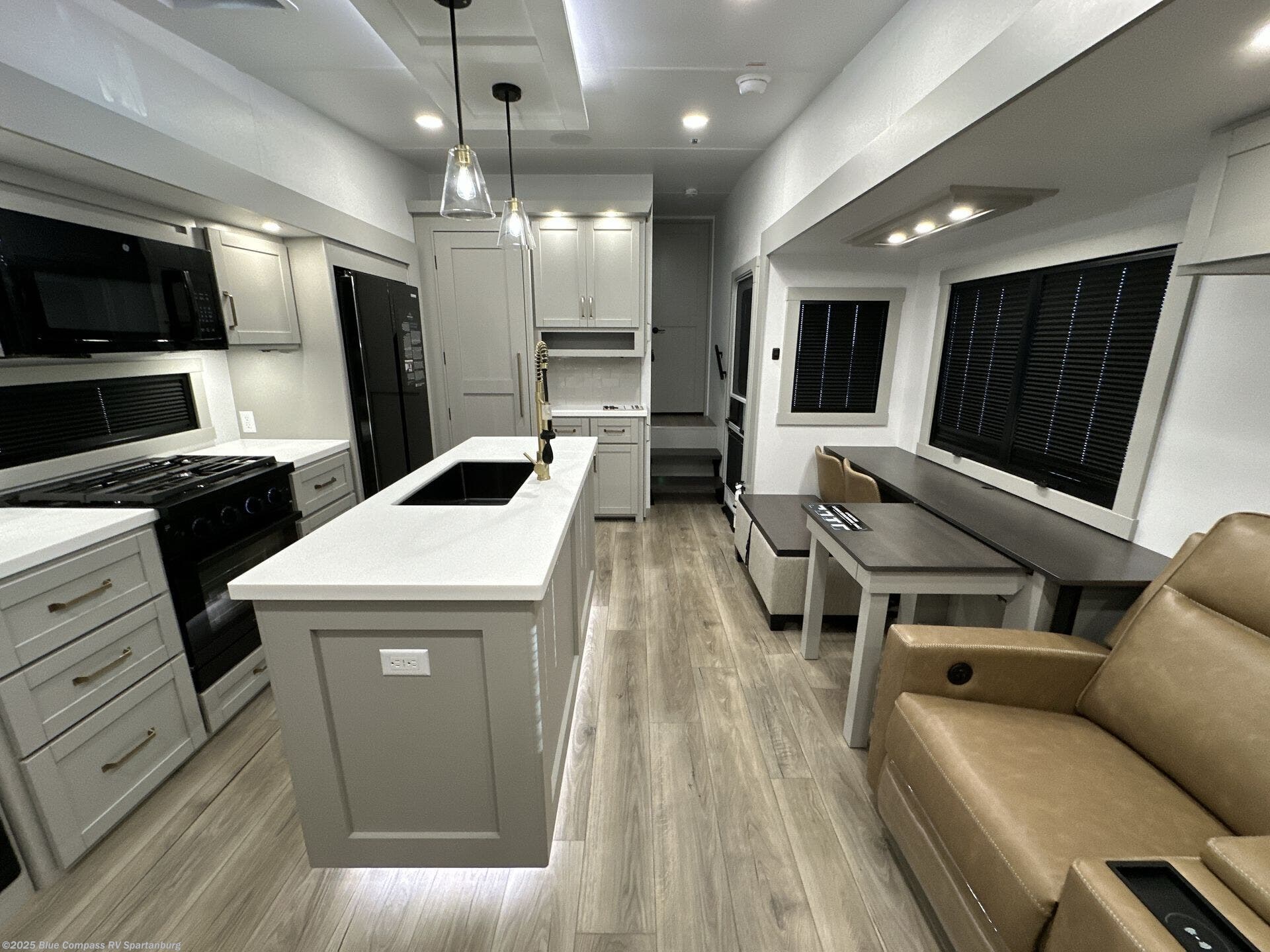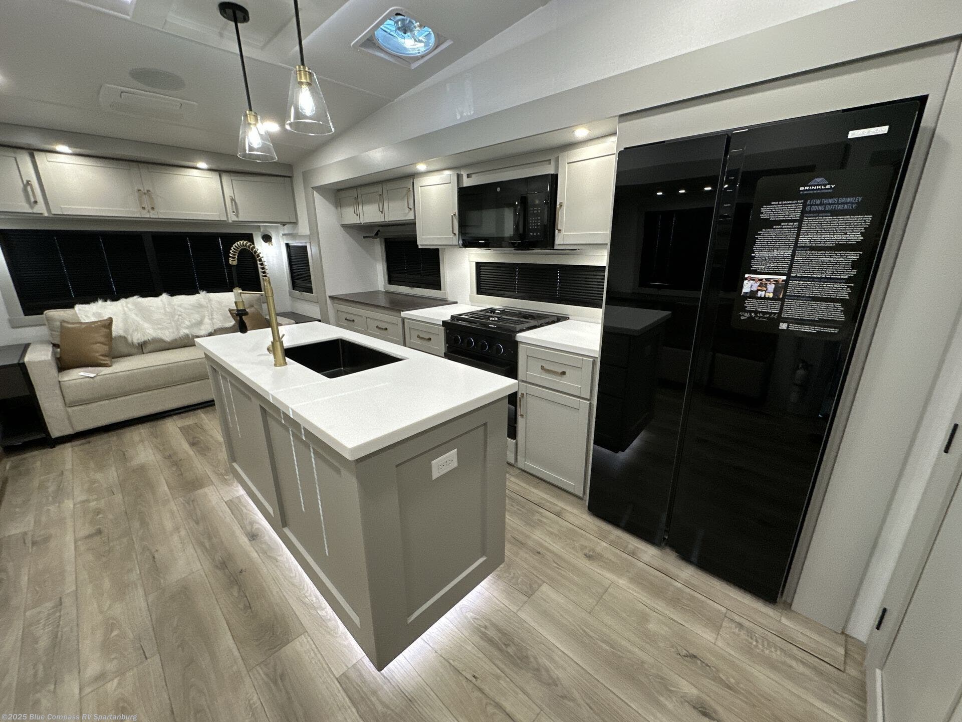 The Brinkley mid-profile Model Z fifth wheels bring you clean lines and an upscale look with plenty of style and exciting new features like the industry first brass plumbing connections. These units also feature an automotive grade front cap, plenty of exterior storage, dual exterior hot and cold showers, and wide stance leveling jacks for easy set up. Residential frameless windows provide a clean look and beautiful views, and ample electrical outlets and 6 USB/USB-C outlets allow all of your electronics and appliances to easily be used and charged.