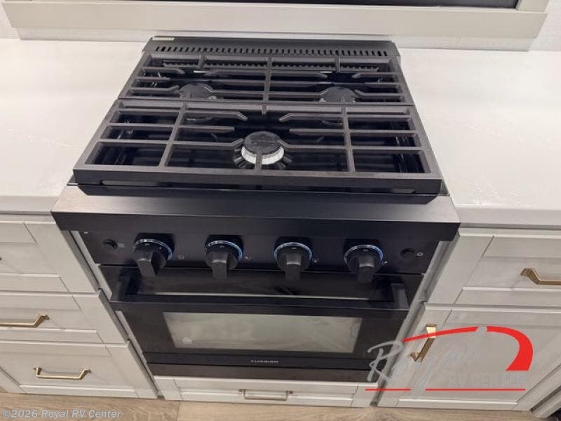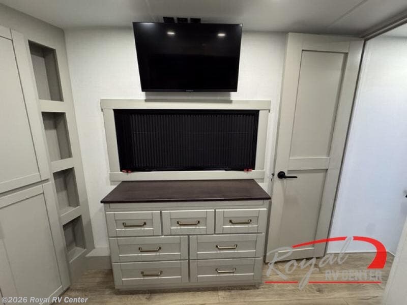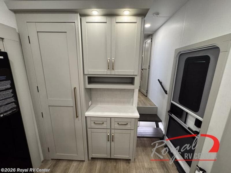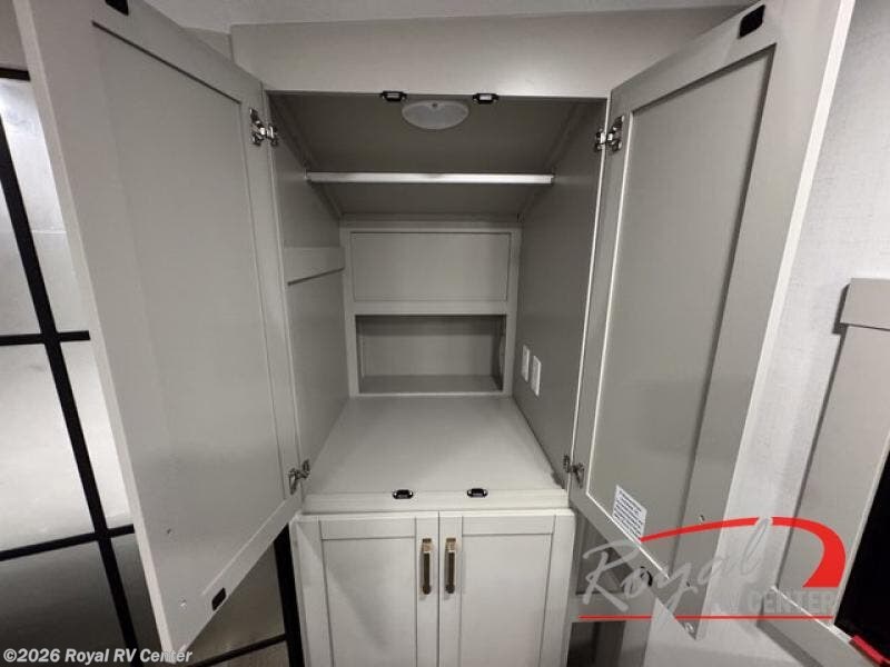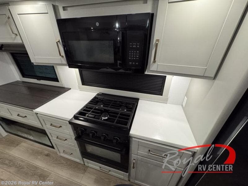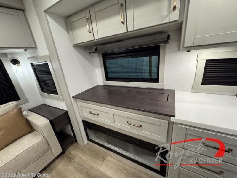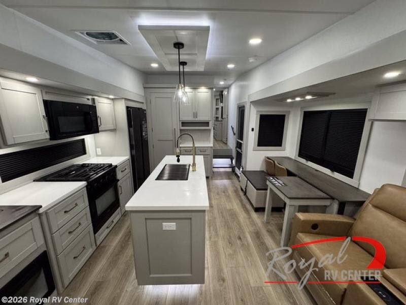 This Model Z luxury fifth wheel is bright and modern on the inside, with loads of amenities that will have you dreaming of your next trip! Enter and find a spacious combined living/kitchen space thanks to dual opposing slides. There is ample seating with a sliding desk/dining table, 62" theater seating, and a 72" tri-fold sofa along the rear wall. You can easily relax and enjoy the 50" Smart telescoping TV with a cozy fireplace below. The kitchen offers all that you need to prepare and cook meals just like home with a 16 cu. ft. refrigerator for your perishables, a 30" microwave oven, and three burner range top and oven. You will love the integrated spice rack, and the kitchen island all outfitted with dog bowls and double pull out trash bins with an integrated Stow 'N Go paper towel holder. There is also an 84" pantry with adjustable shelves for all of your canned and dry goods. Head up the steps to a private master suite with king bed slide. You can opt for the queen bed if you like. A sliding dresser top features hidden storage which is perfect for jewelry and other personal belongings. The front wardrobe features mirrored doors and the corner closet has been prepped for a stackable washer and dryer if you choose to add that option. Relax and enjoy a large bath featuring a linen cabinet, a 30" x 42" shower, and vanity with sink, plus medicine cabinet.
