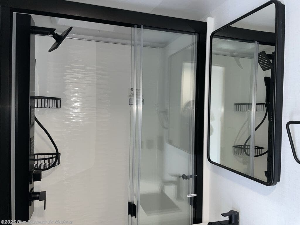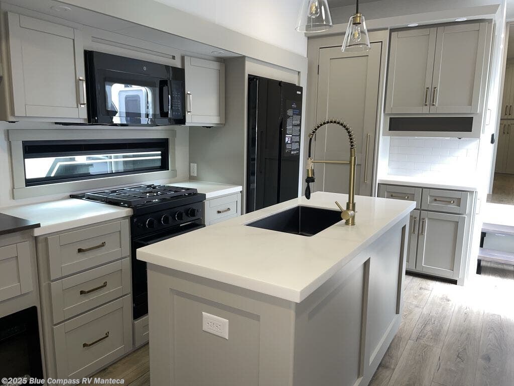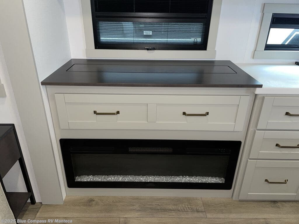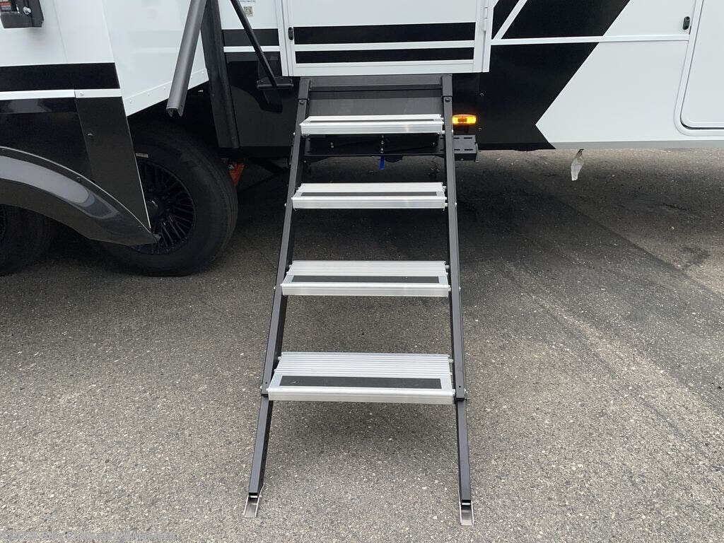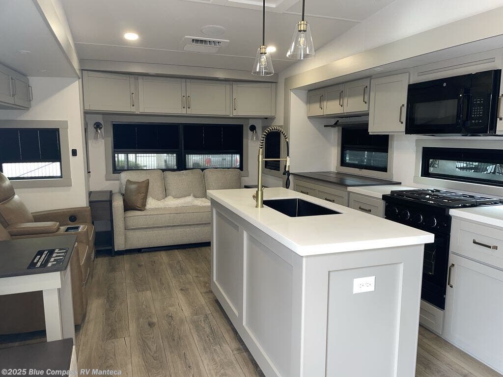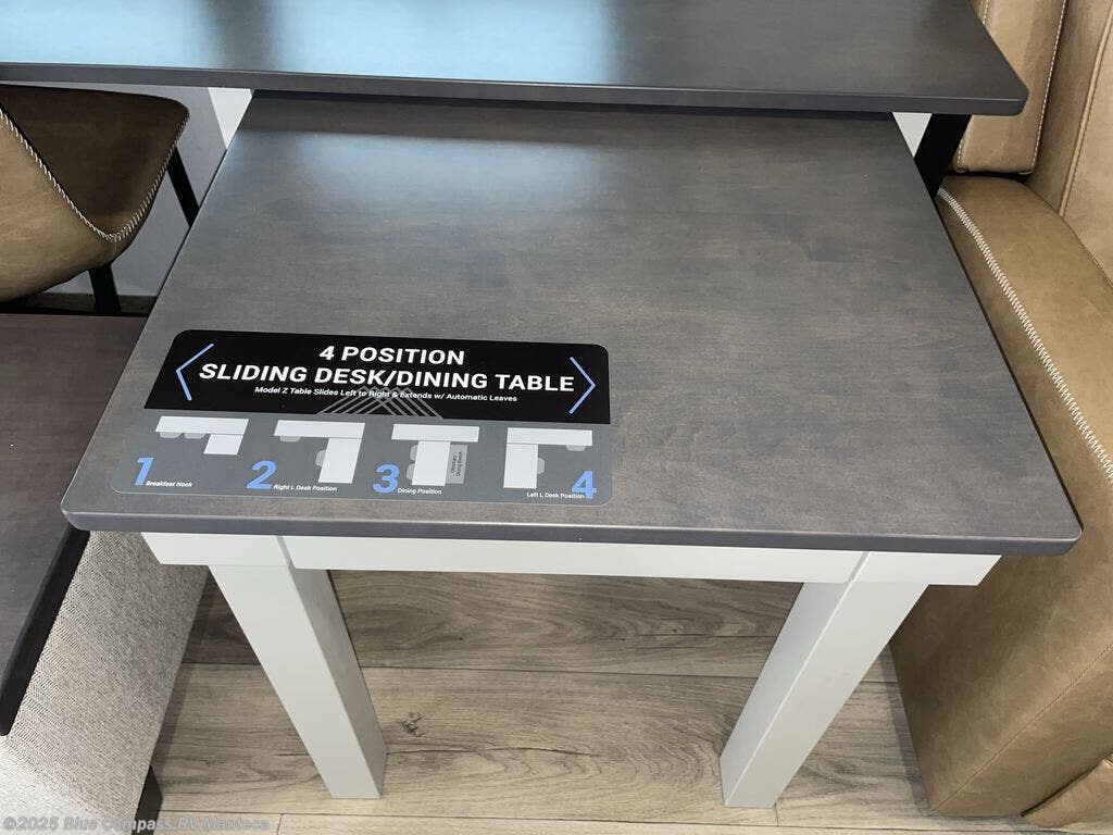 This Model Z luxury fifth wheel is bright and modern on the inside, with loads of amenities that will have you dreaming of your next trip! Enter and find a spacious combined living/kitchen space thanks to dual opposing slides. There is ample seating with a sliding desk/dining table, 62" theater seating, and a 72" tri-fold sofa along the rear wall. You can easily relax and enjoy the 50" Smart telescoping TV with a cozy fireplace below. The kitchen offers all that you need to prepare and cook meals just like home with a 16 cu. ft. refrigerator for your perishables, a 30" microwave oven, and three burner range top and oven. You will love the integrated spice rack, and the kitchen island all outfitted with dog bowls and double pull out trash bins with an integrated Stow 'N Go paper towel holder. There is also an 84" pantry with adjustable shelves for all of your canned and dry goods. Head up the steps to a private master suite with king bed slide. You can opt for the queen bed if you like. A sliding dresser top features hidden storage which is perfect for jewelry and other personal belongings. The front wardrobe features mirrored doors and the corner closet has been prepped for a stackable washer and dryer if you choose to add that option. Relax and enjoy a large bath featuring a linen cabinet, a 30" x 42" shower, and vanity with sink, plus medicine cabinet.